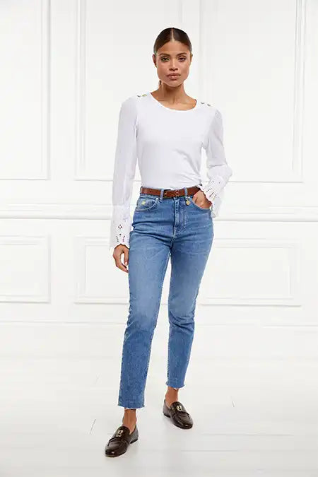 side view of Crew neck top with voluminous sleeves with gathered details at the shoulder and broderie detailing above the cuff and detailed with Holland Cooper rivets on the shoulders