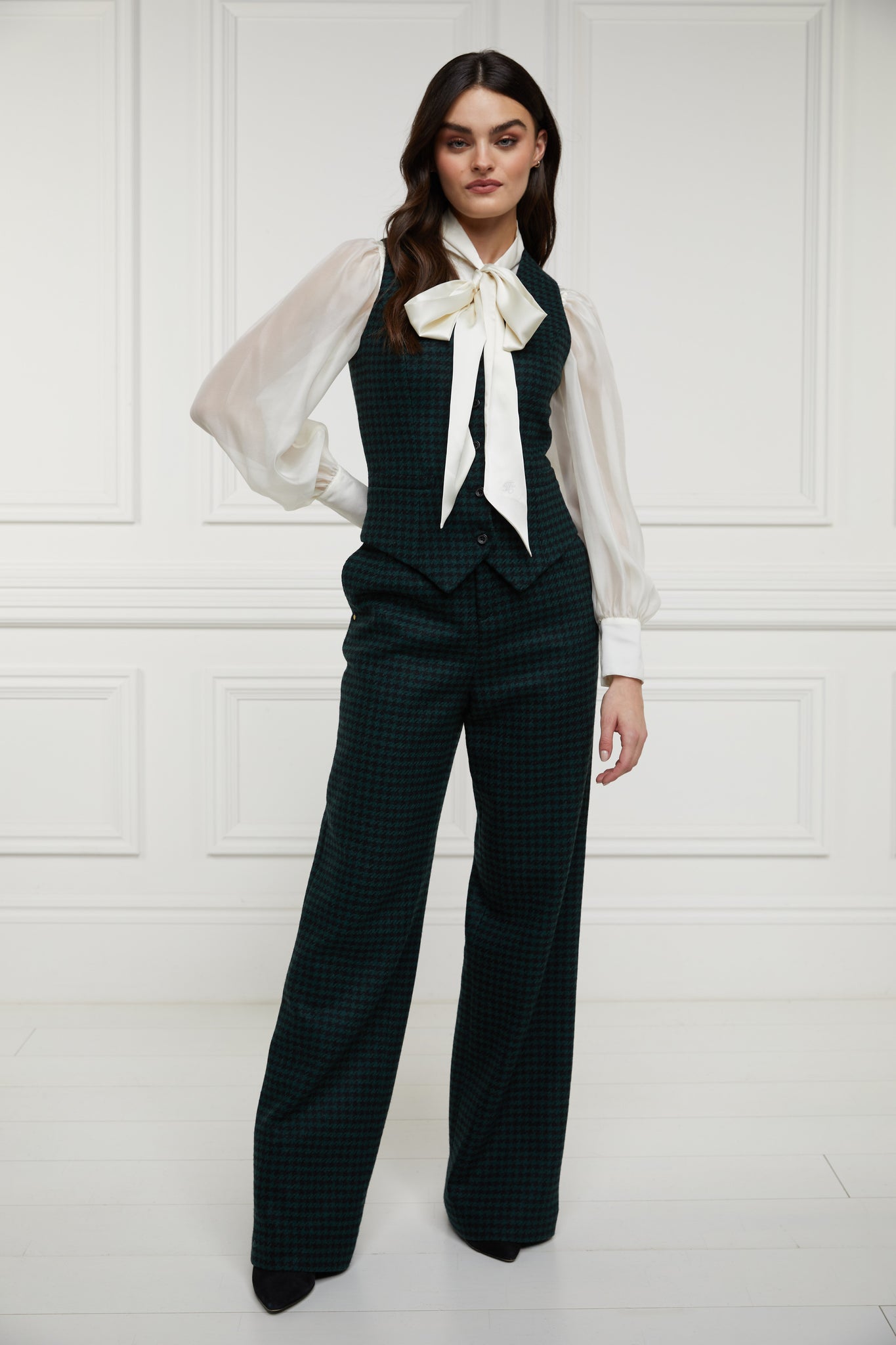 Both classic and refined, this waistcoat offers a slim tailored fit with a skimming v-neckline and elegantly shaped hem. A classic wardrobe staple with traditional suiting details, neat welted pockets, satin lining and a darted front, the back adjuster allows for a personalised fit. Subtly detailed with HC horn buttons. Looks great simply paired with matching trousers, as a layering piece, or as part of a 3 piece suit. Proudly hand cut and made in England using wools woven in the UK.