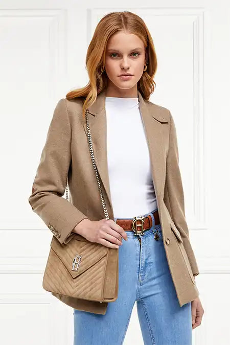 This capped sleeve bodysuit is a timeless classic. It gives you a sculpted tucked in look with a high neckline and light padding on the shoulder, featuring our signature HC gold hardware. Designed with a second skin feel, this soft stretch bodysuit has a flattering thong brief that will remain undetectable beneath close fitting tailoring or skirts. -