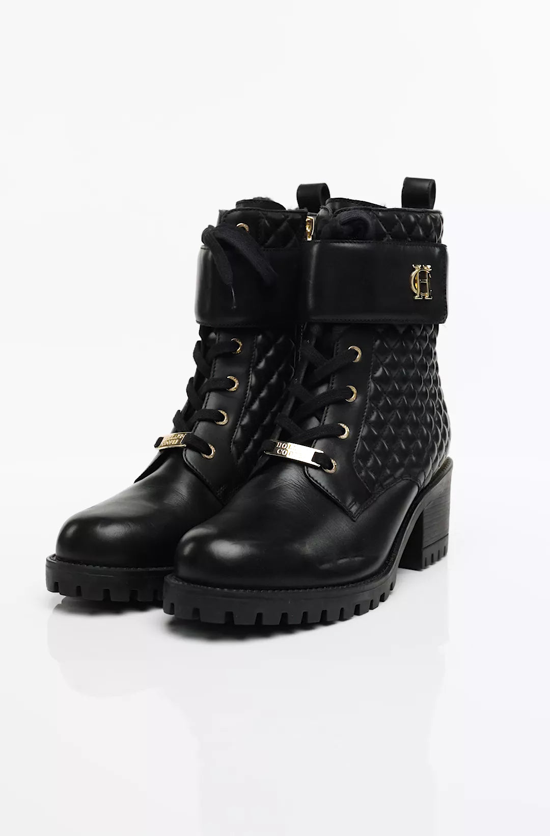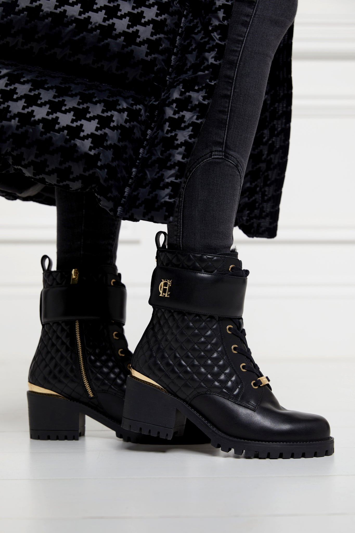Introducing the new high version of our bestselling Biker Boot, elevated for style and comfort. This heeled design features a comfortable mid-heel and a robust cleated outsole for enhanced traction. The quilted body adds a touch of sophistication, while the padded Velcro ankle strap ensures a secure fit. Finished with iconic gold hardware, the Heeled Biker Boot combines edgy style with refined details, making it a standout choice for any wardrobe.