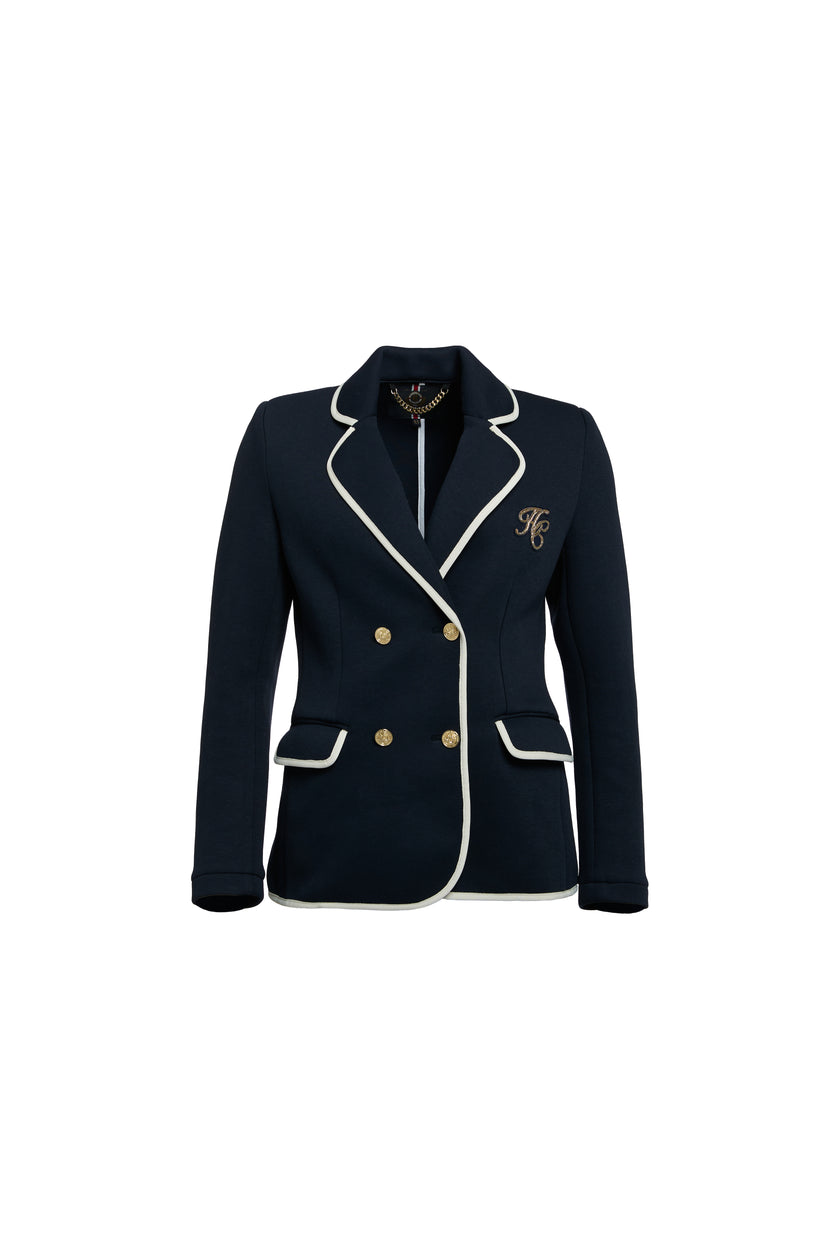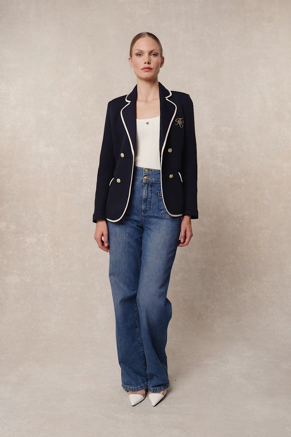 Designed with a tailored silhouette, the double breasted Henley Blazer has been designed with an elegantly slim fit and vintage-inspired aesthetic. Created from a heavyweight knitted shell fabric, this blazer has been beautifully characterised by our iconic handmade HC badge on the chest pocket. With an elegant four-button closure, the traditional piping adds a preppy and chic touch. Detailed with patch pockets and buttoned cuffs.