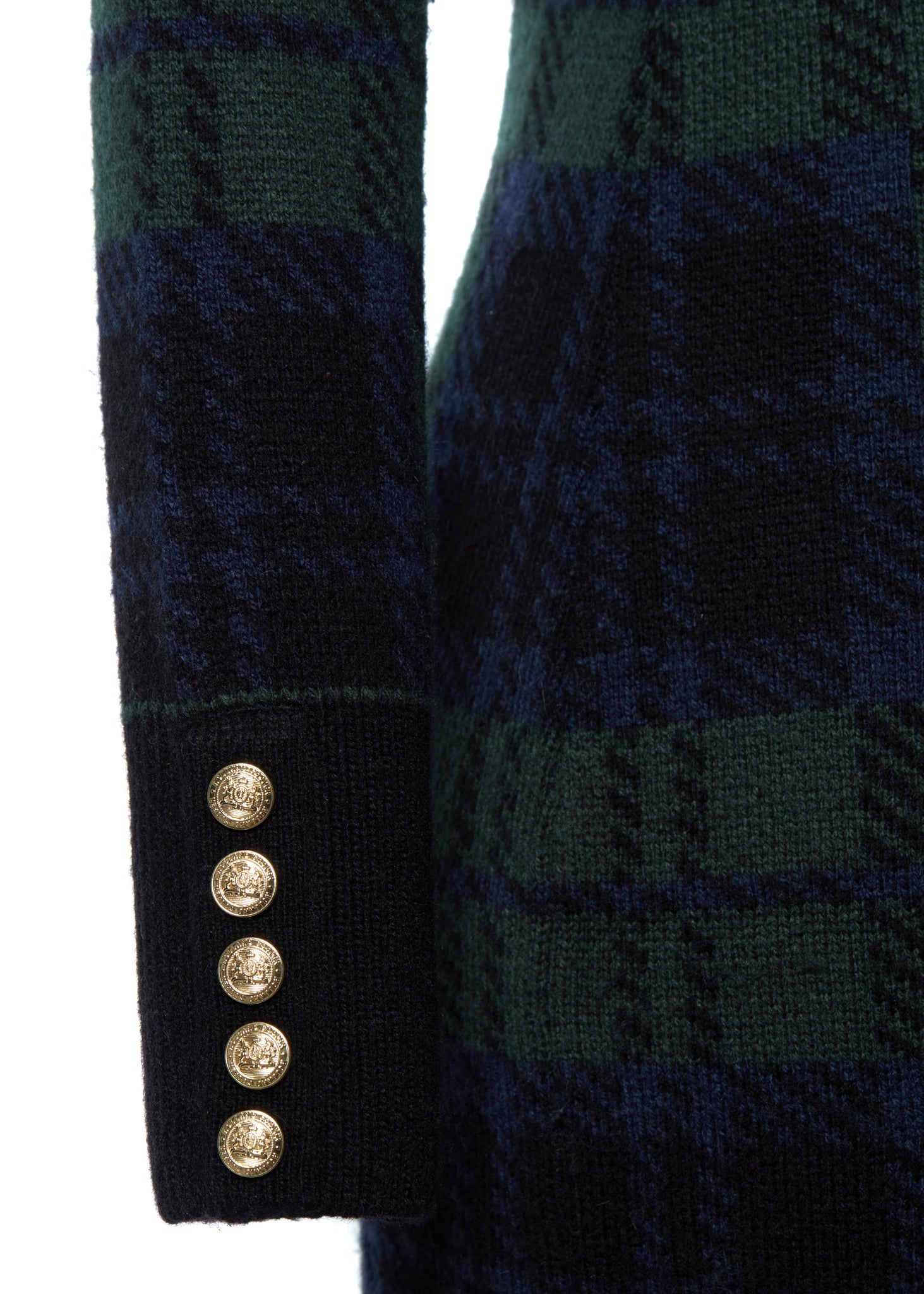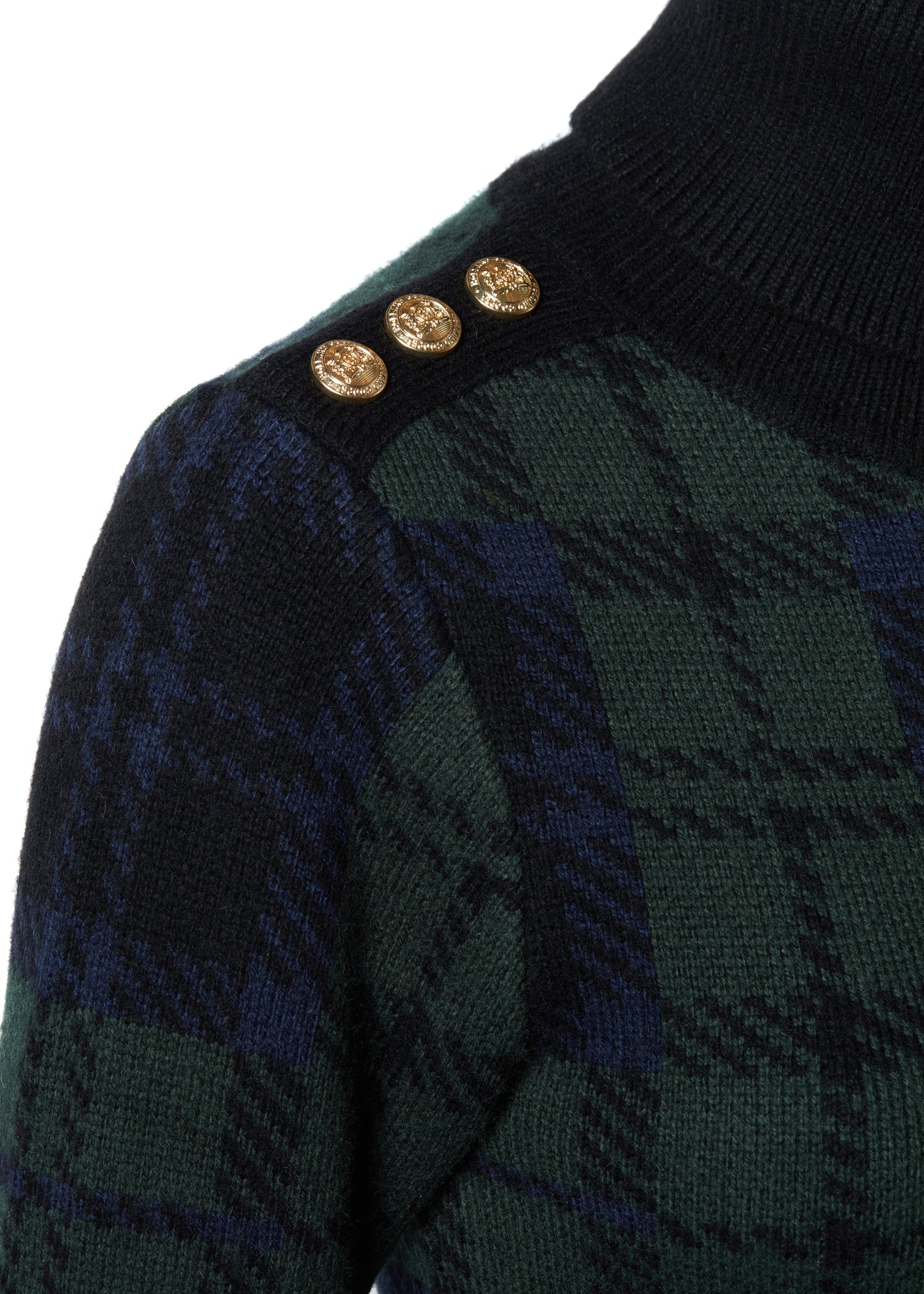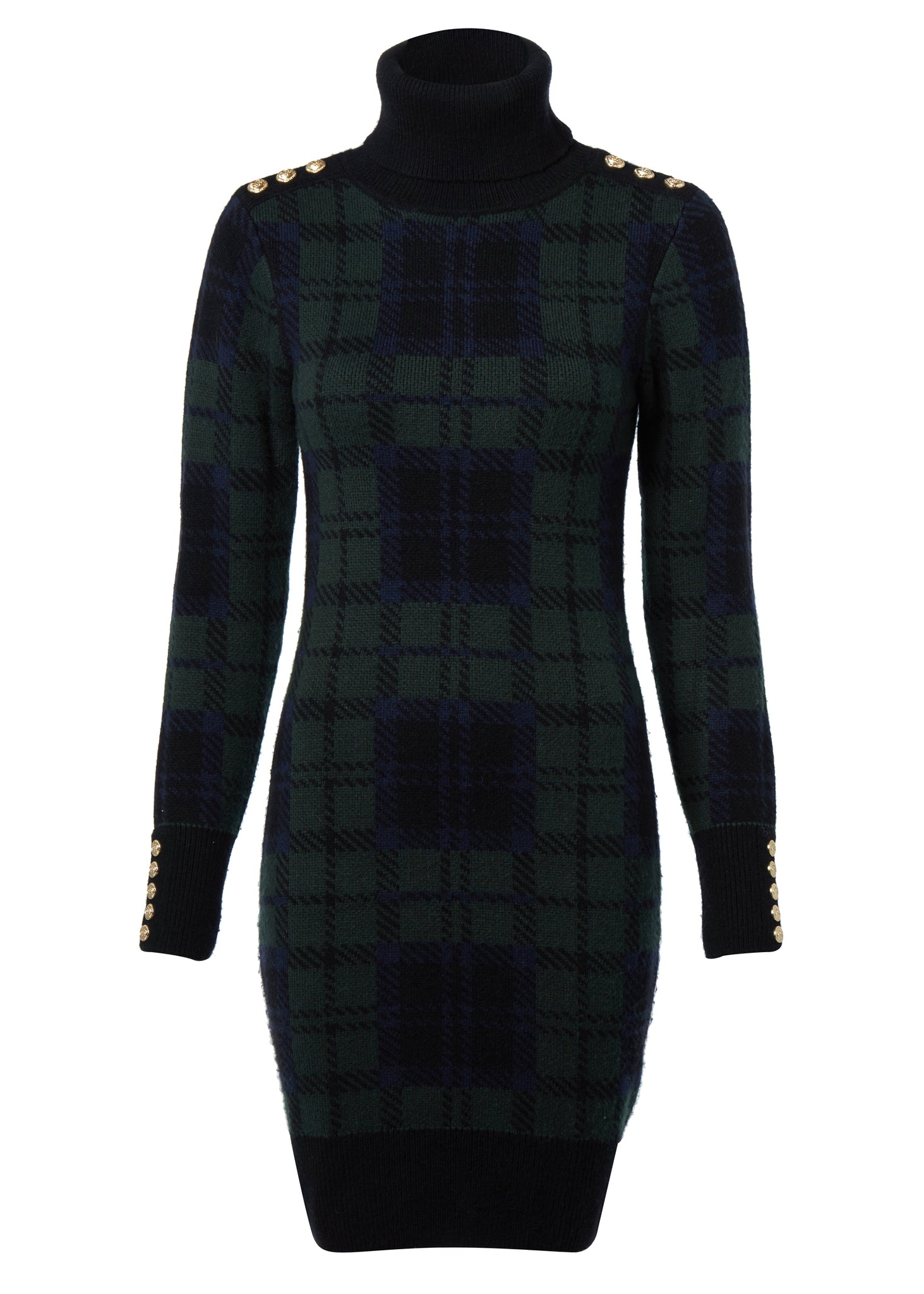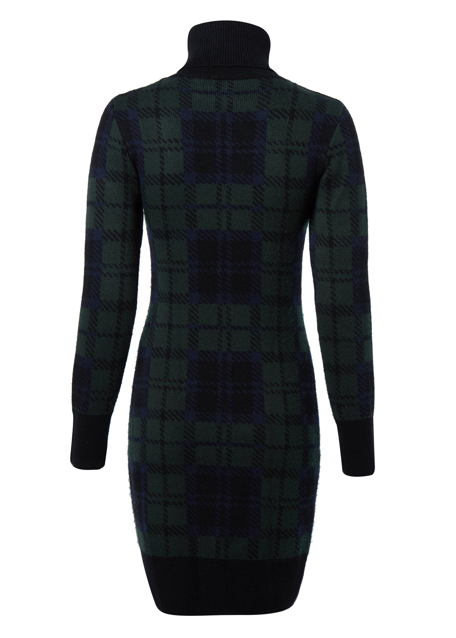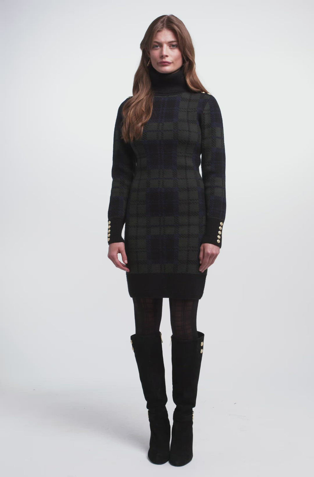Curated from super-soft jacquard knit with a mini and slim fit design, this dress is both comfortable and stylish. Designed with a slight roll neck, the shoulder pad construction makes for a statement silhouette. Detailed with our iconic gold hardware on the shoulders and cuffs.