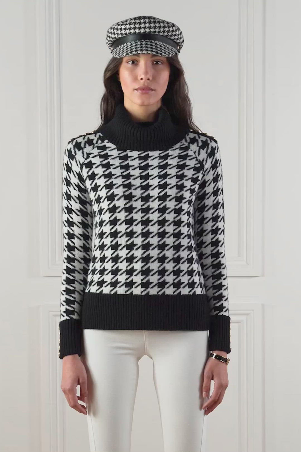 - Wool blend jacquard knit with bold houndstooth design