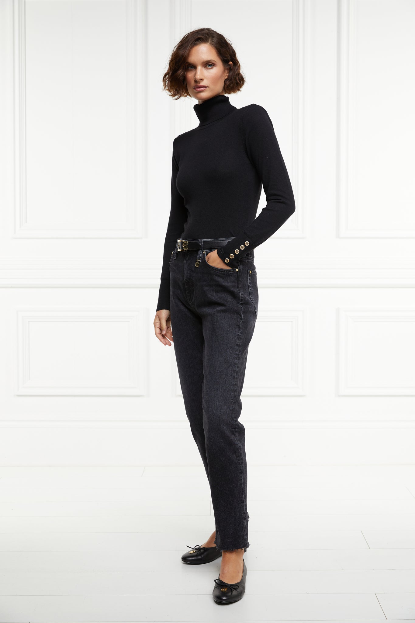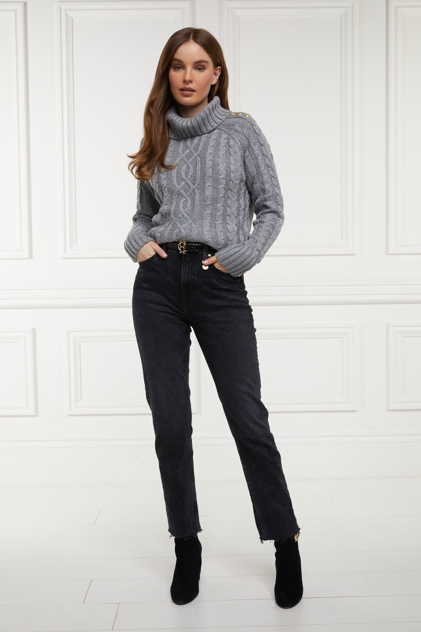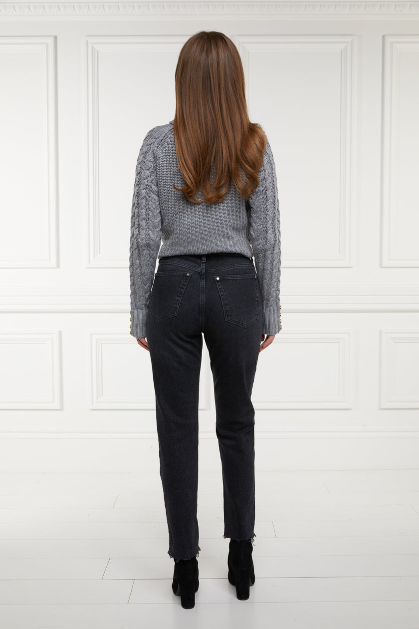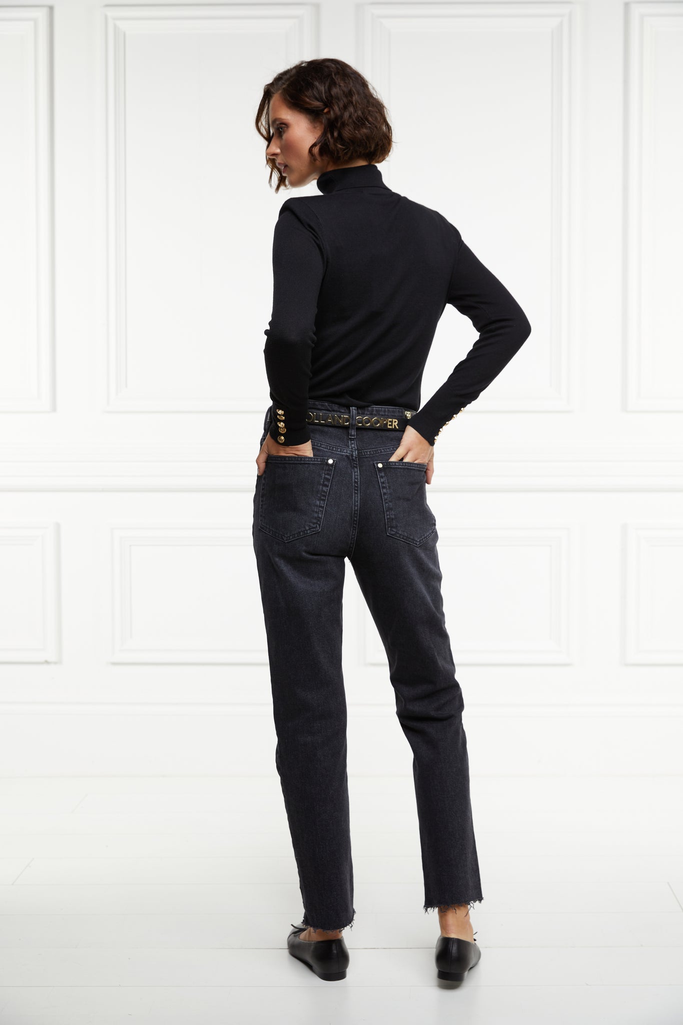 Designed with a classic high waist and slim leg, these jeans have been created from a comfortable stretch denim. Detailed with a traditional five pocket styling with a delicate gold crest to the coin pocket, the raw hem adds to their laid back style. With sewn indicators for Short, Regular, and Long leg lengths, tailor these jeans to be the perfect fit for you. Finished with our iconic hardware and new style leather jacron.