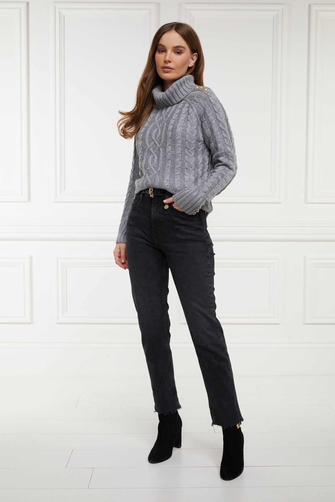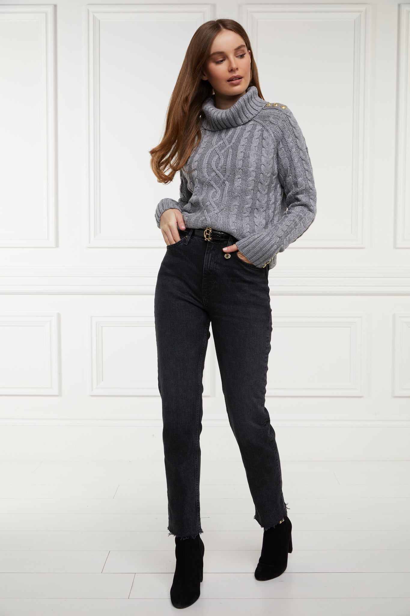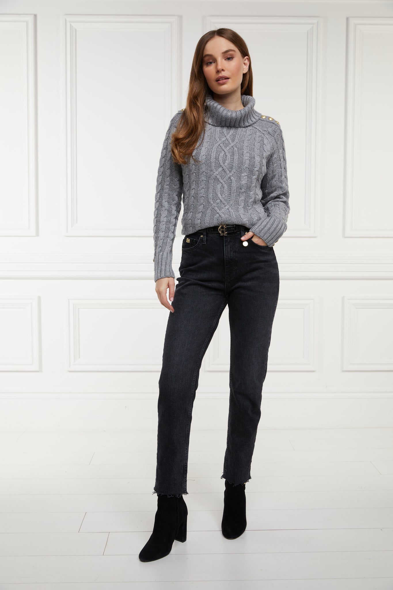 Designed with a classic high waist and slim leg, these jeans have been created from a comfortable stretch denim. Detailed with a traditional five pocket styling with a delicate gold crest to the coin pocket, the raw hem adds to their laid back style. With sewn indicators for Short, Regular, and Long leg lengths, tailor these jeans to be the perfect fit for you. Finished with our iconic hardware and new style leather jacron.