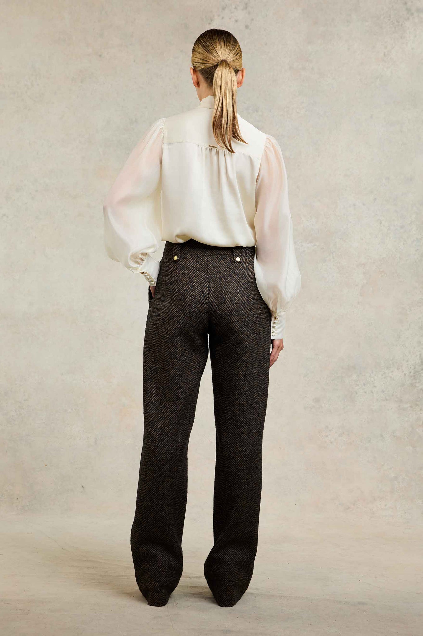 Simple and refined, these straight-leg trousers are the perfect balance of smart and casual that effortlessly take you from day to night. Made from a luxurious wool blend that's fully lined, these trousers sit high on the waist with a wide waistband to create a flattering silhouette that suits all body shapes. Featuring two large side pockets and adorned with our iconic gold hardware for an added touch of luxury. These trousers have been hand cut and made in England using wool woven in the UK.