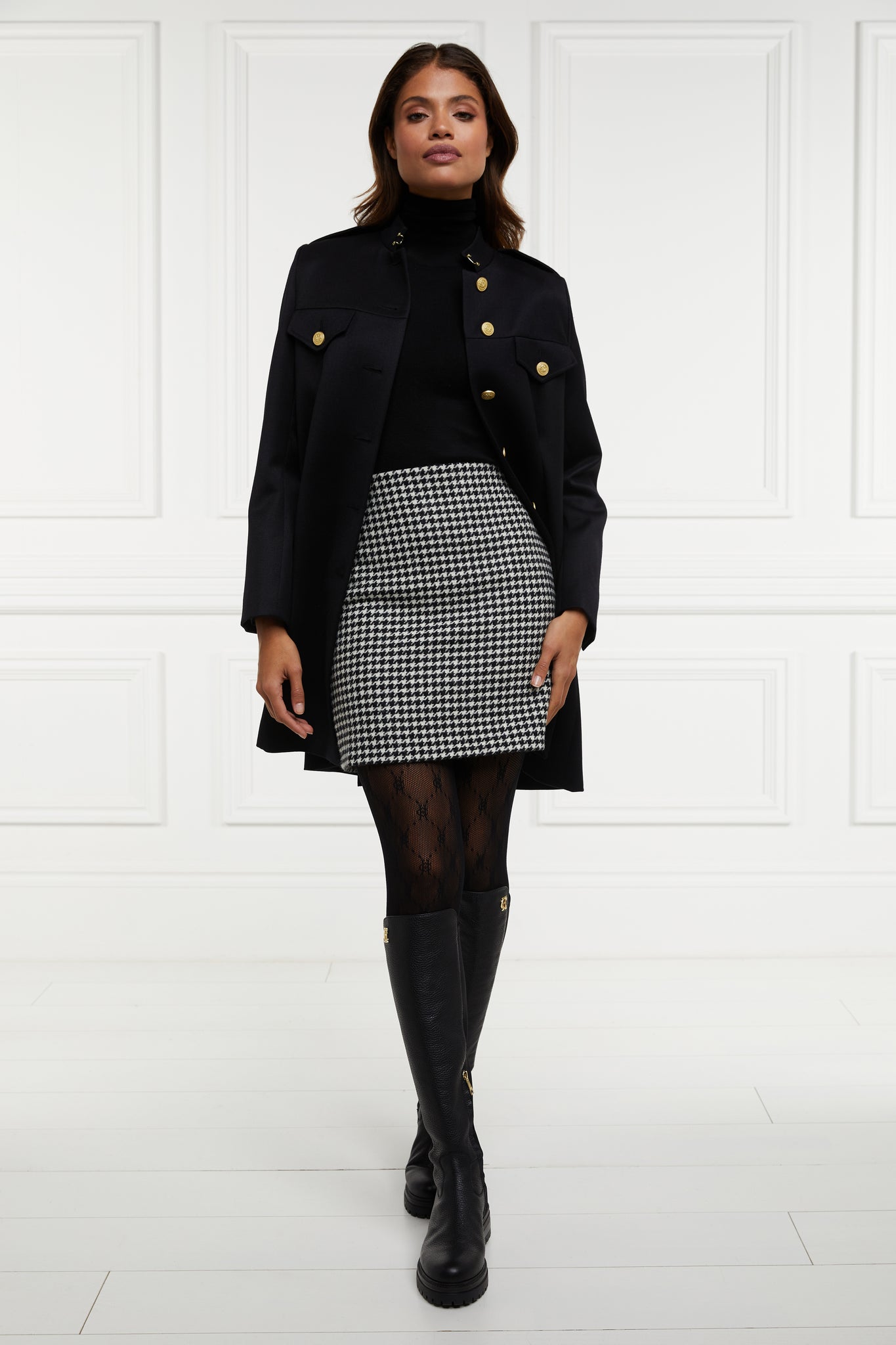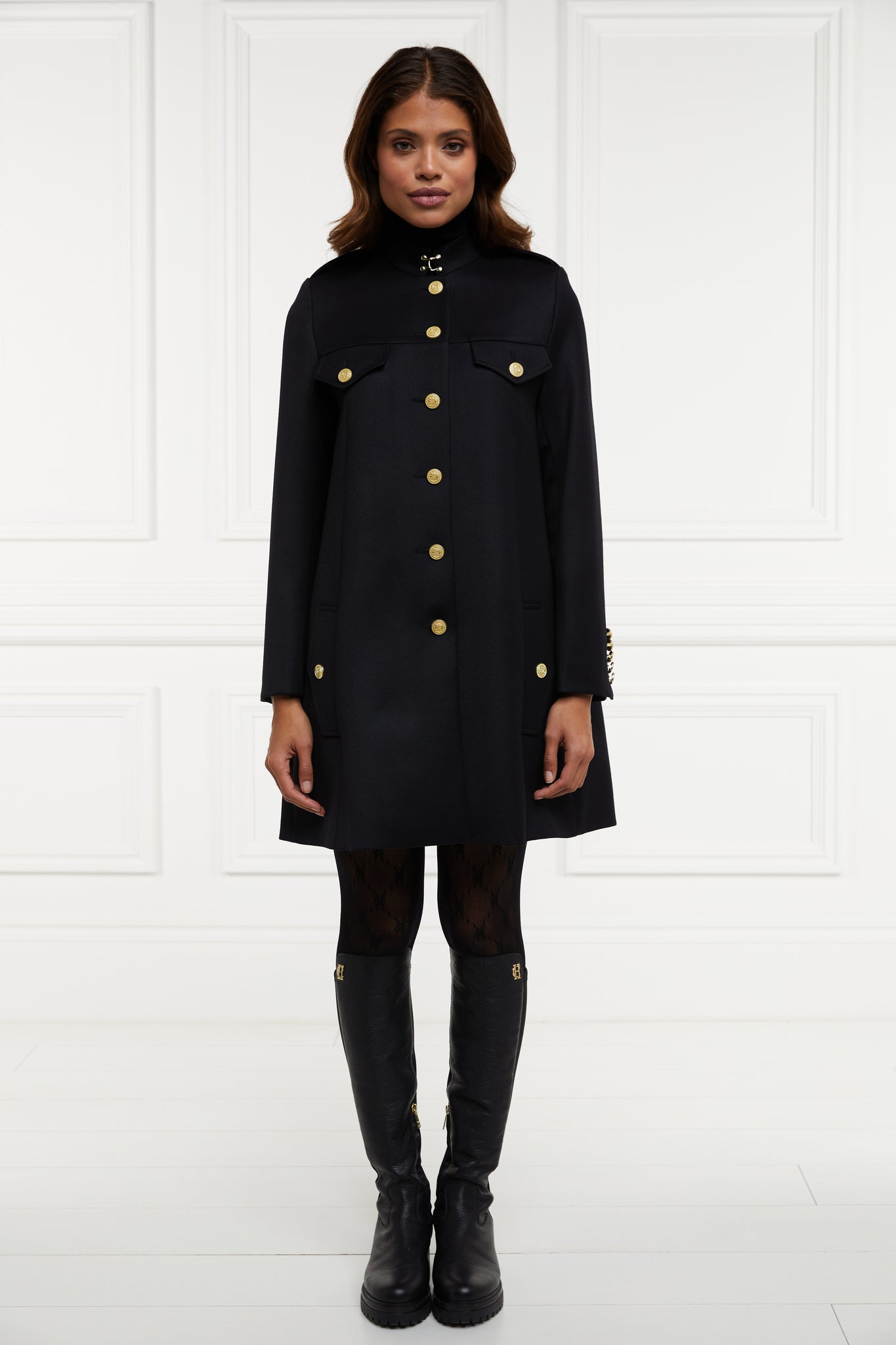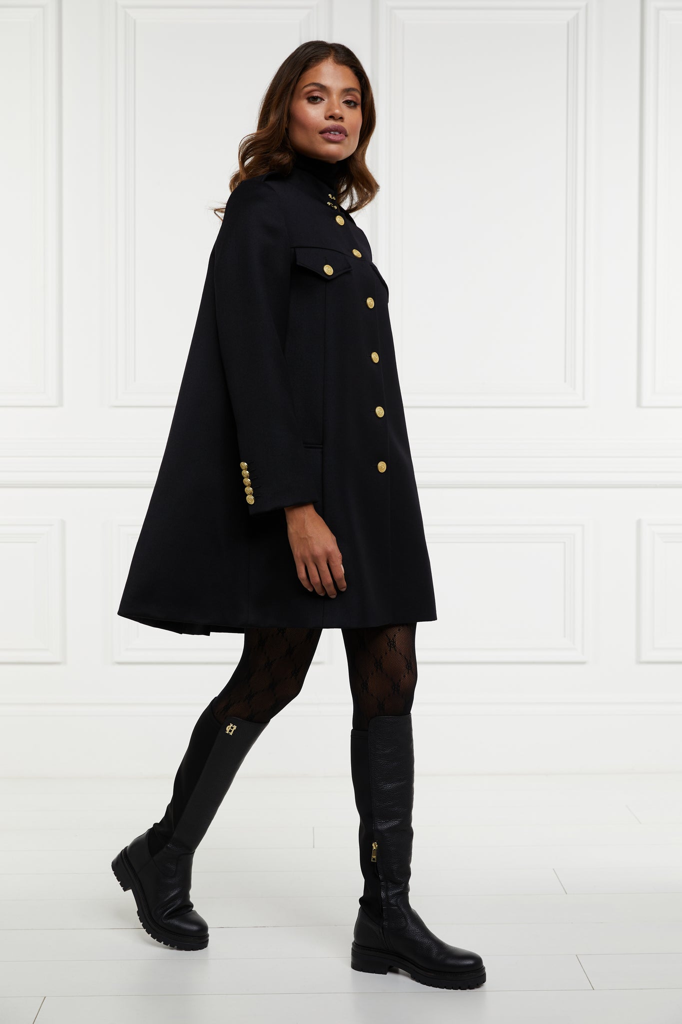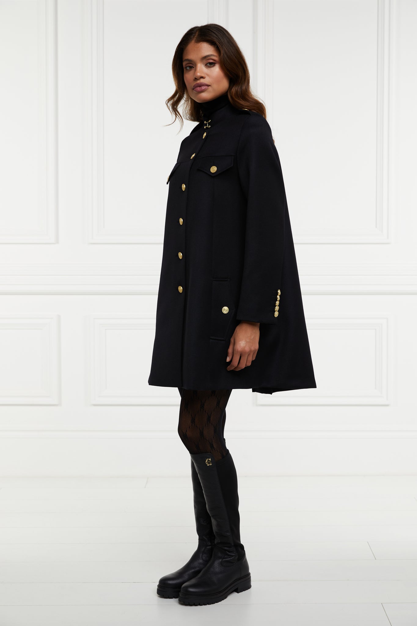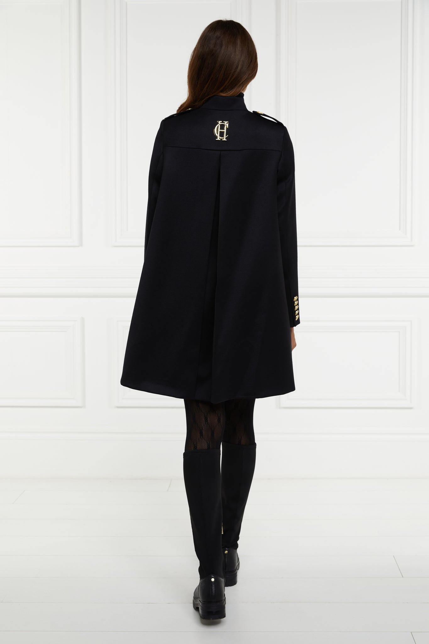 A hybrid between a cape and a jacket, the Highbury Cape has been entirely handmade in the UK. Designed to fit like a cape with an easy fit and elegant drape, the tailored sleeves create a sophisticated silhouette. With a wide inverted box pleat with side-entry pockets, the piece has been detailed with a high neck hook and eye closure. Style note: This piece is perfectly bump-friendly.