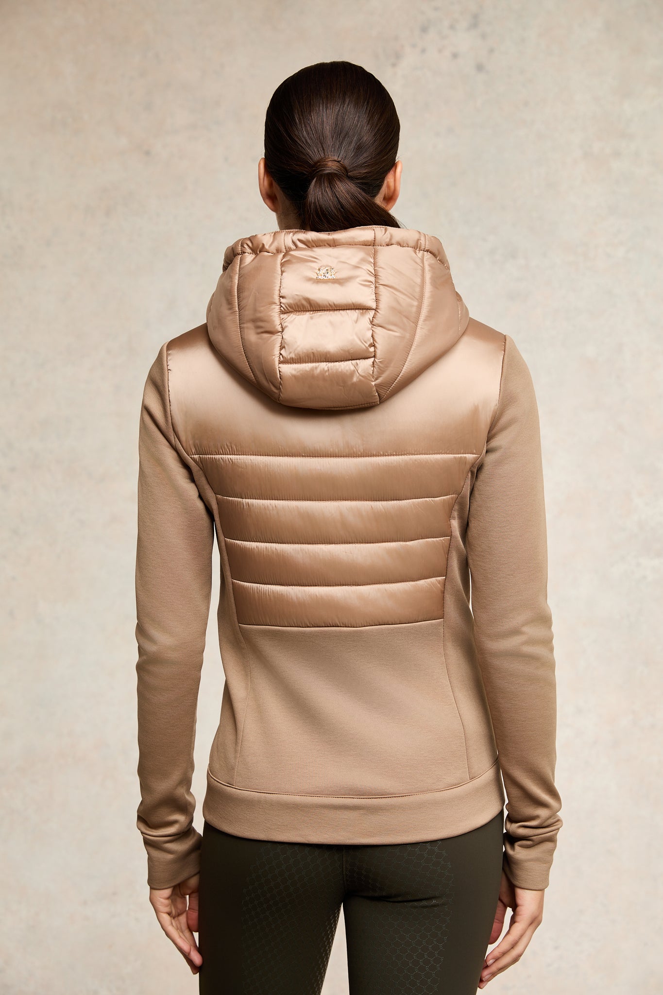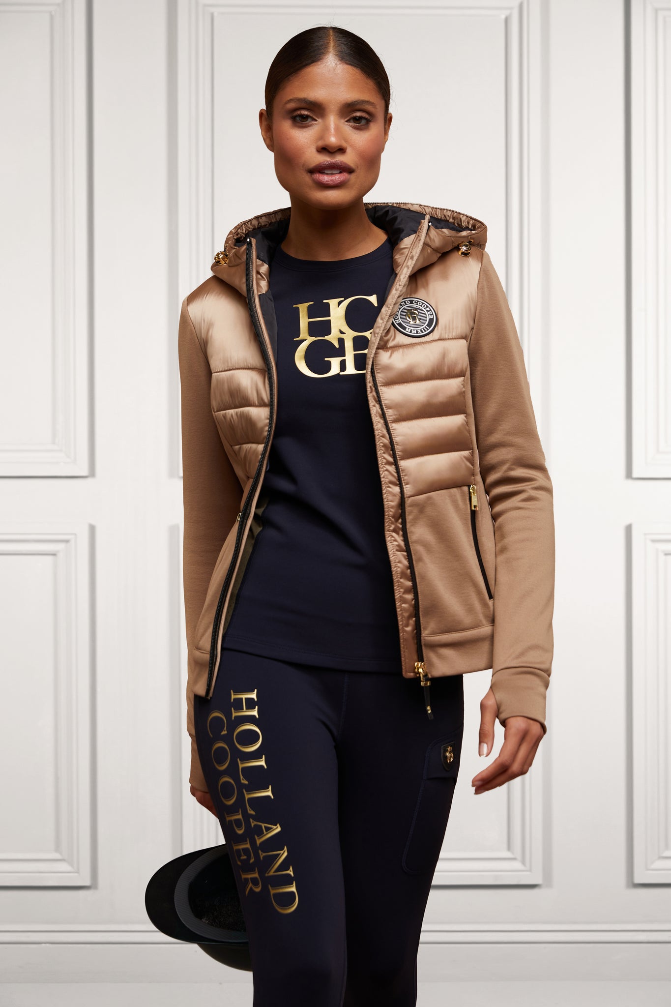 Our first-ever hooded Hybrid Jacket, this piece has been designed with a slim and flattering fit. With a Sorona eco down fill, the front body panels lock in warmth and ensure comfort. Designed with jersey panels to the waist and sleeves, this jacket is both practical and stylish. Detailed with silicone badges and our iconic hardware.