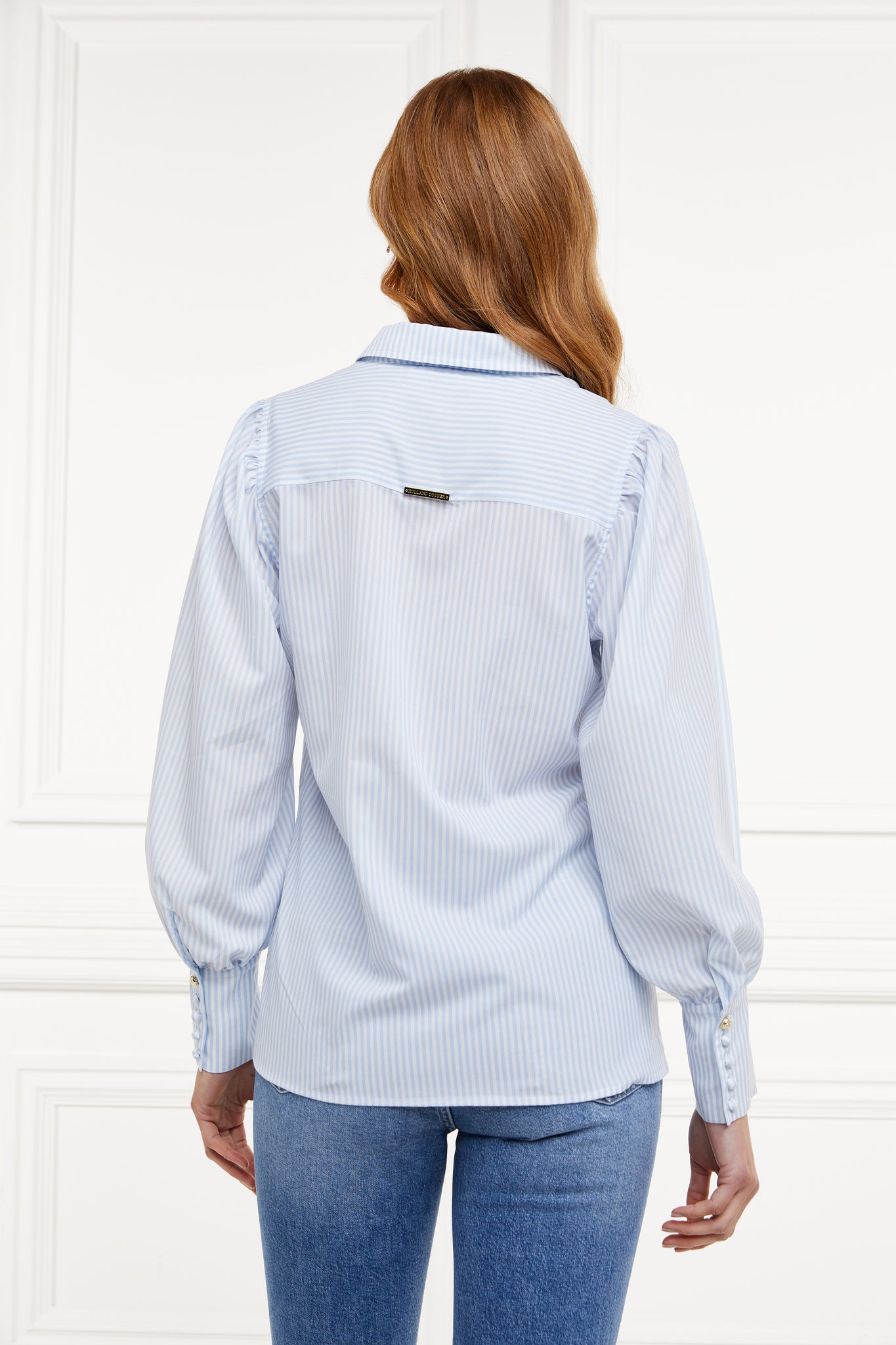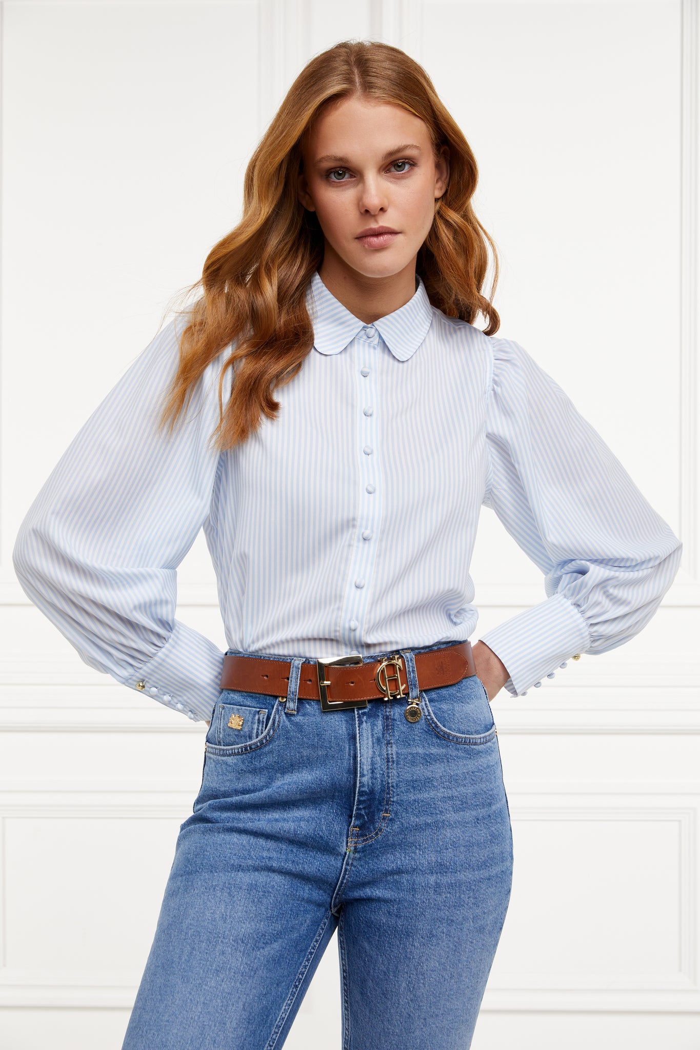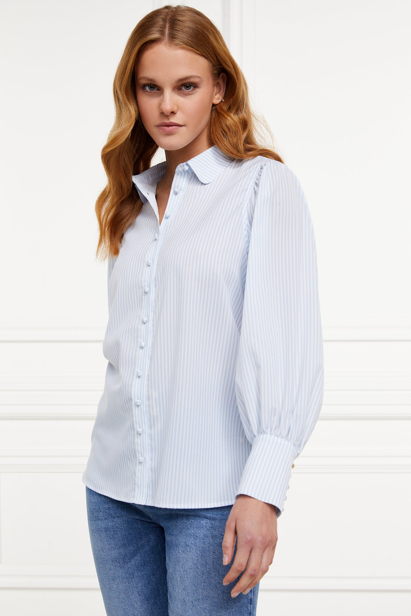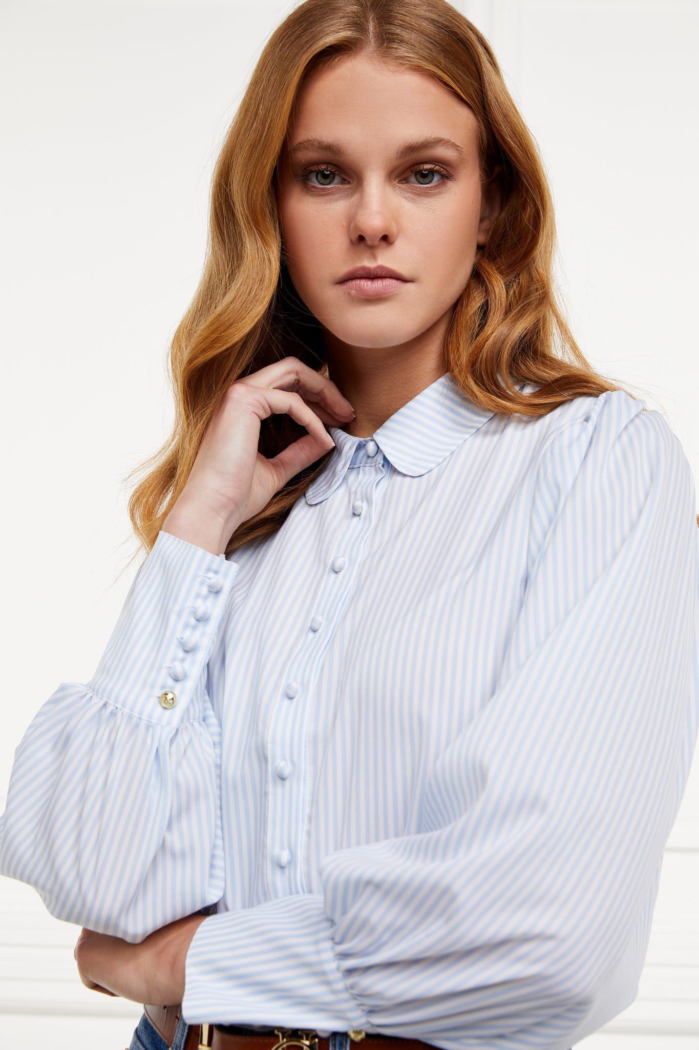 A play on the classic shirt, the Isla Shirt has a tailored yet relaxed fit with statement high volume sleeves and extra long cuffs. The shirt has matching fabric covered buttons down the front and a gold crested button for that signature Holland Cooper look. -