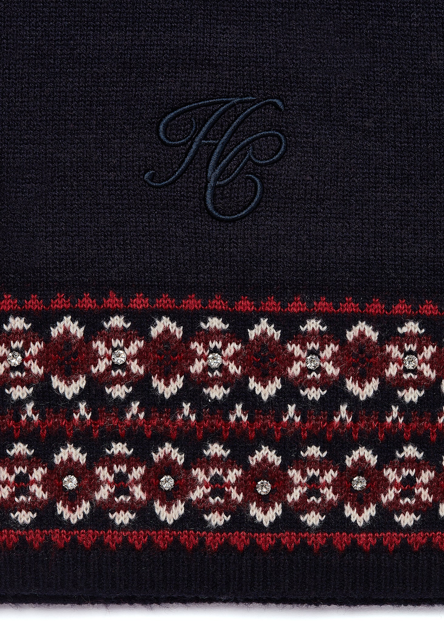 Introducing the Jennifer Fairisle Scarf, designed to perfectly complement our Jennifer Knit. This scarf showcases a classic Fairisle pattern adorned with sparkling crystal studs. The premium high build embroidery adds a touch of luxury and sophistication. Combining timeless design with elegant detailing, the Jennifer Fairisle Scarf is a stylish and versatile addition to your winter wardrobe.