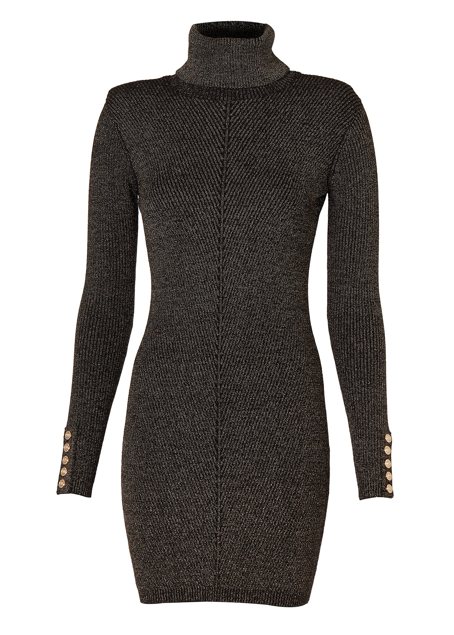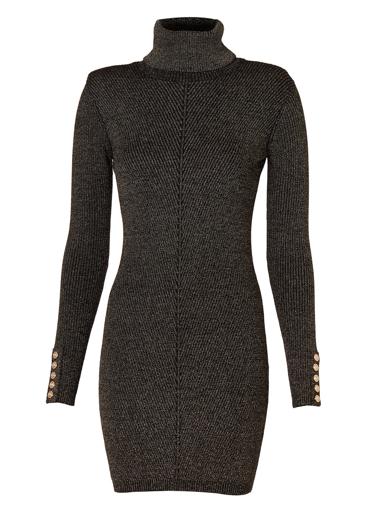 A striking piece designed to enhance your silhouette with its body-contouring fit. Featuring a high roll neck collar, this mini dress exudes sophistication and modern style. The ribbed fabric construction ensures a flattering, sculpted look, while the shoulder pads are enhanced with the added detail of signature rivets, giving the dress a unique and contemporary touch.
