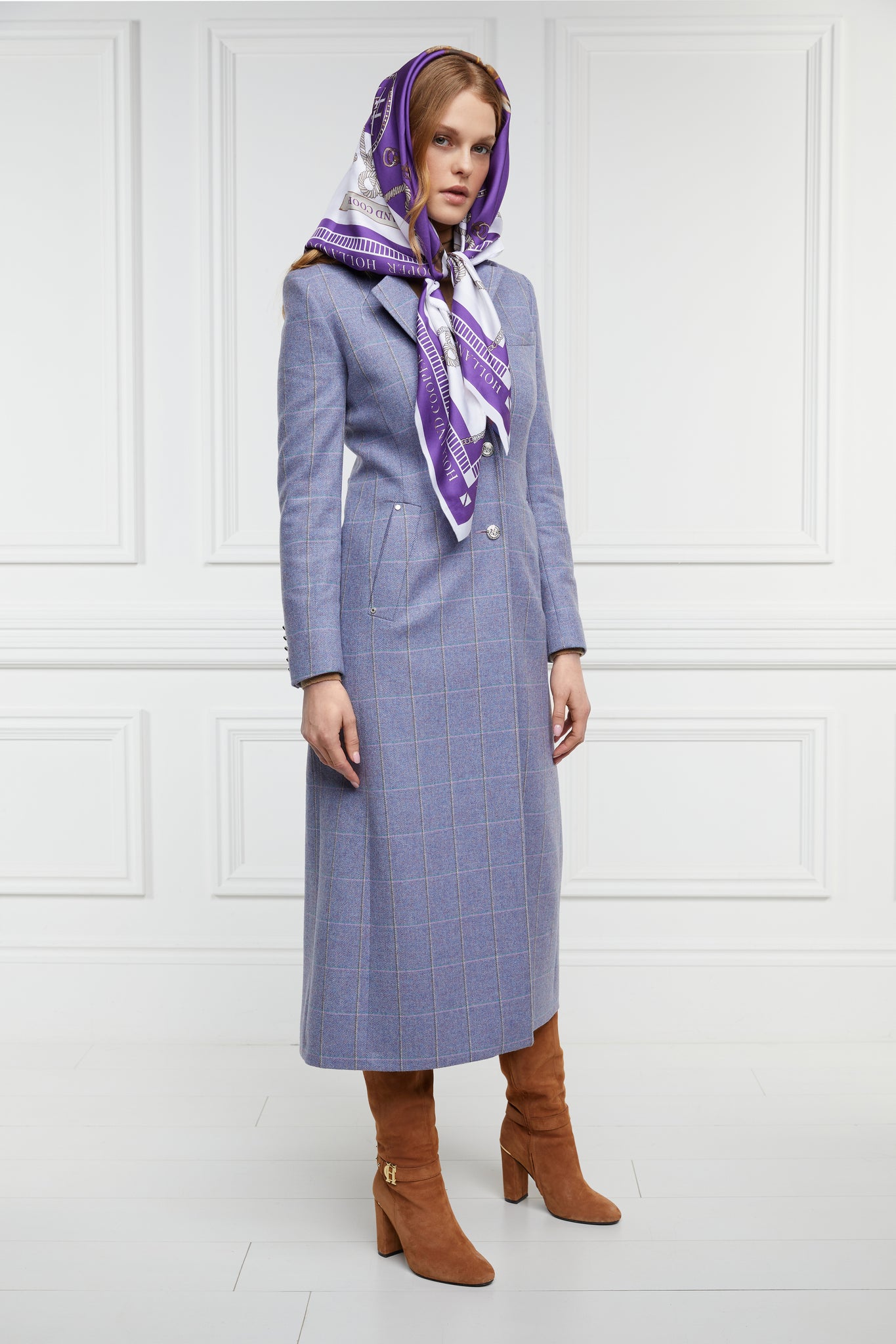 Designed and cut with a slightly longer length, this coat truly showcases the heritage of our brand. Handmade in the UK from the finest Scottish wools, the slim and tailored fit is both feminine and versatile whilst ensuring a sharp silhouette when worn. Celebrating the Jubillee, this piece has been beautifully elevated with our limited edition, platinum-plated hardware and lined with a rich purple, satin fabric. To ensure this piece turns heads, our iconic houndstooth fabric lines the undercollar of this coat. Simply pop the collar to created a more contemporary style.