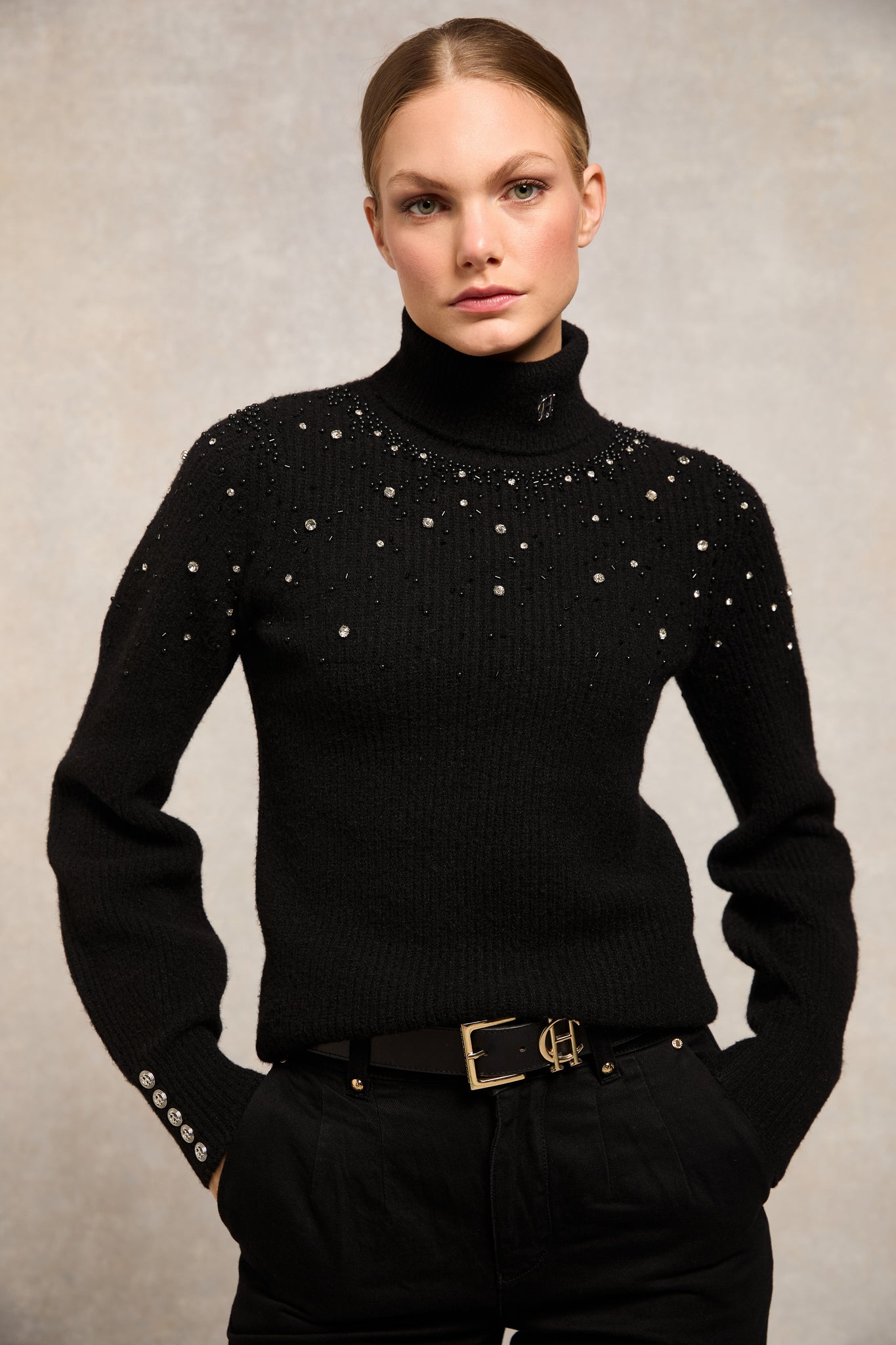 A sophisticated wardrobe essential, crafted from soft, ribbed fabric for a flattering fit. The Kelsie Rib Embellished roll neck is elegantly adorned with crystal and pearl detailing, adding a touch of glamour, while signature hardware on the cuffs offers a luxurious finish. Perfect for elevating both day and night looks, this piece effortlessly combines comfort and style.