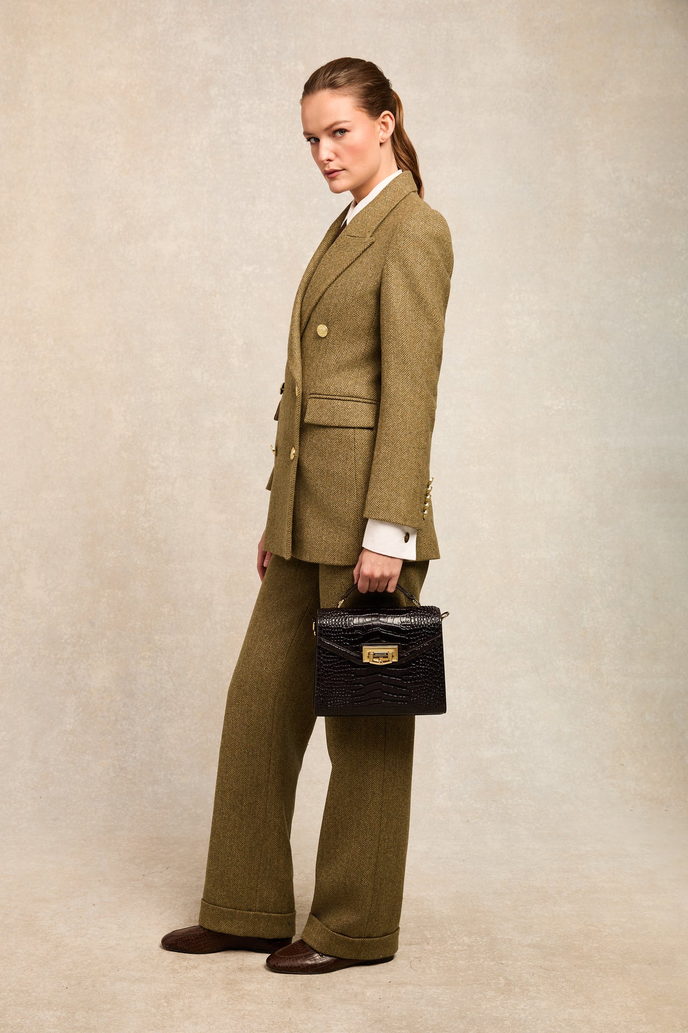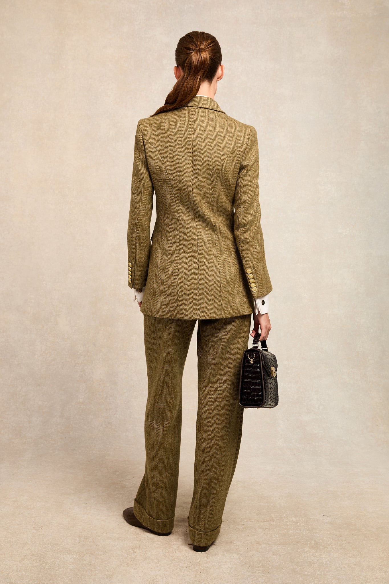 Designed to create a sharp, sophisticated silhouette, it can be worn open or closed for versatile styling. Handmade in the UK, this blazer is crafted from our new moss green tweed and fully lined with a luxury stretch fabric for added comfort. Featuring bold lapels and subtle hip pockets, with HC's signature gold hardware on the front and cuffs, making it an essential, high-end addition to your wardrobe.