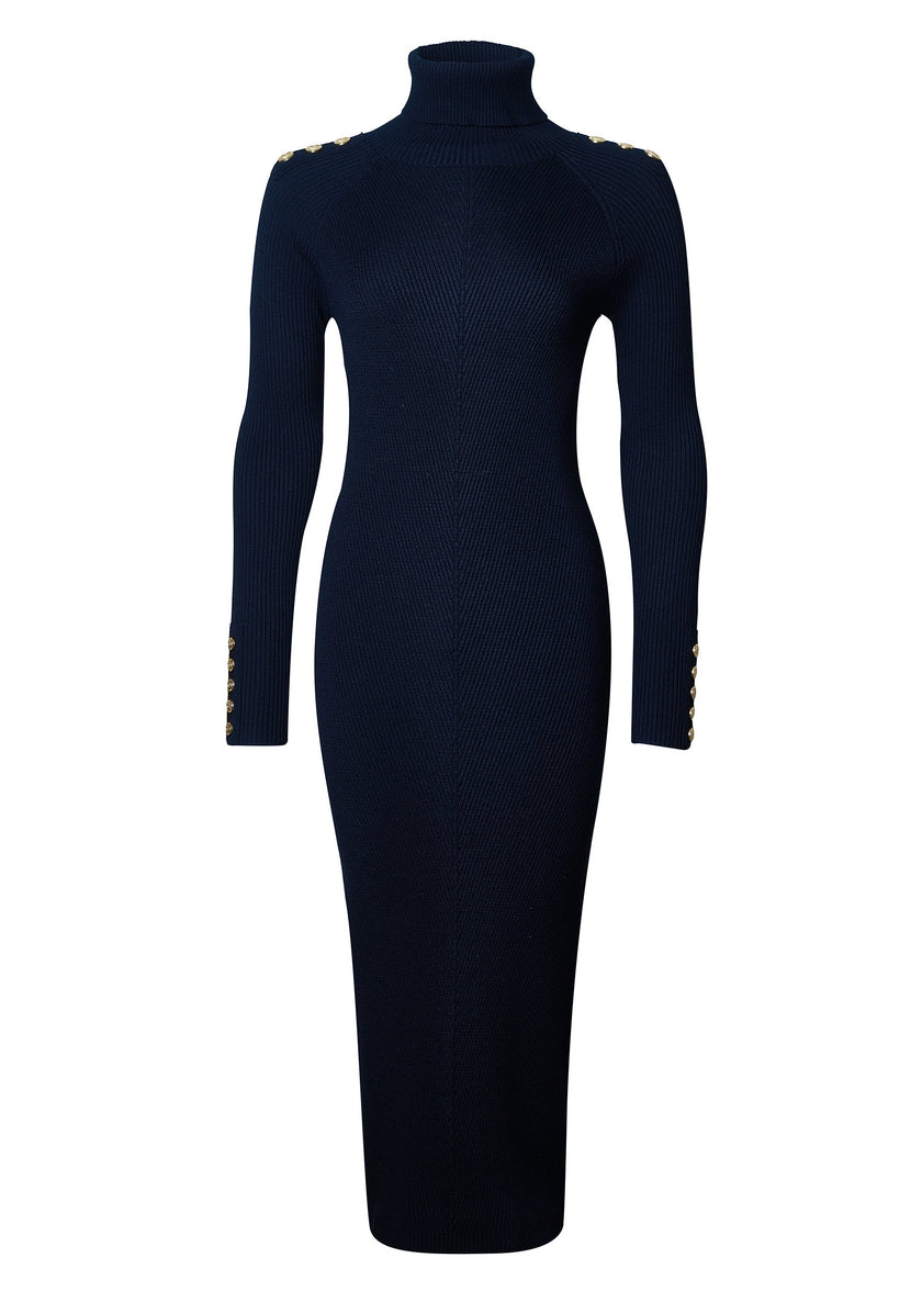zoomed in shot of womens navy knitted roll neck midi dress with gold buttons on cuffs and shoulders