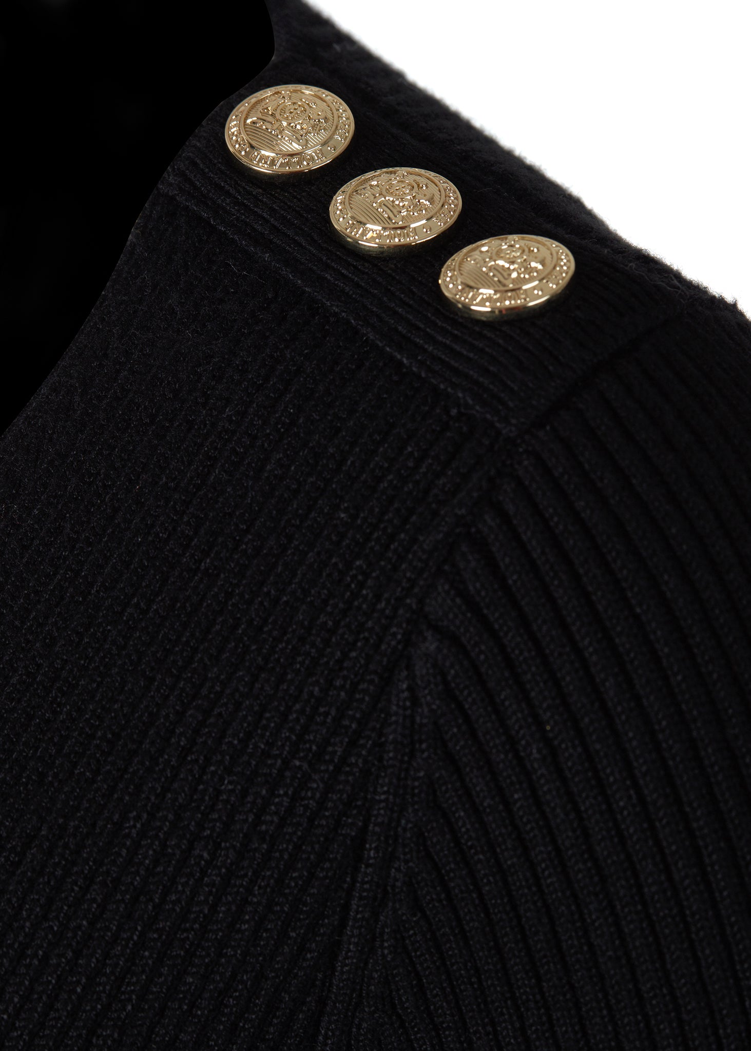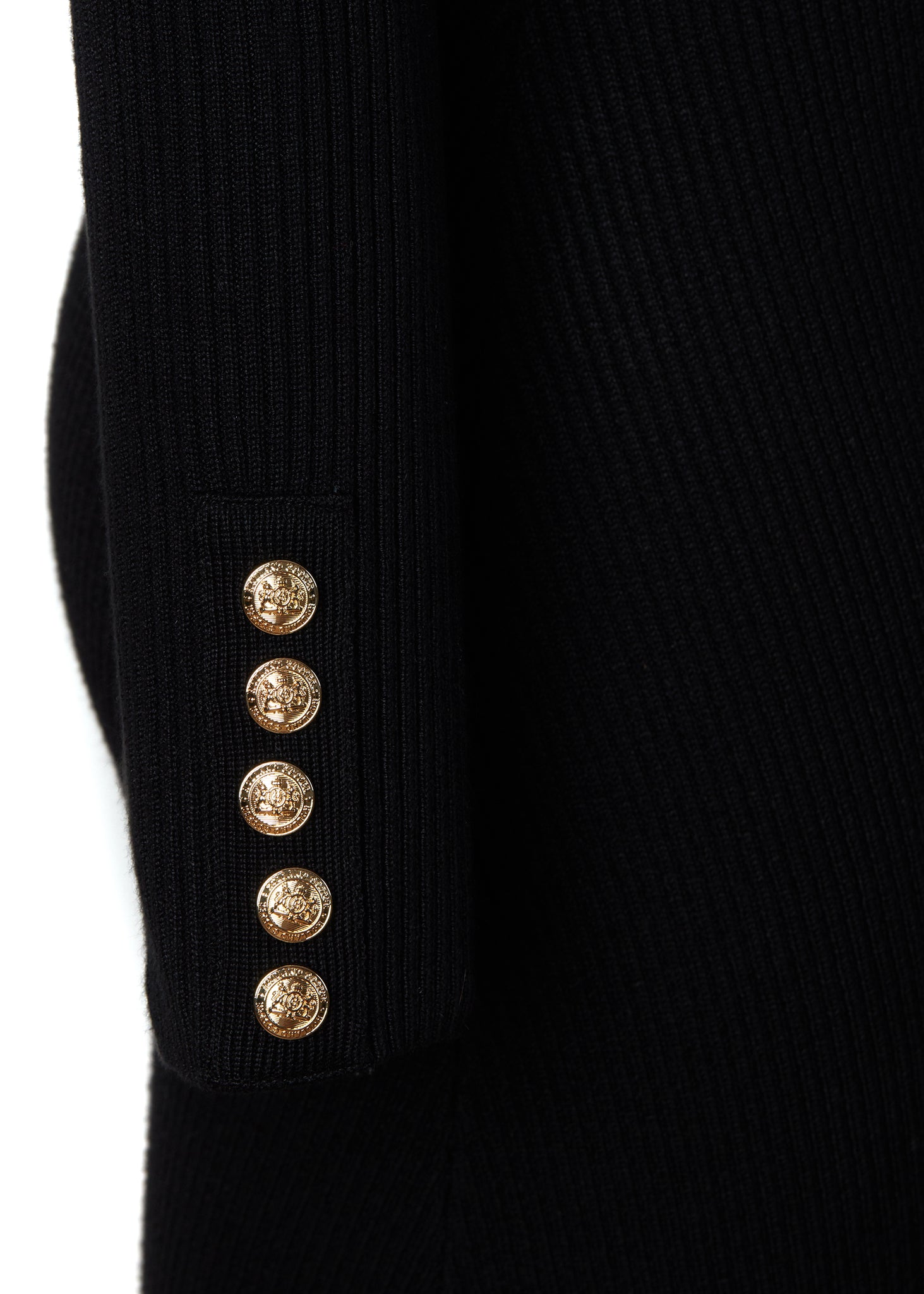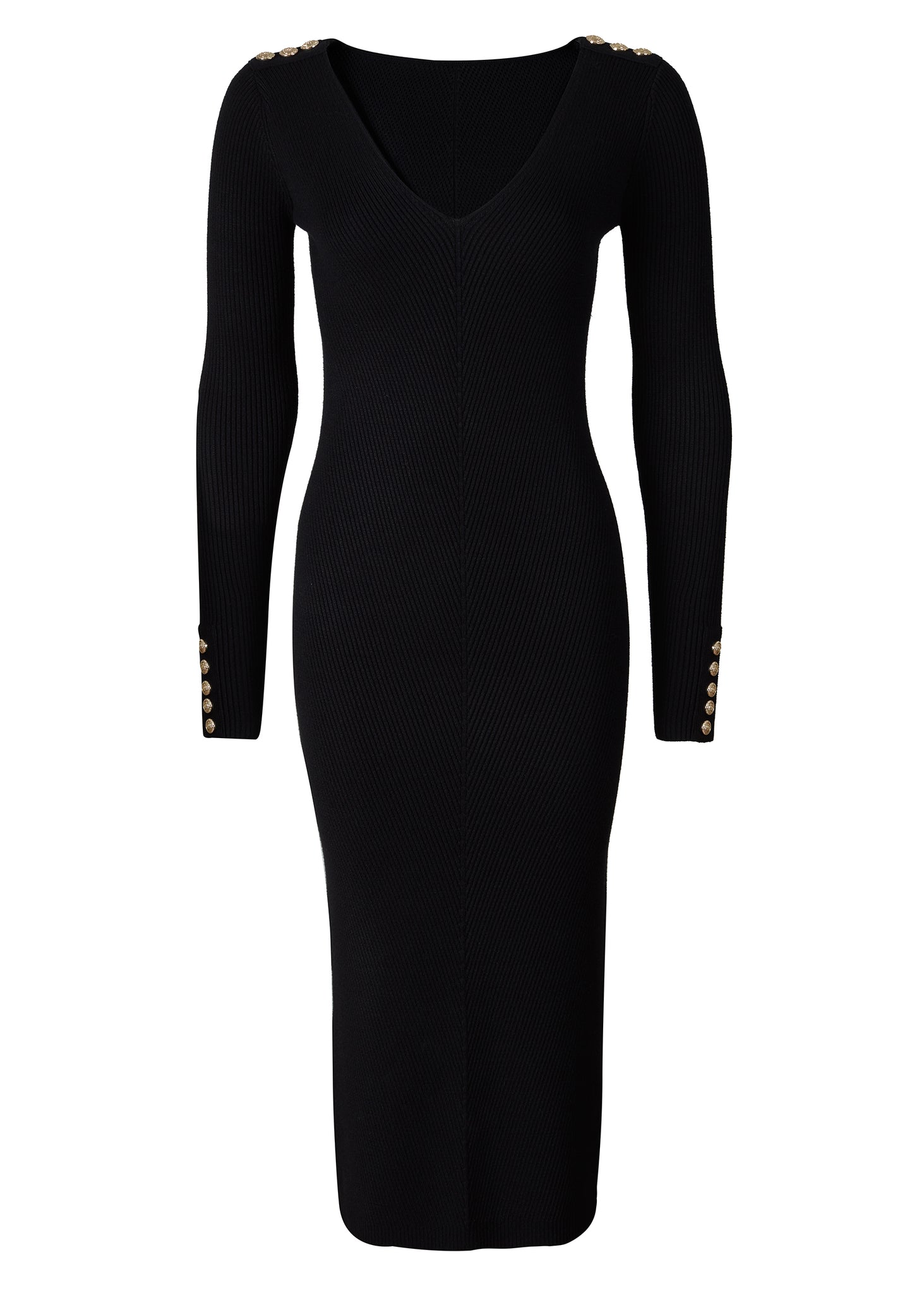 Designed with a mid calf length and chevron ribbed fabric, this dress creates a flattered and contoured silhouette. With an elegant v-neck, shoulder pad construction and iconic HC hardware, this dress is a classic wardrobe essential.