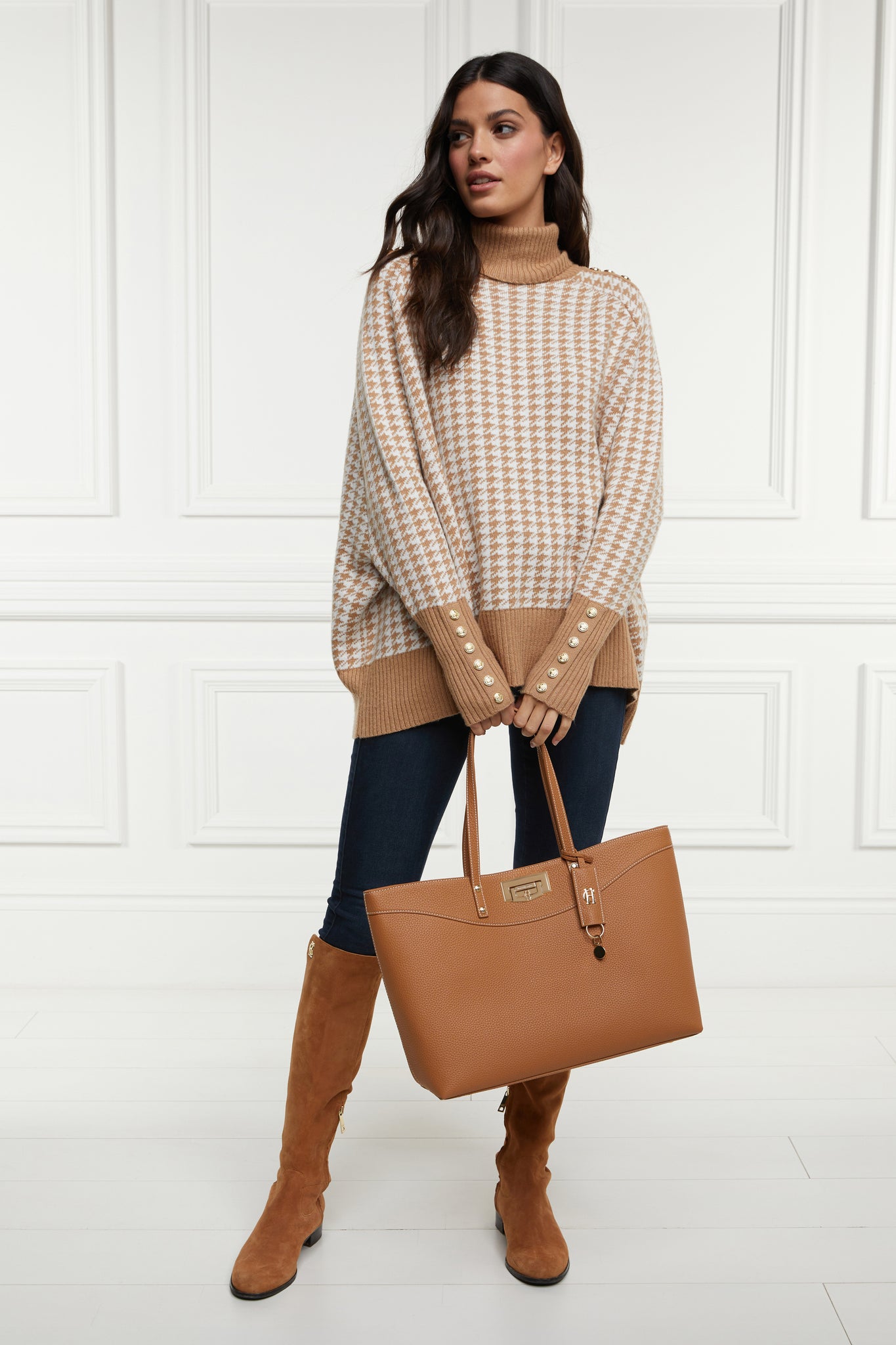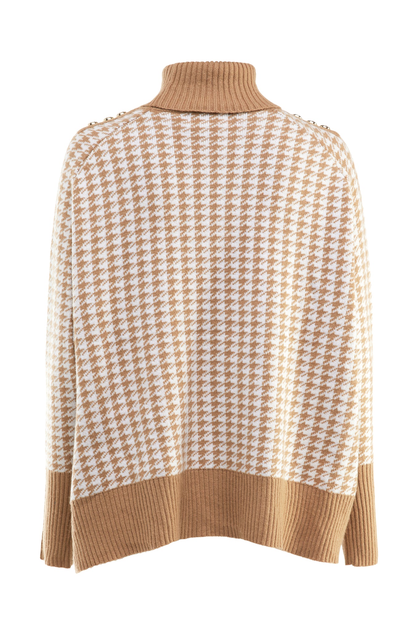 Crafted from a super soft yarn with a jacquard knit and a subtle funnel neck design, this piece is the perfect layer to take you through the winter months. With an oversized, batwing shape with side split detailing to ensure an elegant drape. Detailed with gold hardware.