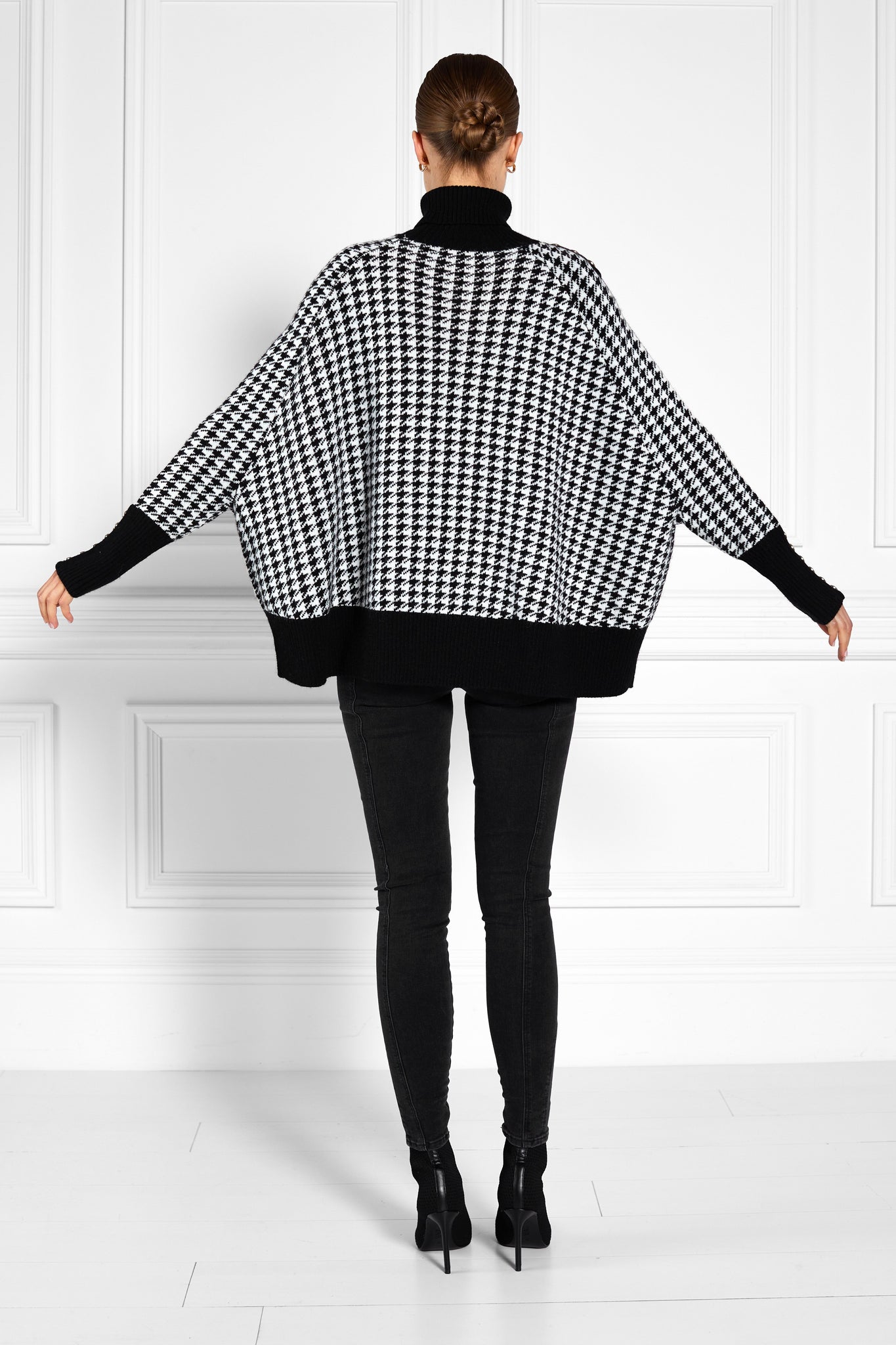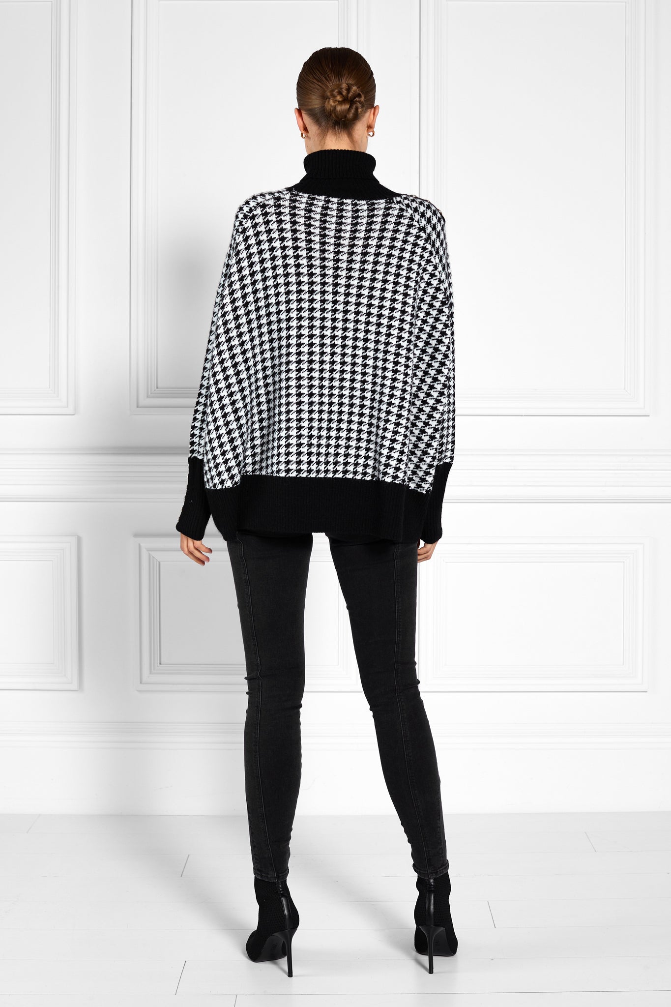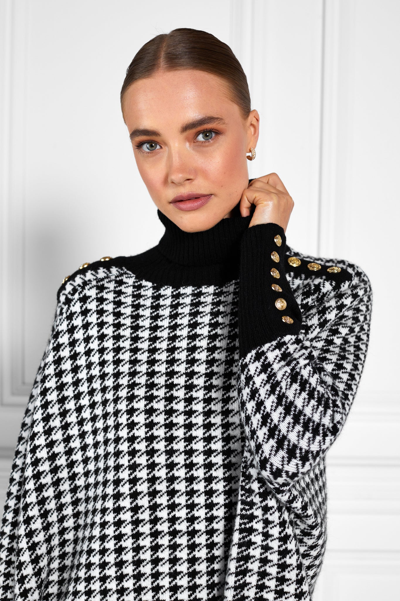 Crafted from a super soft yarn with a jacquard knit and a subtle funnel neck design, this piece is the perfect layer to take you through the winter months. With an oversized, batwing shape with side split detailing to ensure an elegant drape. Detailed with gold hardware