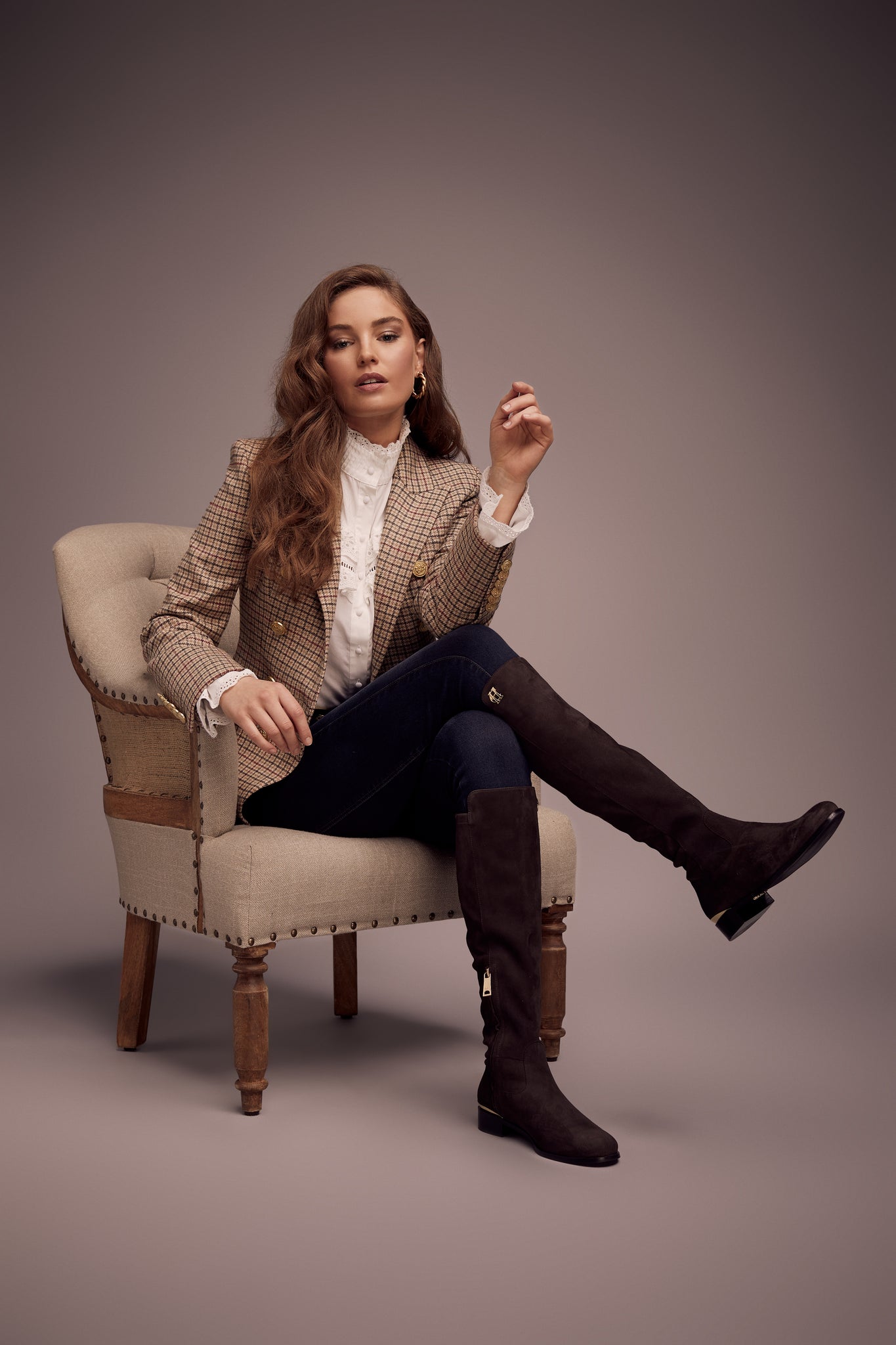 This double breasted blazer is a chic transeasonal wardrobe essential. Designed to create a sharp tailored silhouette worn open or closed. Fully lined with a luxury stretch lining for extra comfort and adorned with HC signature gold buttons on the front and cuffs. This blazer has been hand cut and made entirely in England using wools woven in the UK.