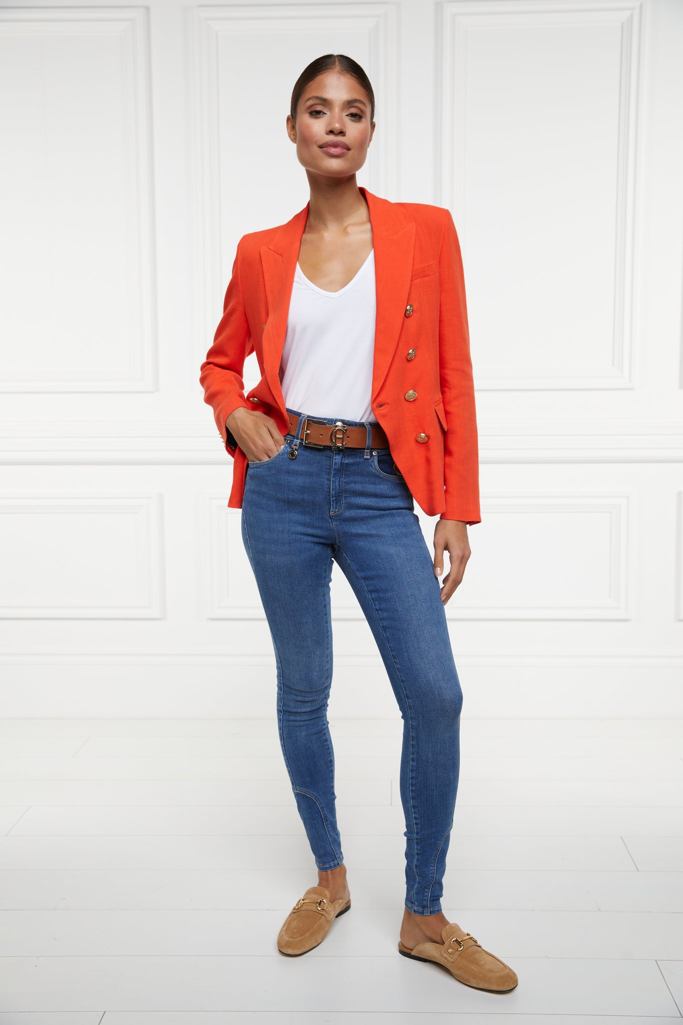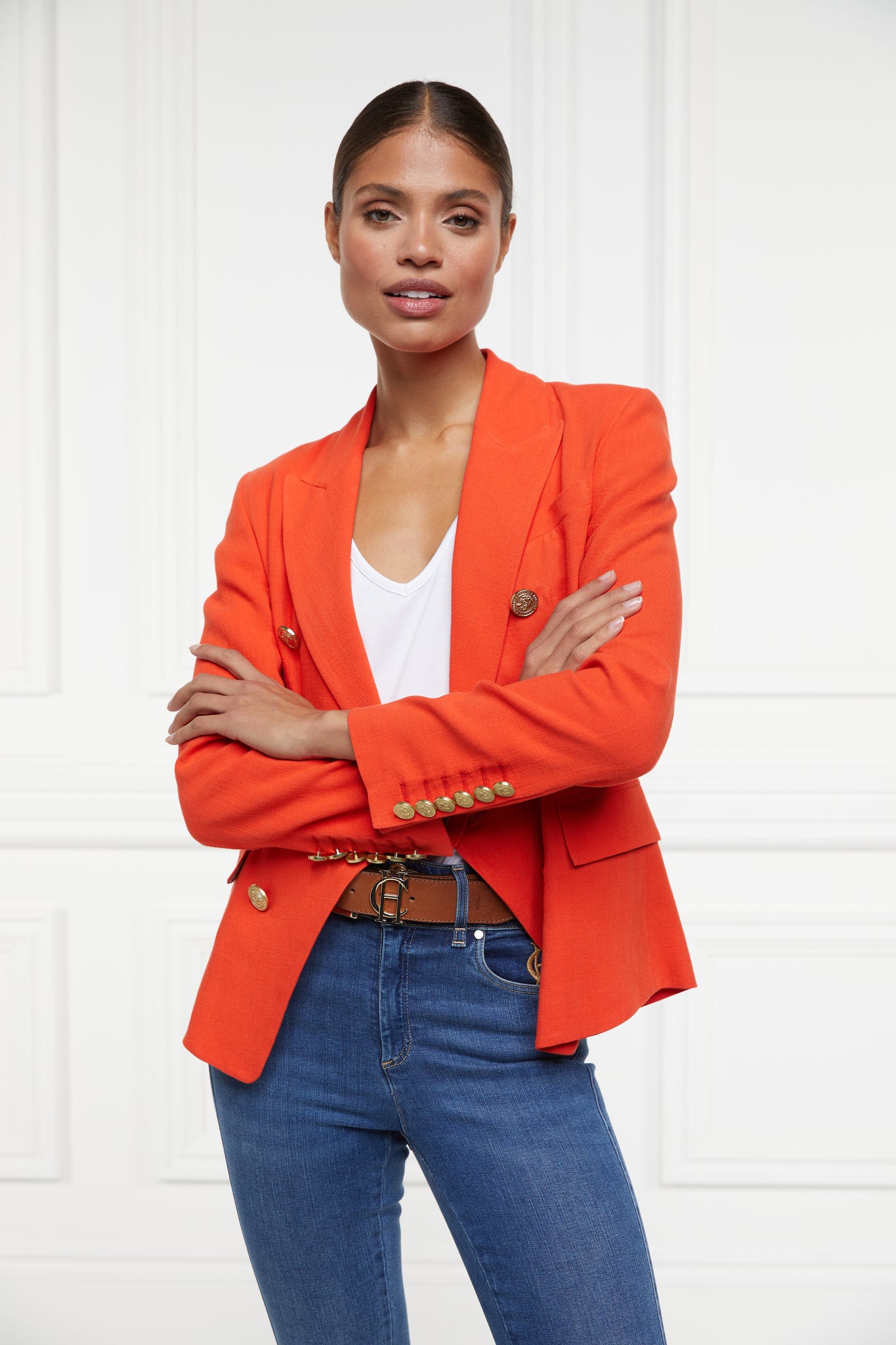 Designed to create a sharp tailored silhouette worn open or closed, the Linen Knightsbridge Blazer has been handmade in the UK. Crafted from a crease-resistant, lightweight and breathable linen blend & fully lined with a luxury stretch lining for extra comfort, this piece is a must-have for your summer wardrobe. Elevated with HC signature gold hardware to the front and cuffs, the bold colour makes for a chic and contemporary statement. Wear yours with jeans or pair with our matching Tailored Shorts.