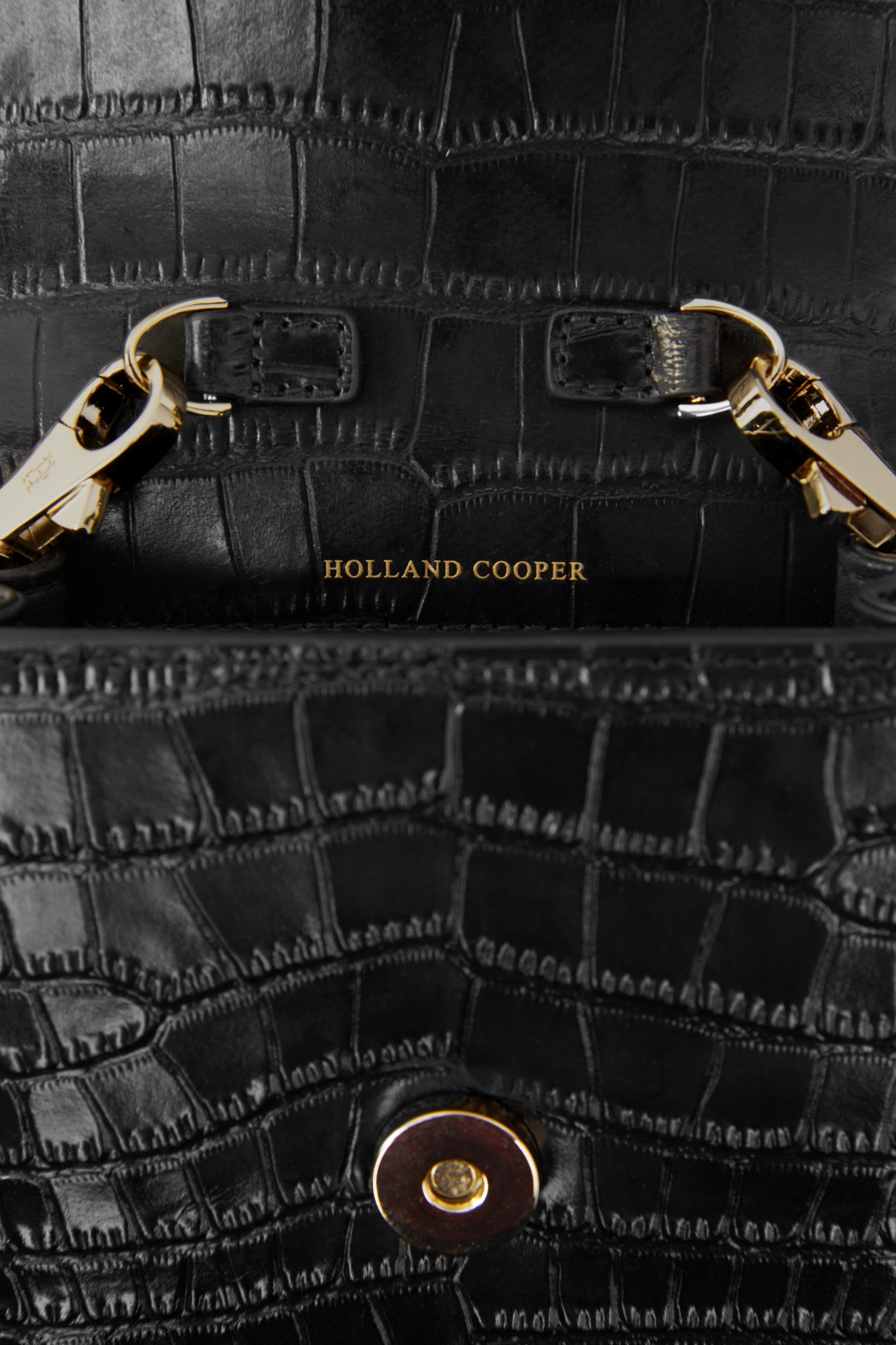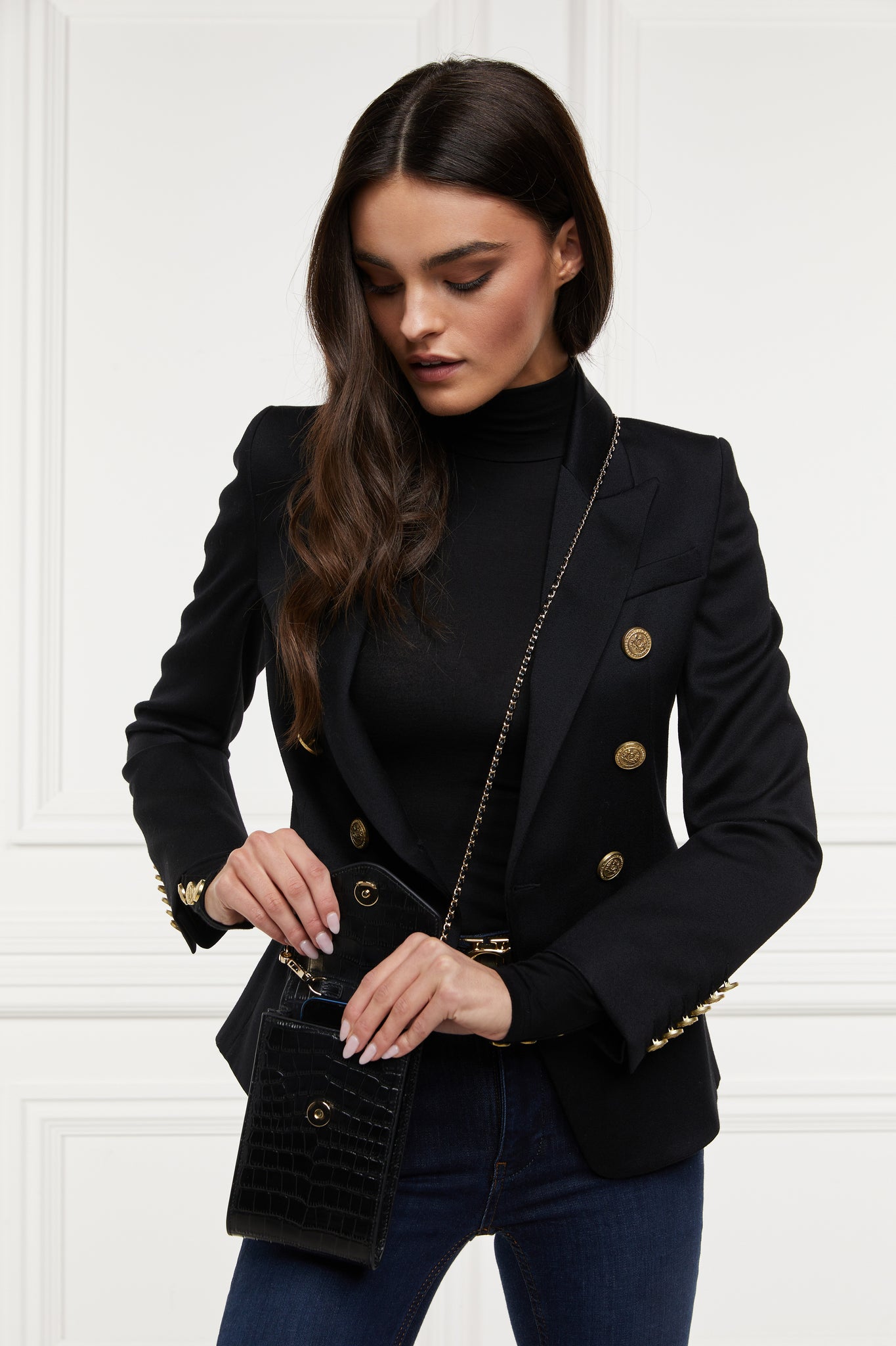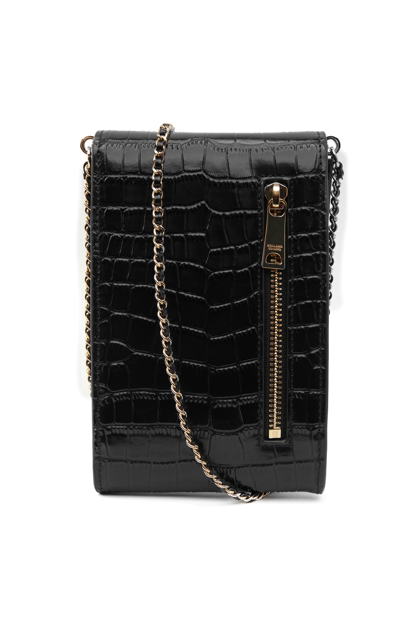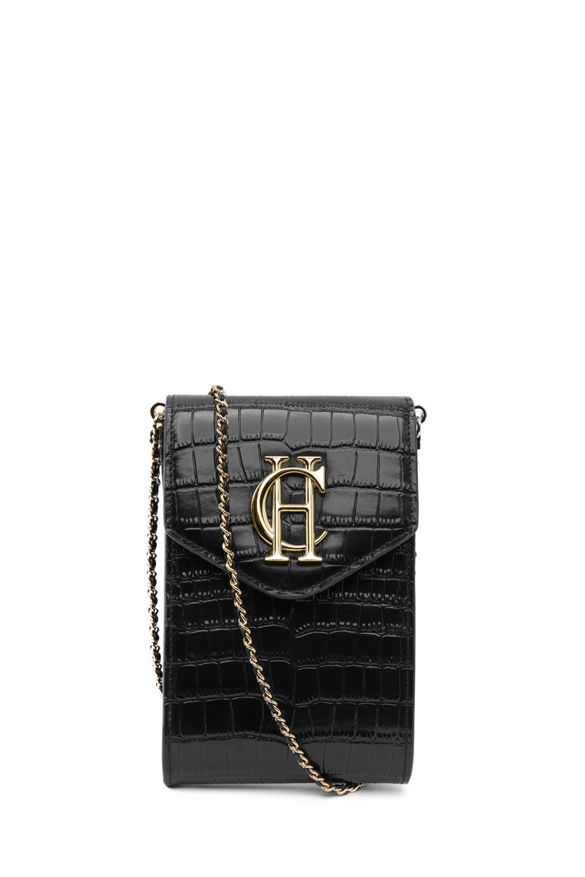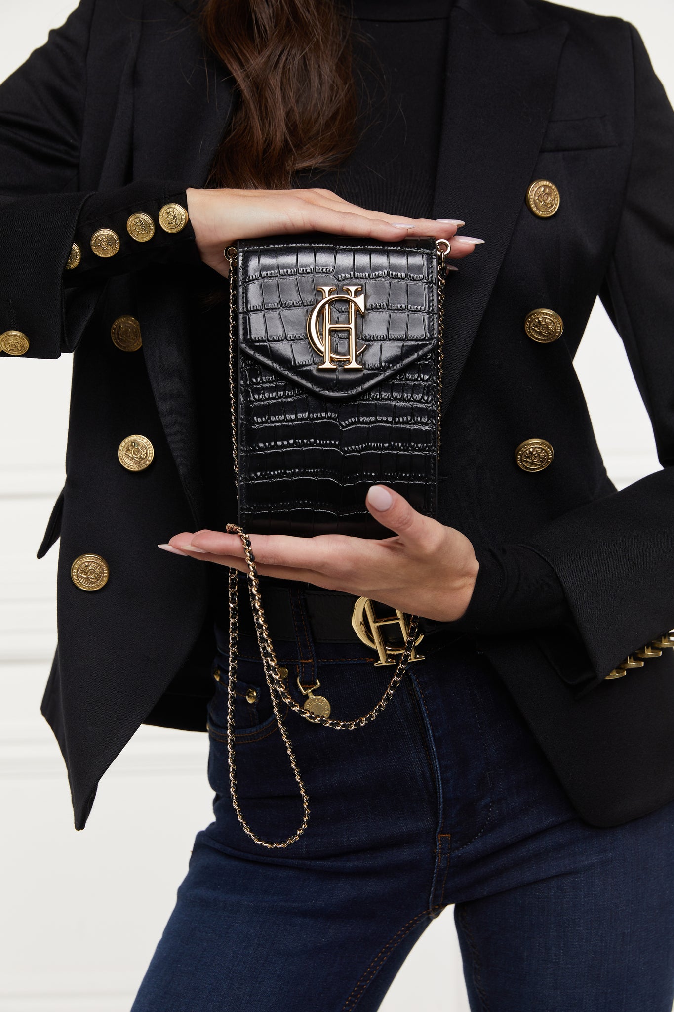 Made from croc embossed leather this phone pouch is the perfect companion for every outfit. Centred around our iconic gold HC branding this bag comes with a detachable leather filled gold chain to perfectly sit on your shoulder. Fastened with a strong magnetic clasp and on the front and a small zip pocket on the back for safe keeping.