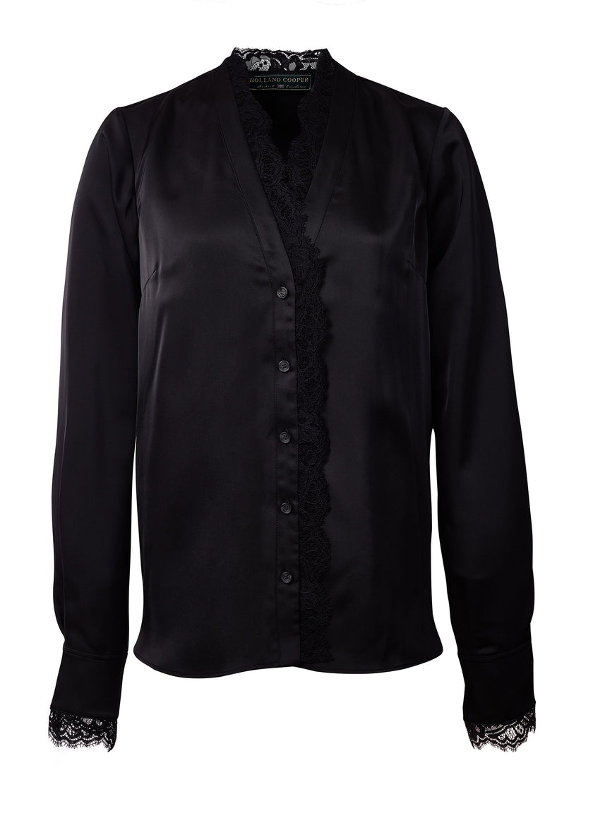 Our beautiful and truly luxurious v-neck blouse has been designed with a relaxed fit. With a delicate lace trim on the collar and cuff edges, this piece is an update of our Lace Tie Shirt.