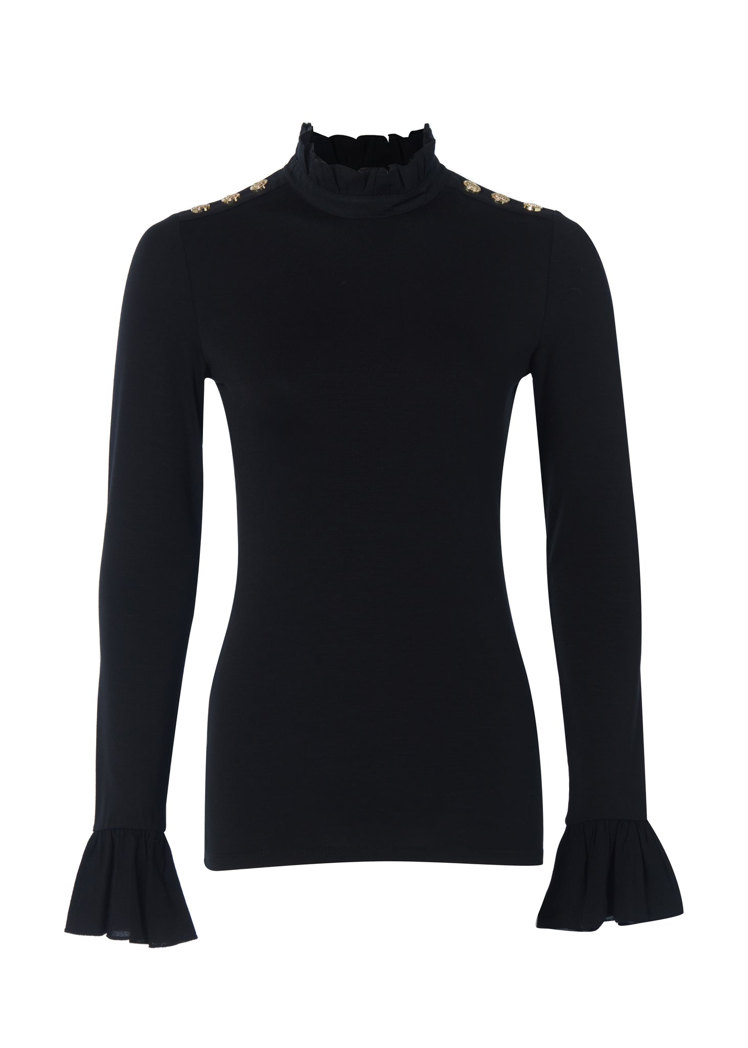 Created from a flawless and smooth fabric for a second-skin feel, this tee has been designed to become an everyday essential in your wardrobe. Designed with a body-contouring fit with a pretty ruffle neckline and cuffs, this piece is both flattering and elegant. Detailed with HC rivets on the shoulders.