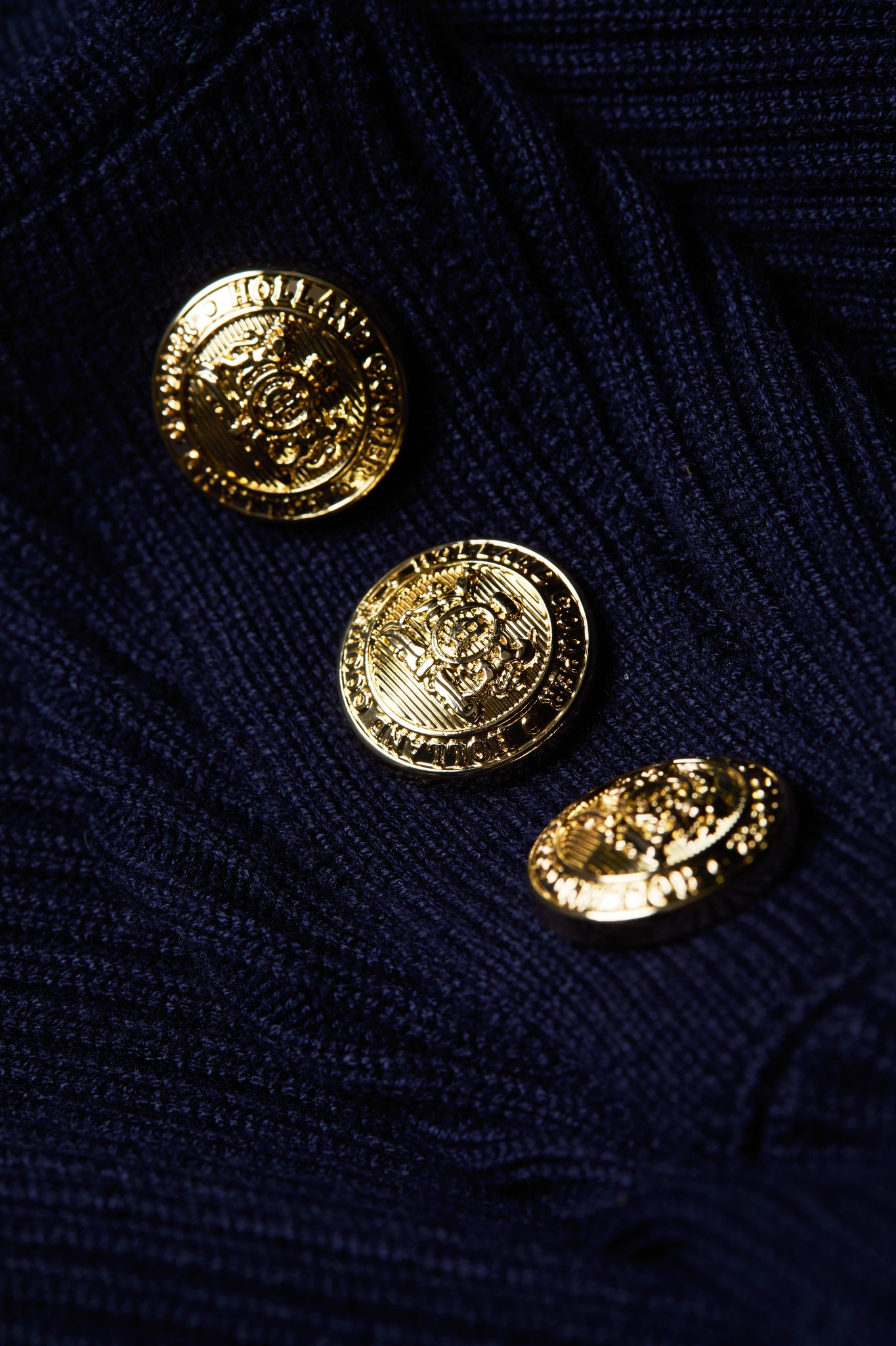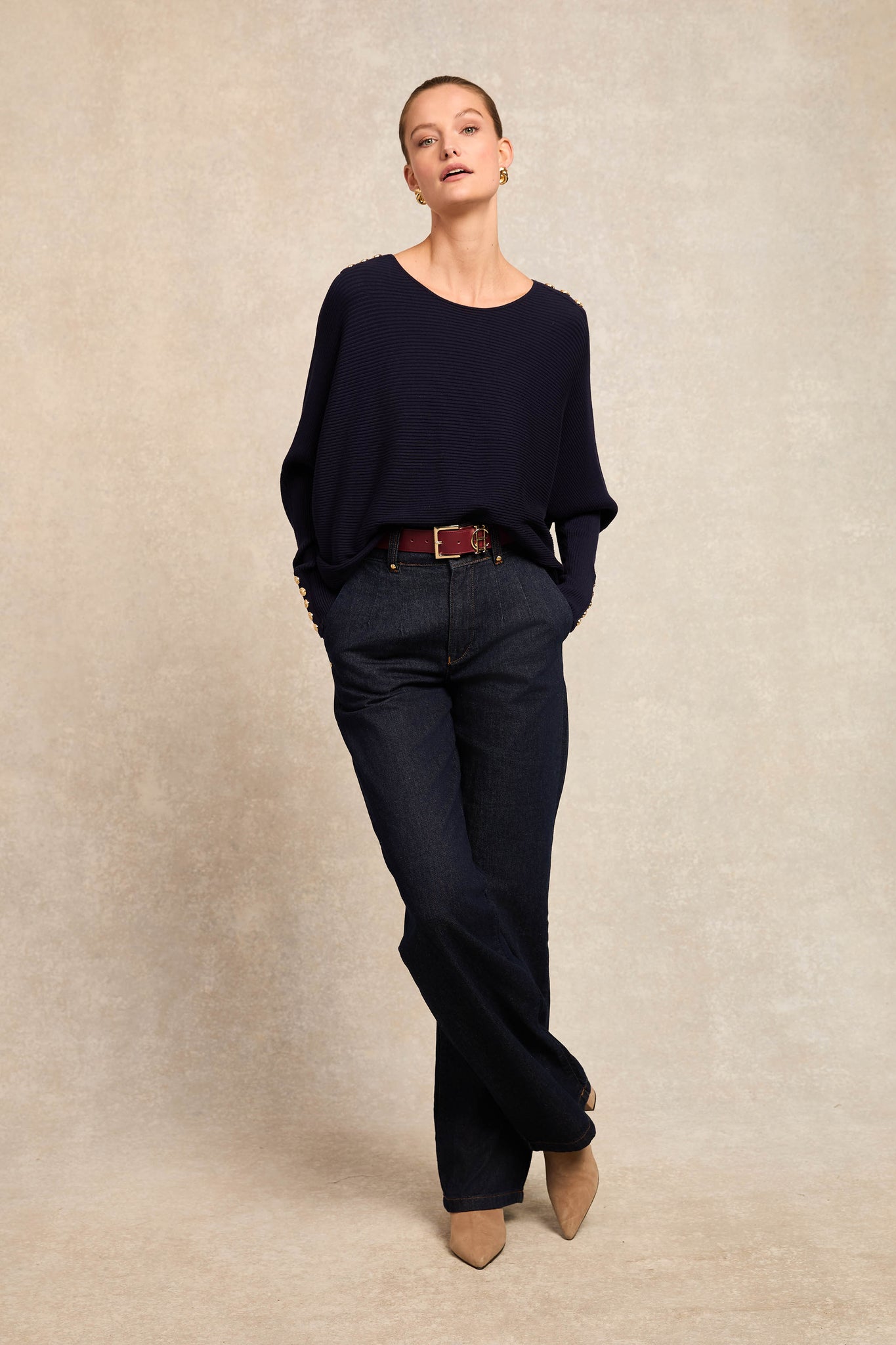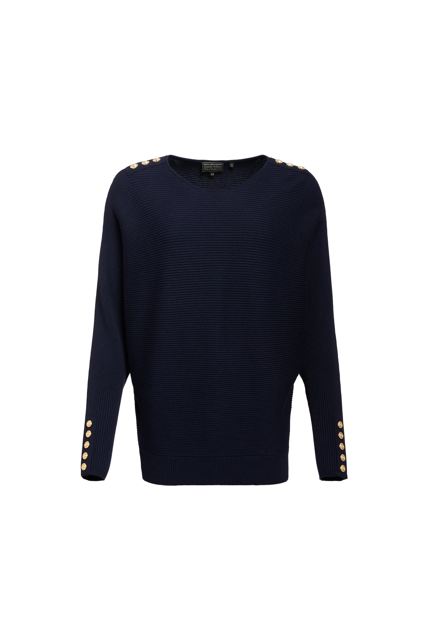 The Leyla Knit is a sophisticated staple, featuring a boat neck and batwing sleeves for a relaxed, yet elegant silhouette. The horizontal ribbed texture on the main body is complemented by a deep ribbed waistband, creating a flattering fit. Signature hardware on the shoulders and cuffs adds a refined touch, making this knit a perfect blend of comfort and style.