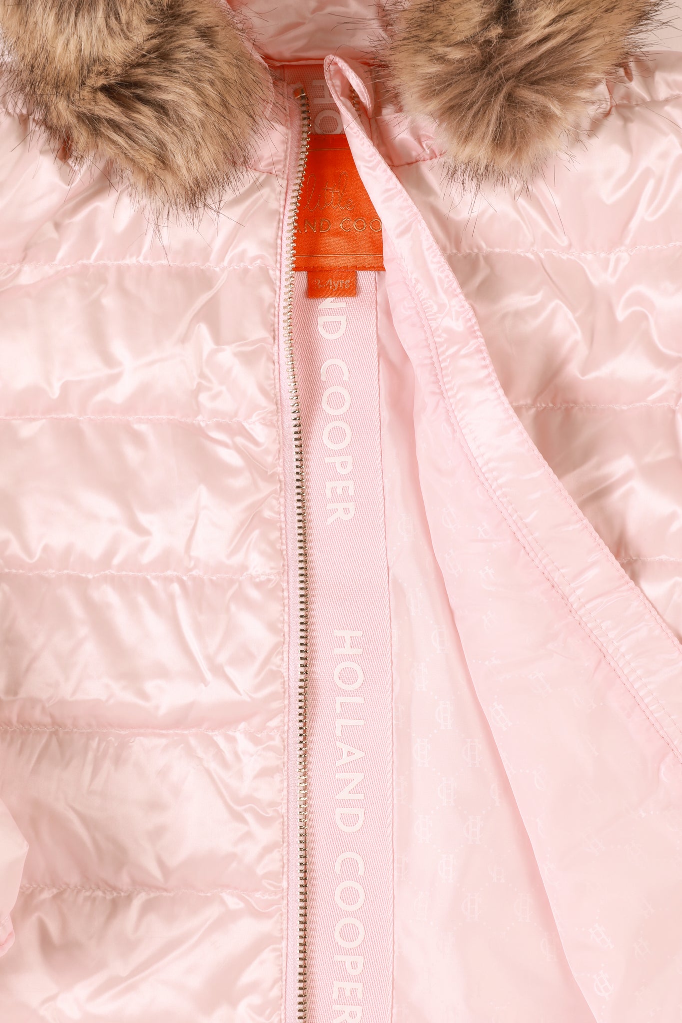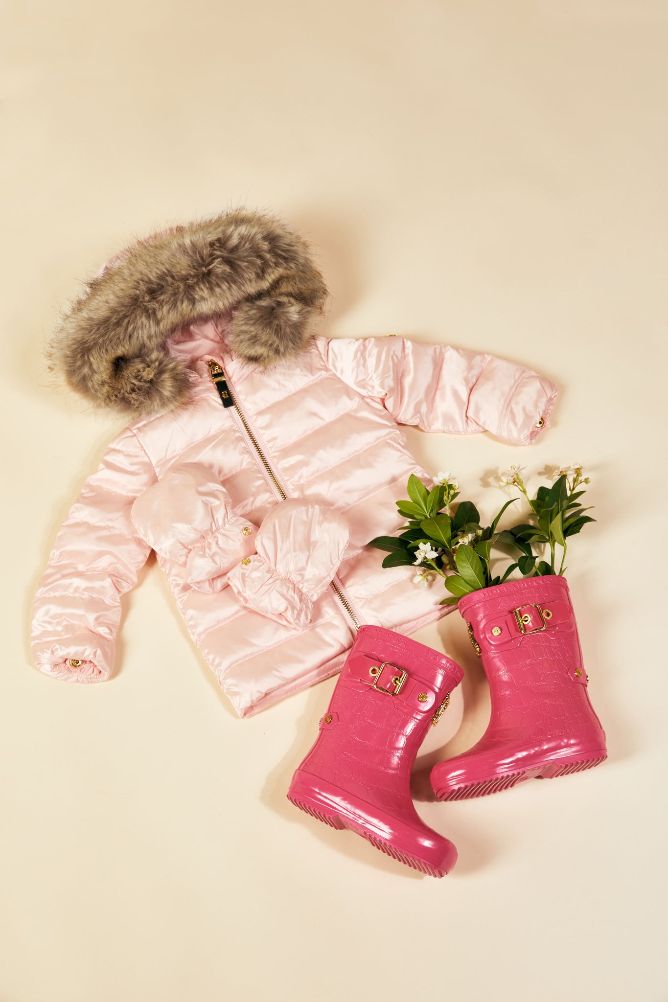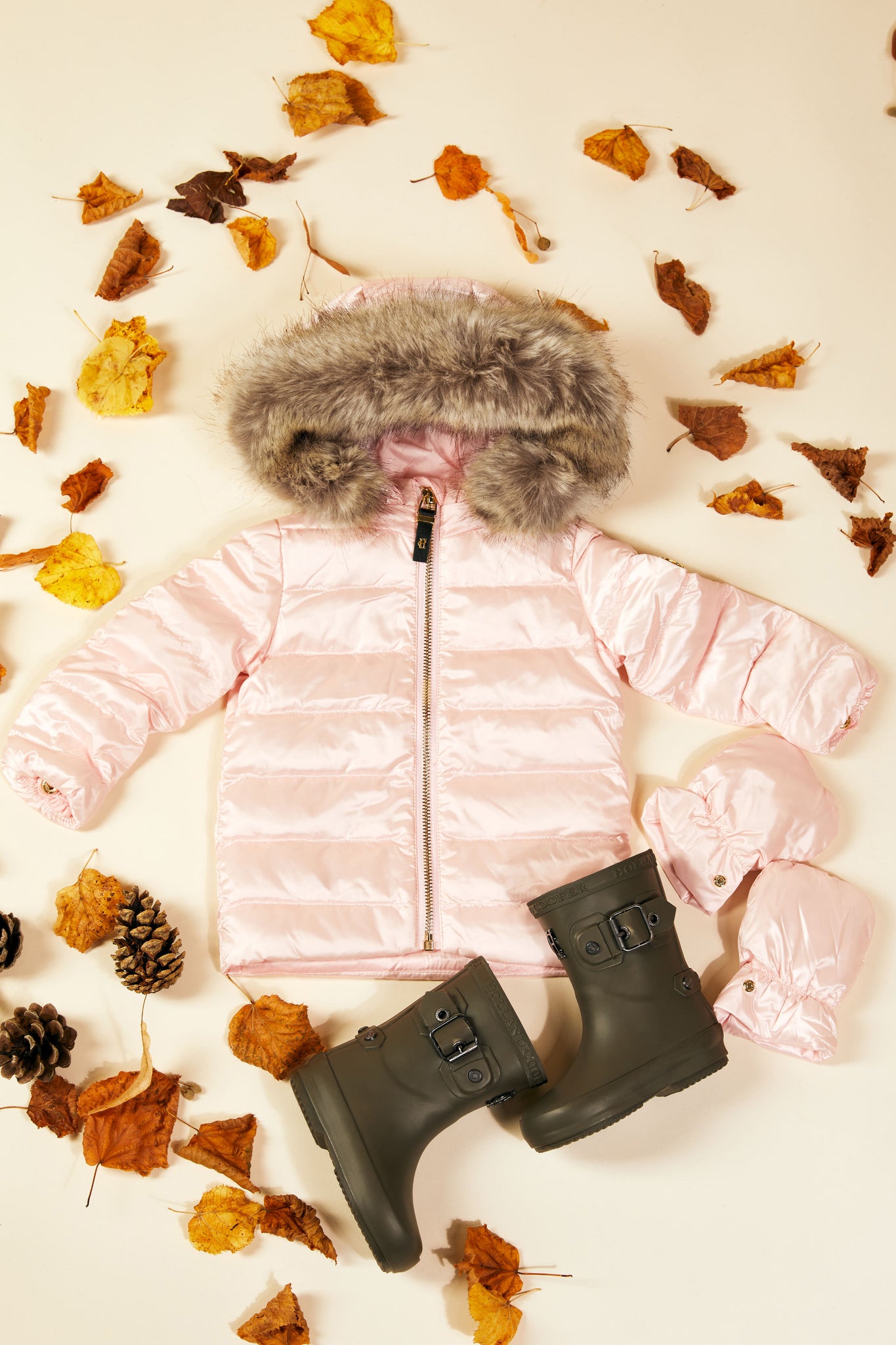 Designed with a responsibly sourced down fill and water-resistant, quilted outer shell, you can be sure to rely on this piece for practical dressing this winter. Detailed with a luxurious faux fur hood with an internal strap for keeping the cosy mittens attached for safe keeping and easy wear. Finished with our iconic gold hardware and zip detailing.