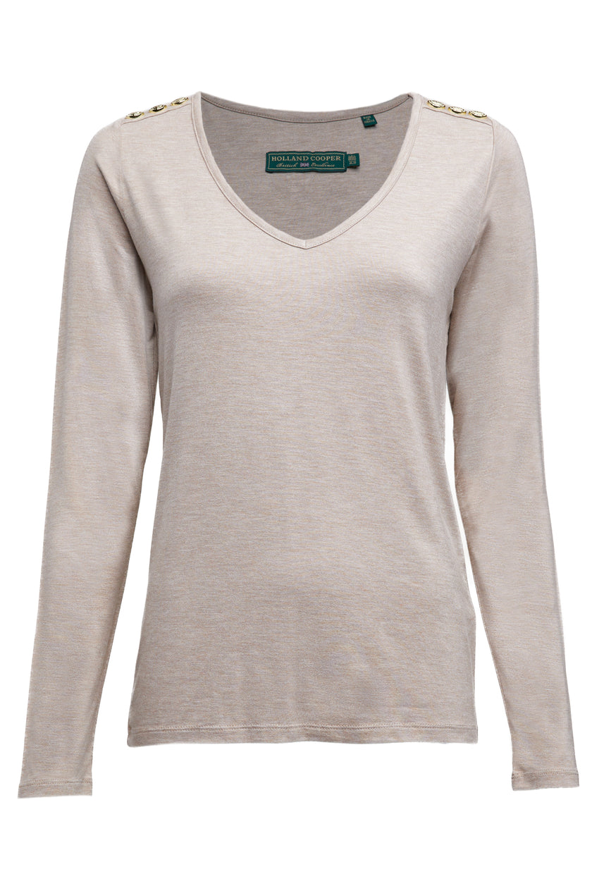 Both timeless and classic, our V-neck tees have been created from a super soft fabric. With long sleeves and a classic fit, this piece has been designed to last a lifetime in your wardrobe. Detailed with our gold rivets on the shoulder and cuffs.