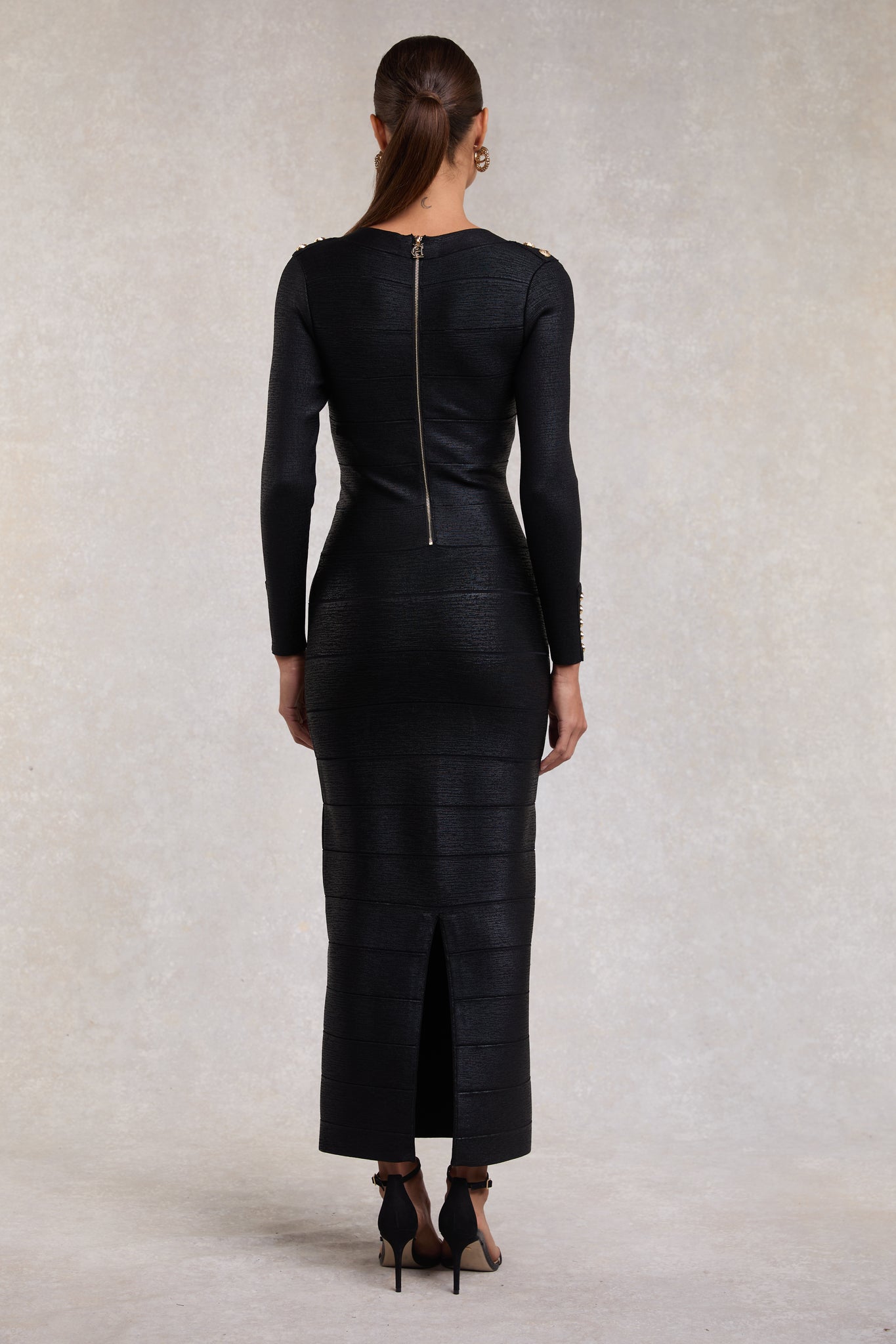 This dress is designed to sculpt and smooth the body for a flattering silhouette. Crafted with precision, this figure-hugging dress features slim sleeves and a chic scoop neckline, effortlessly combining elegance with allure. The maxi-length hem adds sophistication, while the striking black foil print across the body enhances the premium aesthetic. Finished with HC-branded gold zip pulls for a touch of signature luxury, this dress is perfect for making a bold, stylish statement. Ideal for evening events or special occasions.