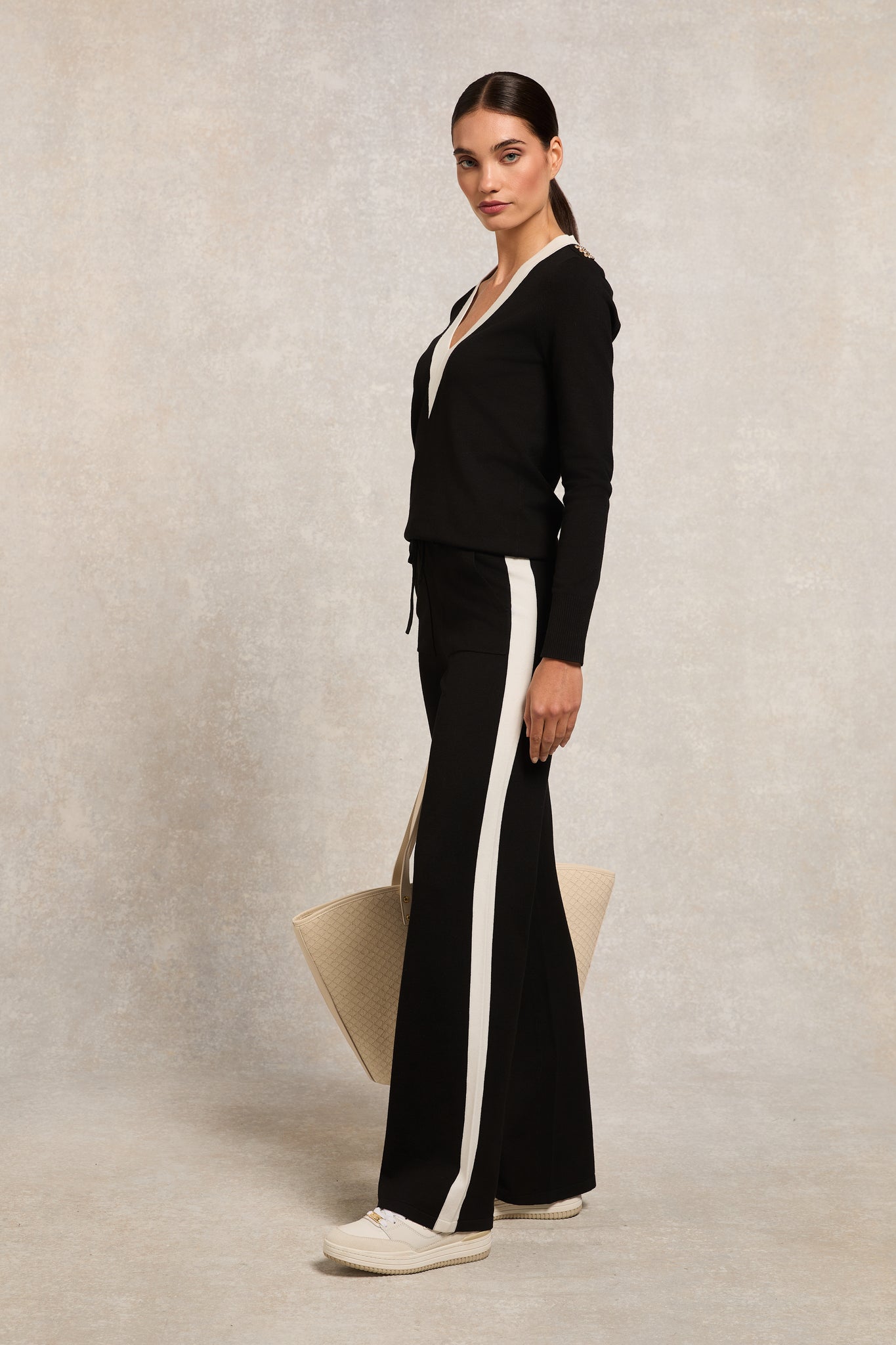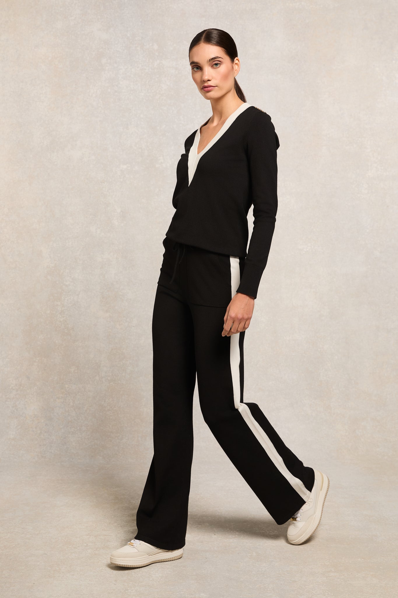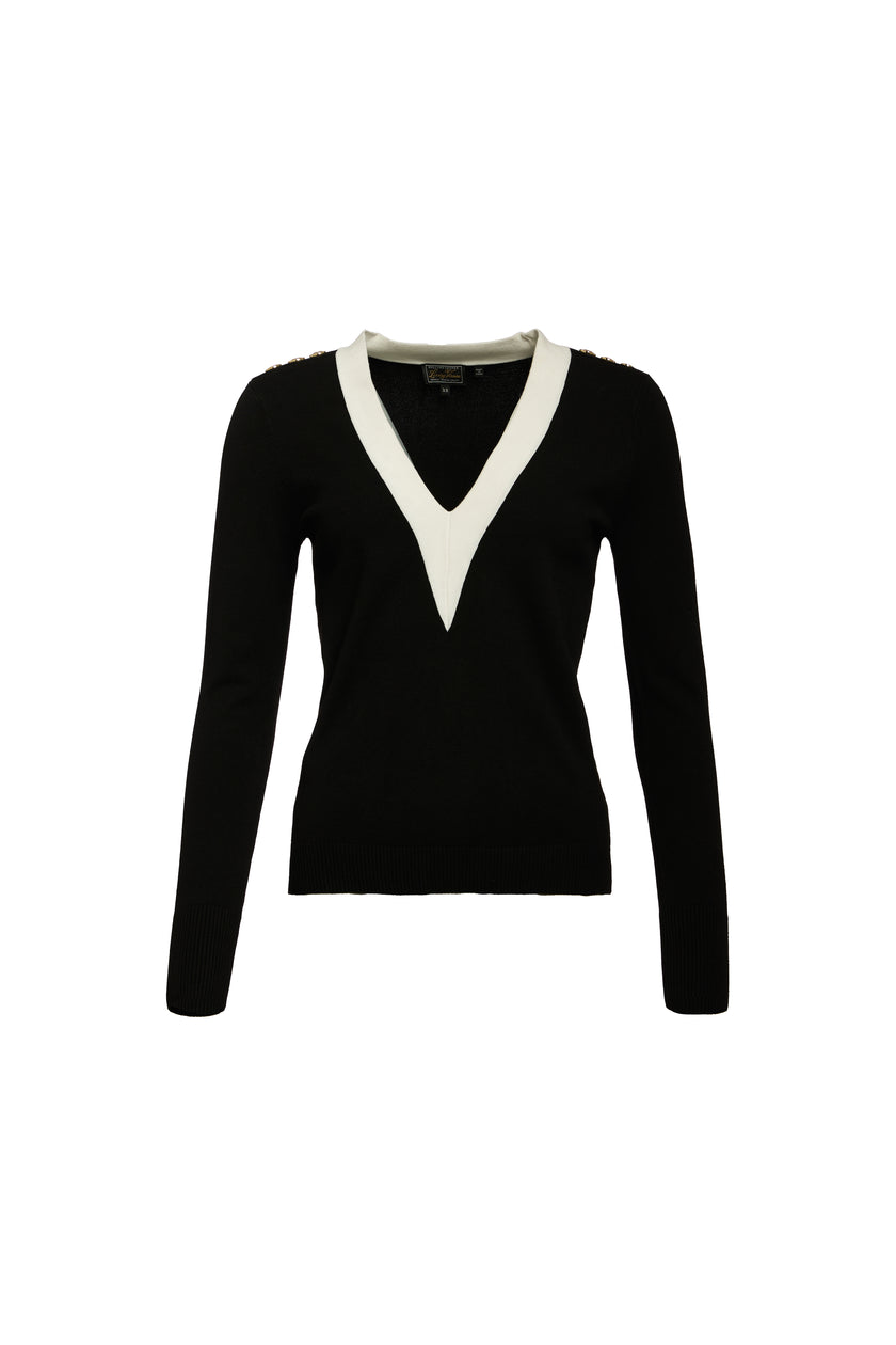 - Contrast deep V-neckline