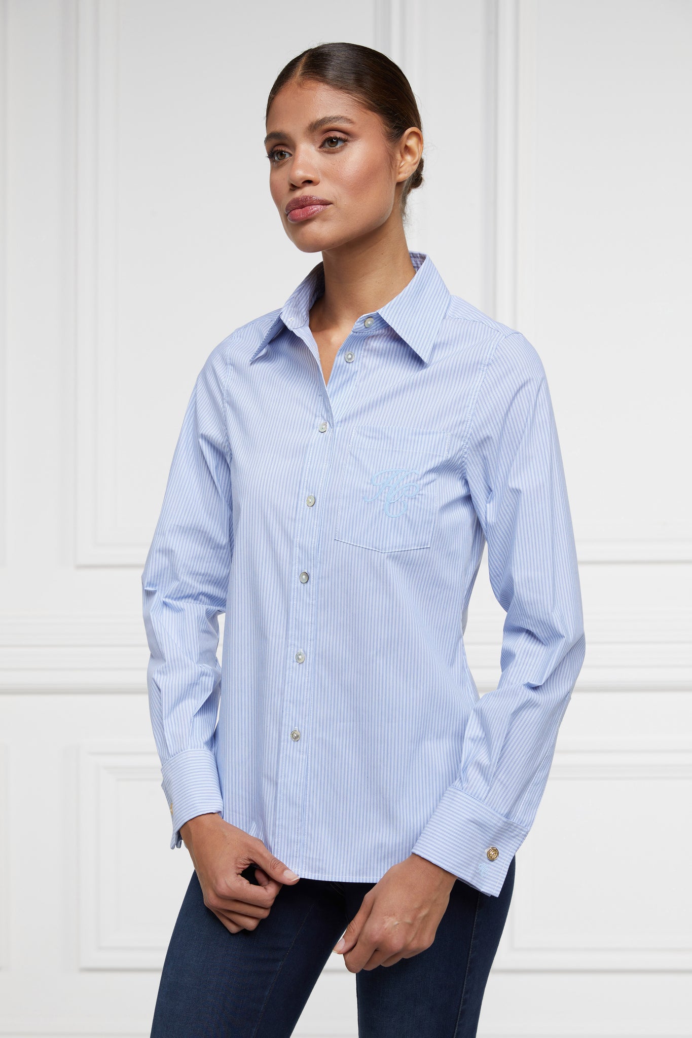 A modern twist on a classic favourite, this shirt has been crafted from crisp cotton poplin fabric. With a slim, tailored fit with double cuff construction, the classic collar shaping adds to the timeless elegance of this piece. Adorned with signature gold cuff links, engraved buttons on the front closure and elevated with elegant HC embroidery on the chest pocket.