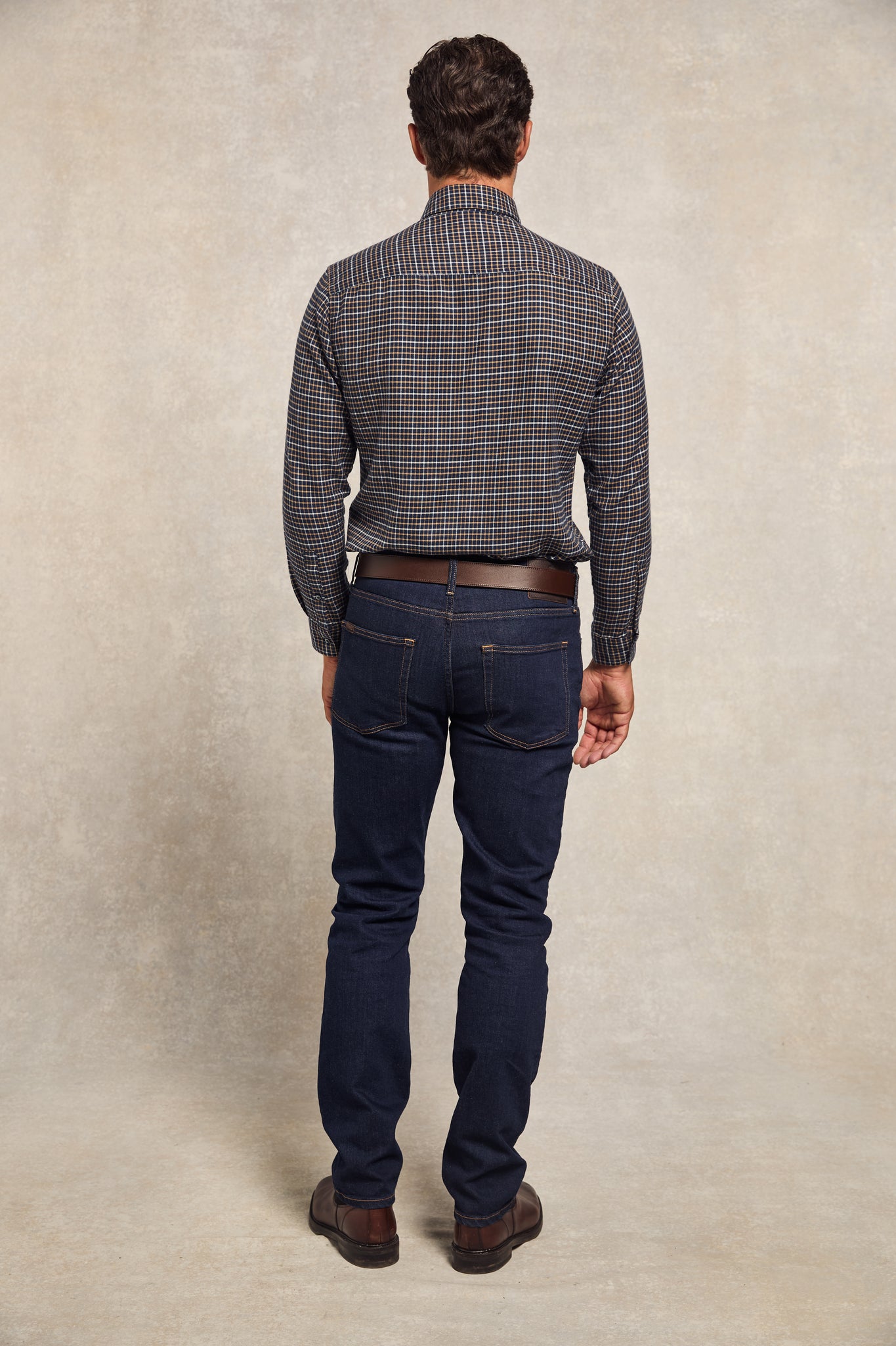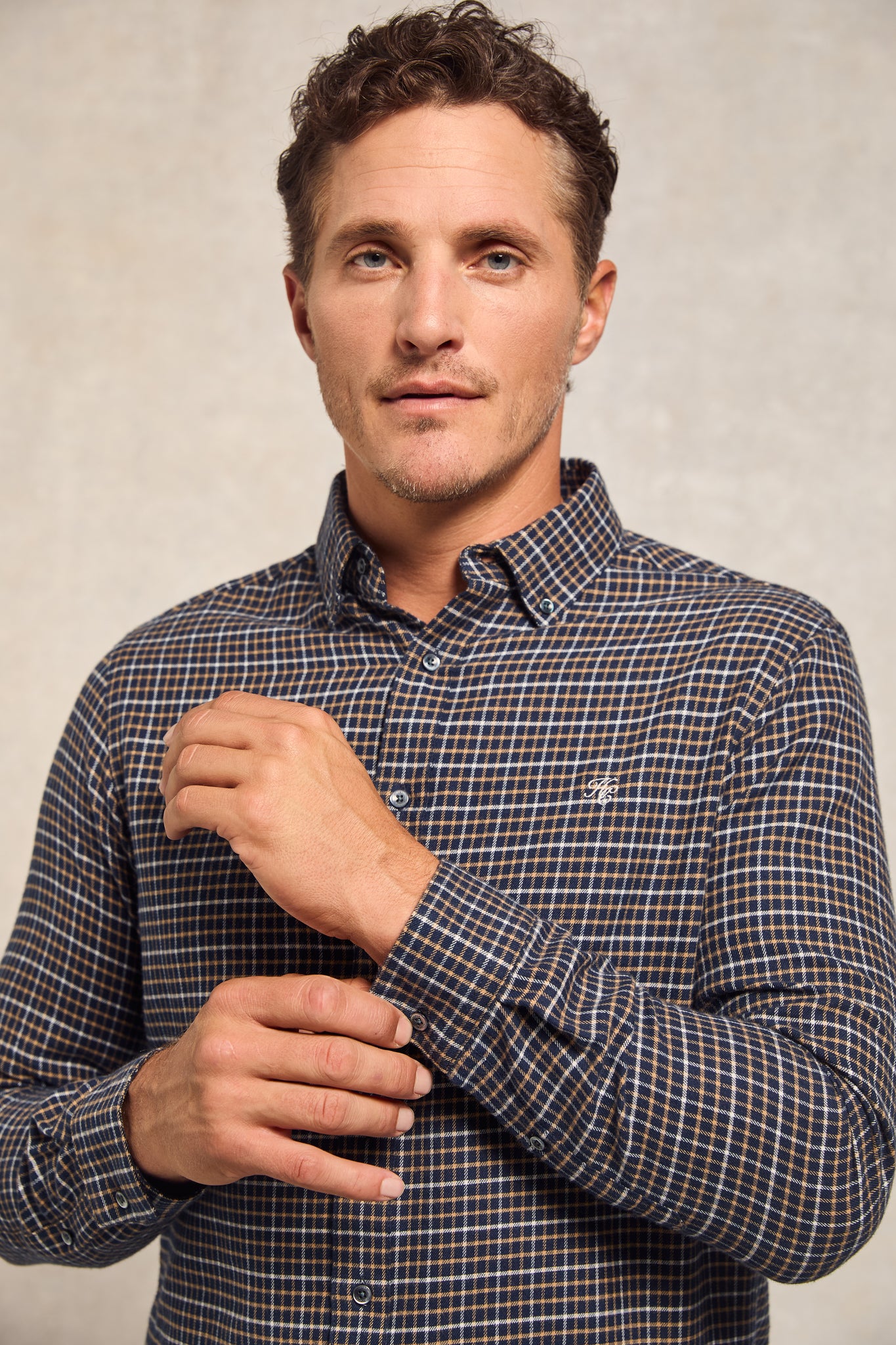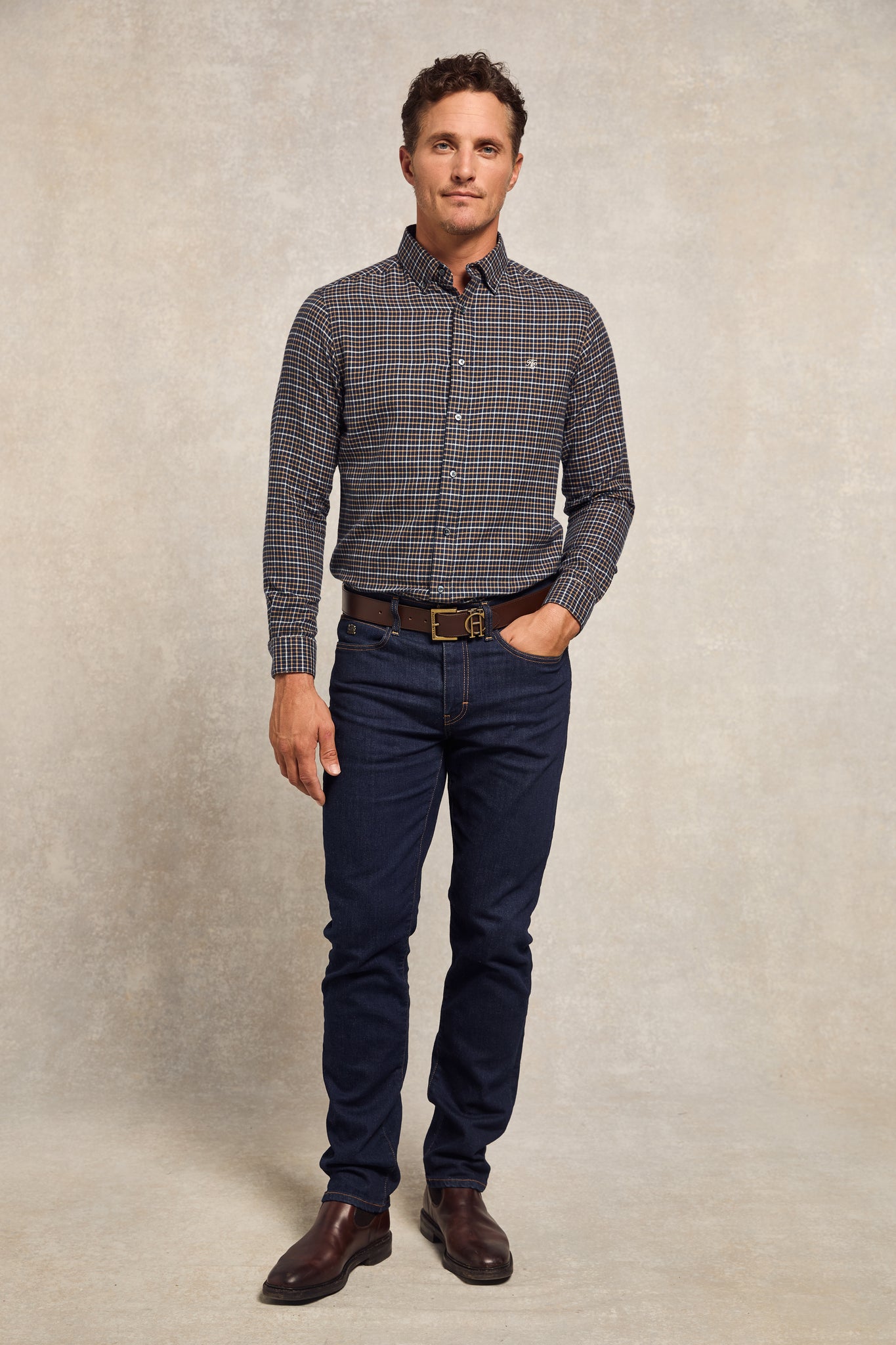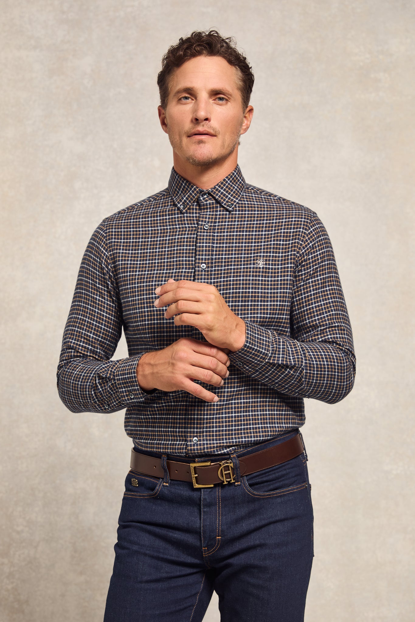 The Men’s Classic Button Down Shirt is a subtle yet timeless luxury piece, featuring a classic button-down collar and a slim fit for a sophisticated tailored look. Crafted from mid-weight brushed cotton, it offers comfort and durability. The shirt is adorned with mock pearl buttons engraved with HC branding, a single button cuff, and an embroidered mini HC on the chest. Traditional check designs and colourations add to its classic appeal, while woven branding labels on the back neck and front placket provide a refined finish on our iteration of this timeless staple piece.