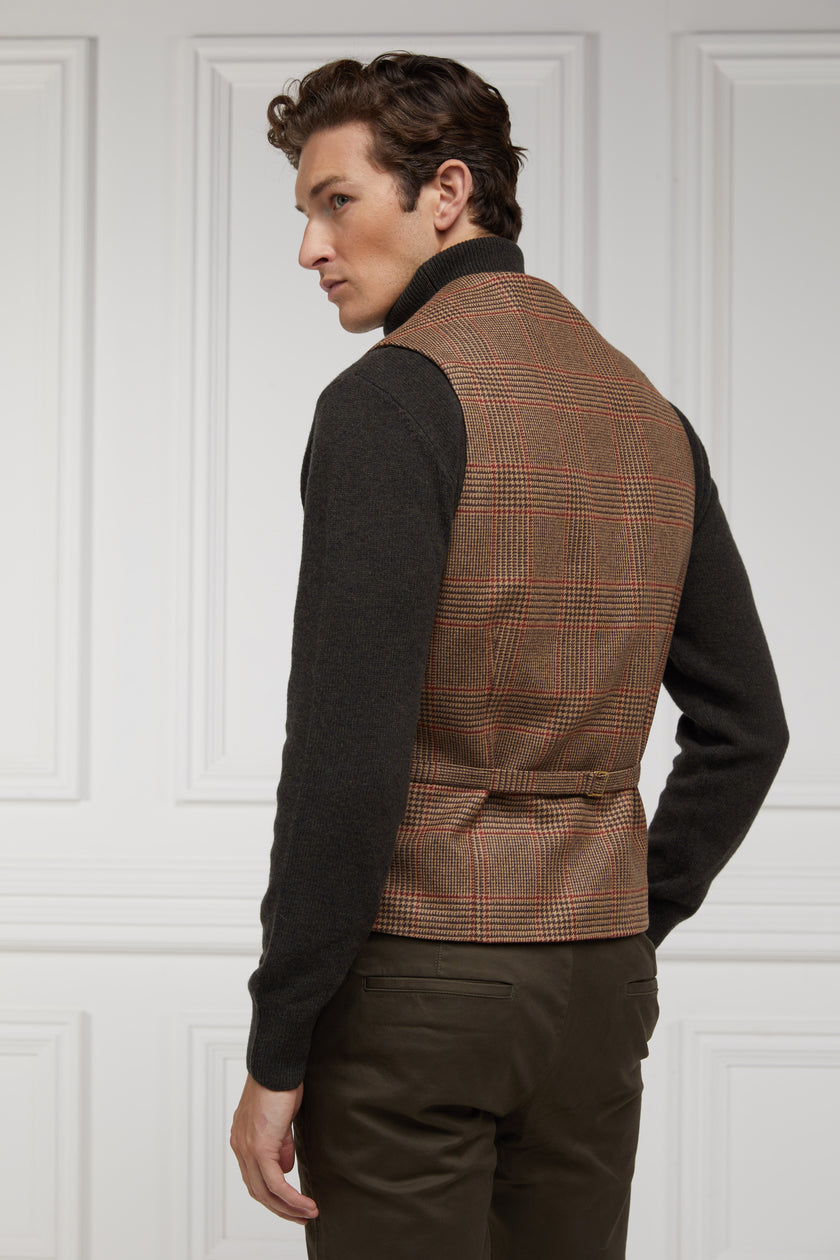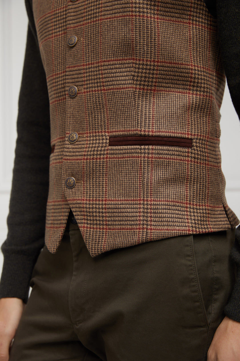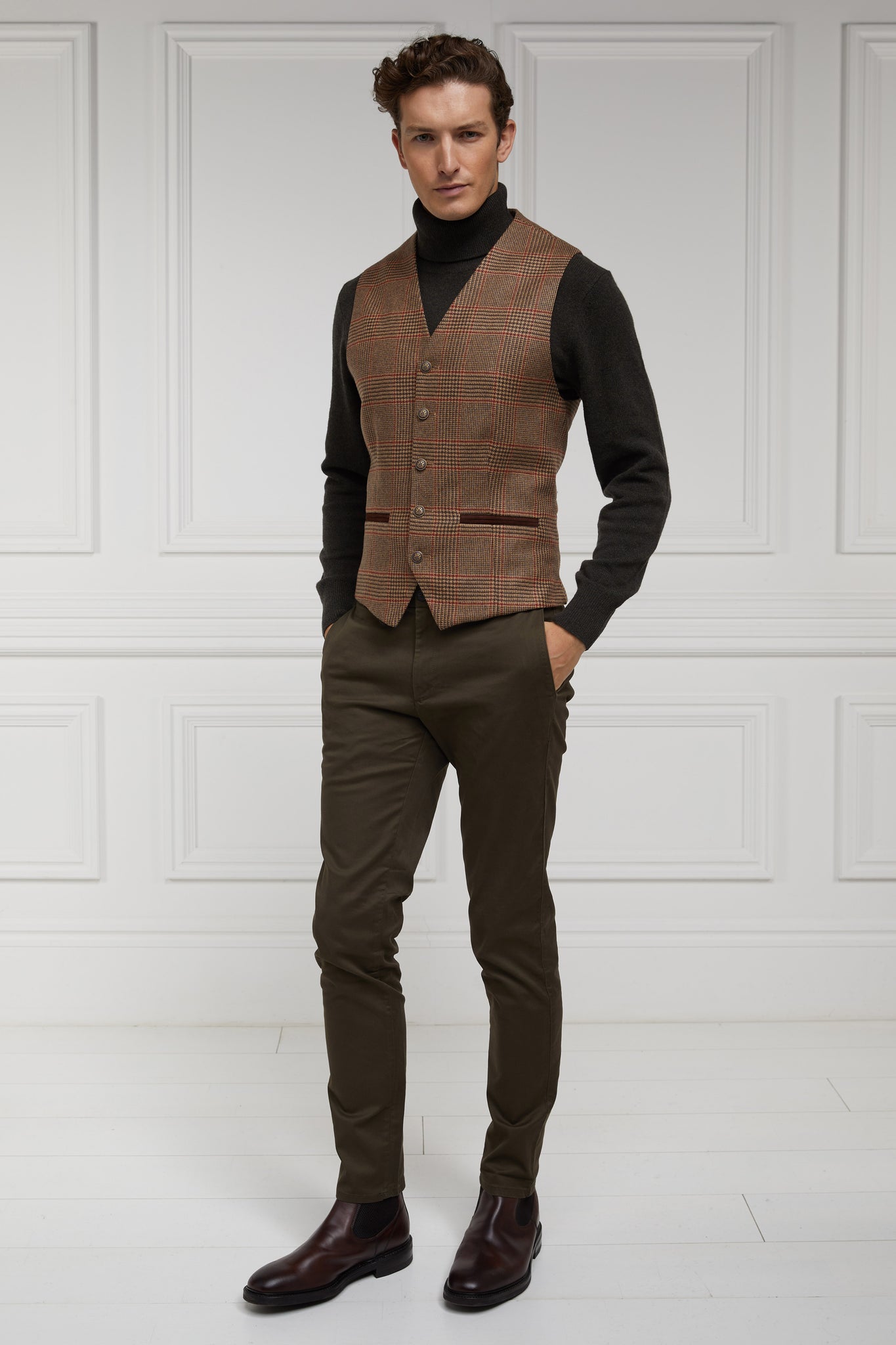 Both classic and refined, our St James Waistcoat has been beautifully crafted in the UK from the finest of heritage wools. With a timeless, single breasted silhouette with slim-fitting construction, this waistcoat is an essential in every gentleman's wardrobe. With a satin twill lining with an interior double welt pocket and functional pocket detailing to the front, this piece is both classic and practical. Finished with our signature detailing and elevated with our subtle metallic buttons.