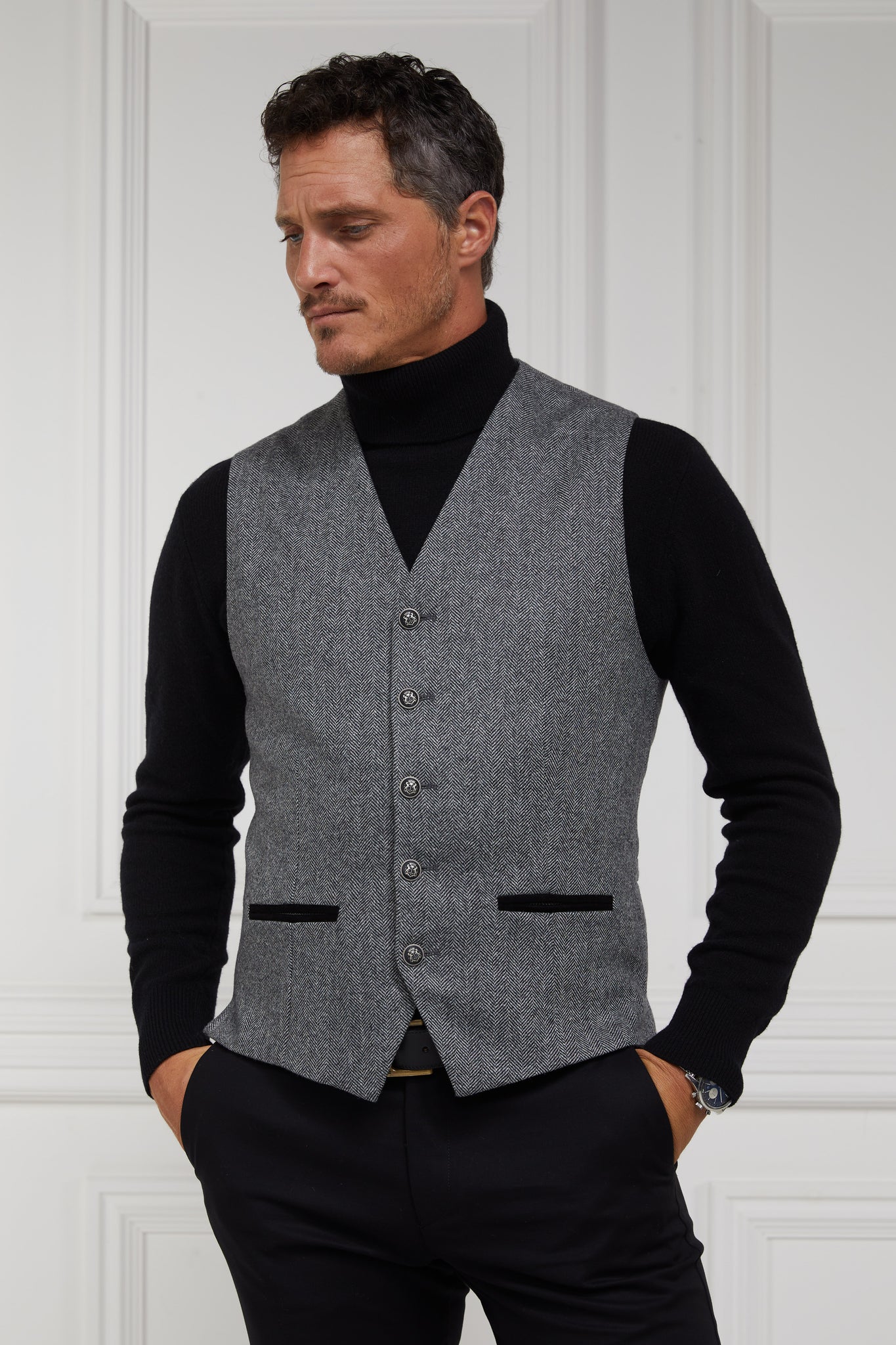 Both classic and refined, our St James Waistcoat has been beautifully crafted in the UK from the finest of heritage wools. With a timeless, single breasted silhouette with slim-fitting construction, this waistcoat is an essential in every gentleman's wardrobe. With a satin twill lining with an interior double welt pocket and functional pocket detailing to the front, this piece is both classic and practical. Finished with our signature detailing and elevated with our subtle metallic buttons.