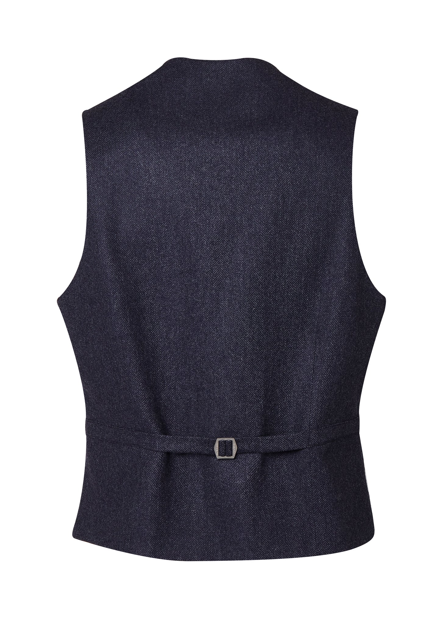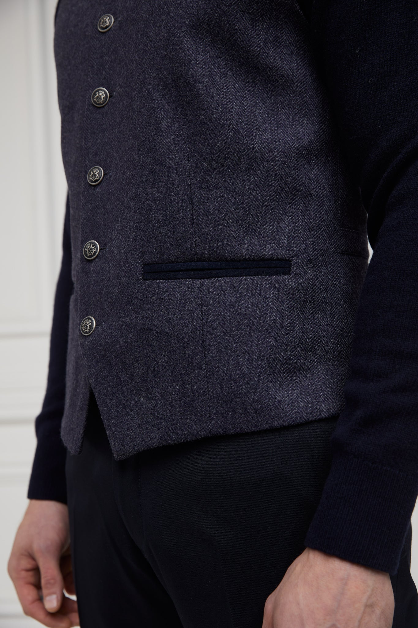 Both classic and refined, our St James Waistcoat has been beautifully crafted in the UK from the finest of heritage wools. With a timeless, single breasted silhouette with slim-fitting construction, this waistcoat is an essential in every gentleman's wardrobe. With a satin twill lining with an interior double welt pocket and functional pocket detailing to the front, this piece is both classic and practical. Finished with our signature detailing and elevated with our subtle metallic buttons.
