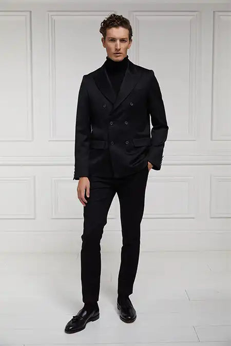 Our double breasted blazer is a nod to classic British tailoring, hand cut and crafted in the UK from heritage British woven wools. Crafted with notch lapels, slightly padded shoulders and a single vent to the centre back for a sharp cutting look. Detailed with corozo buttons, functional cuff button detailing and accentuated with a contrast hidden fabric detail to the underside of the collar. Lined in a luxurious satin twill lining with internal double welt ticket pocket, this blazer is the epitome of sophistication.