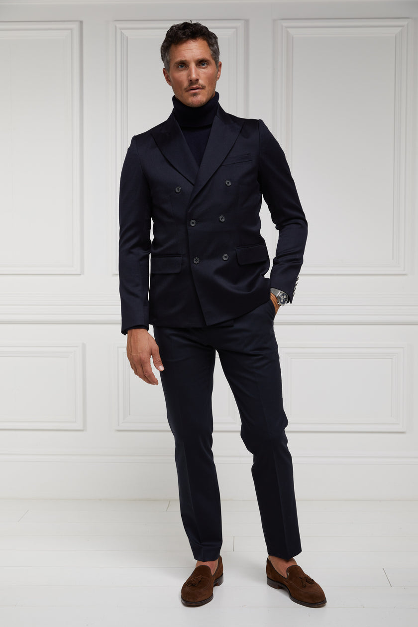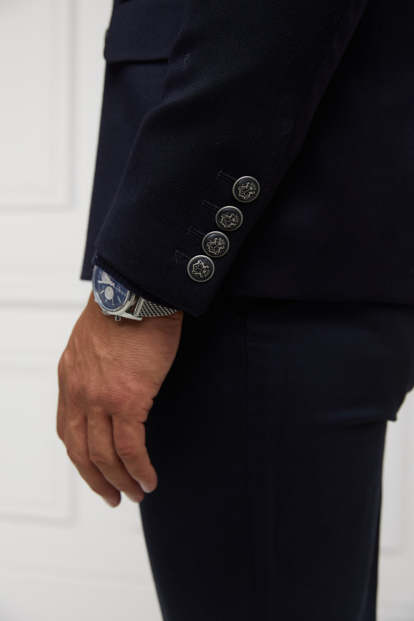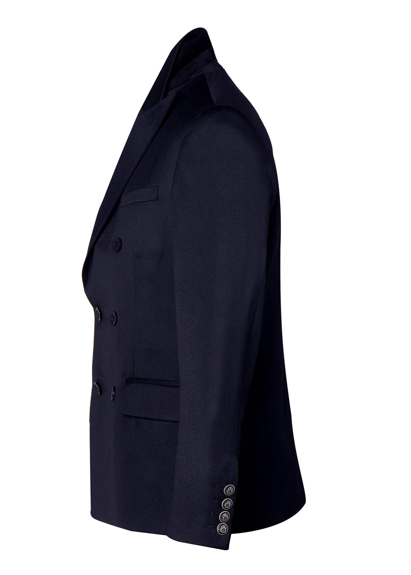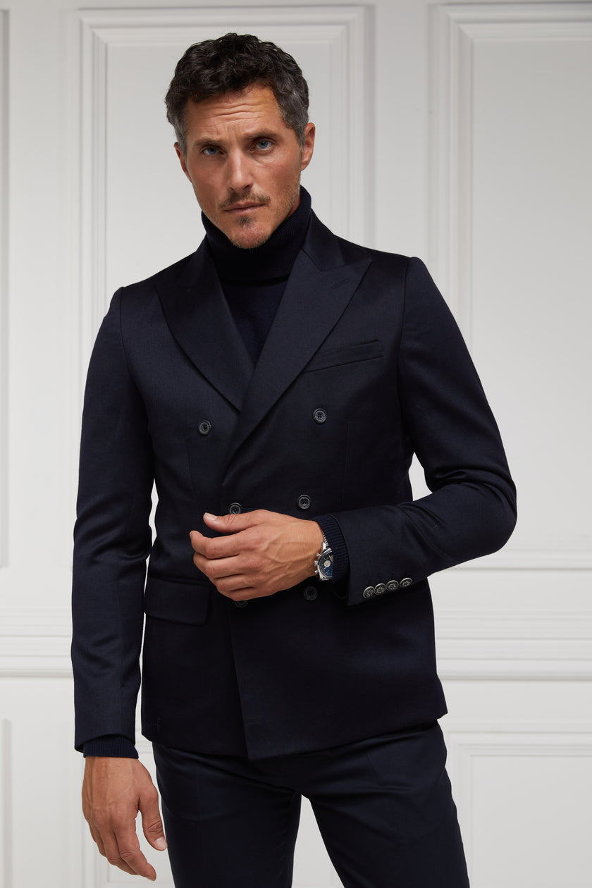 Our double breasted blazer is a nod to classic British tailoring, hand cut and crafted in the UK from heritage British woven wools. Crafted with notch lapels, slightly padded shoulders and a single vent to the centre back for a sharp cutting look. Detailed with corozo buttons, functional cuff button detailing and accentuated with a contrast hidden fabric detail to the underside of the collar. Lined in a luxurious satin twill lining with internal double welt ticket pocket, this blazer is the epitome of sophistication.