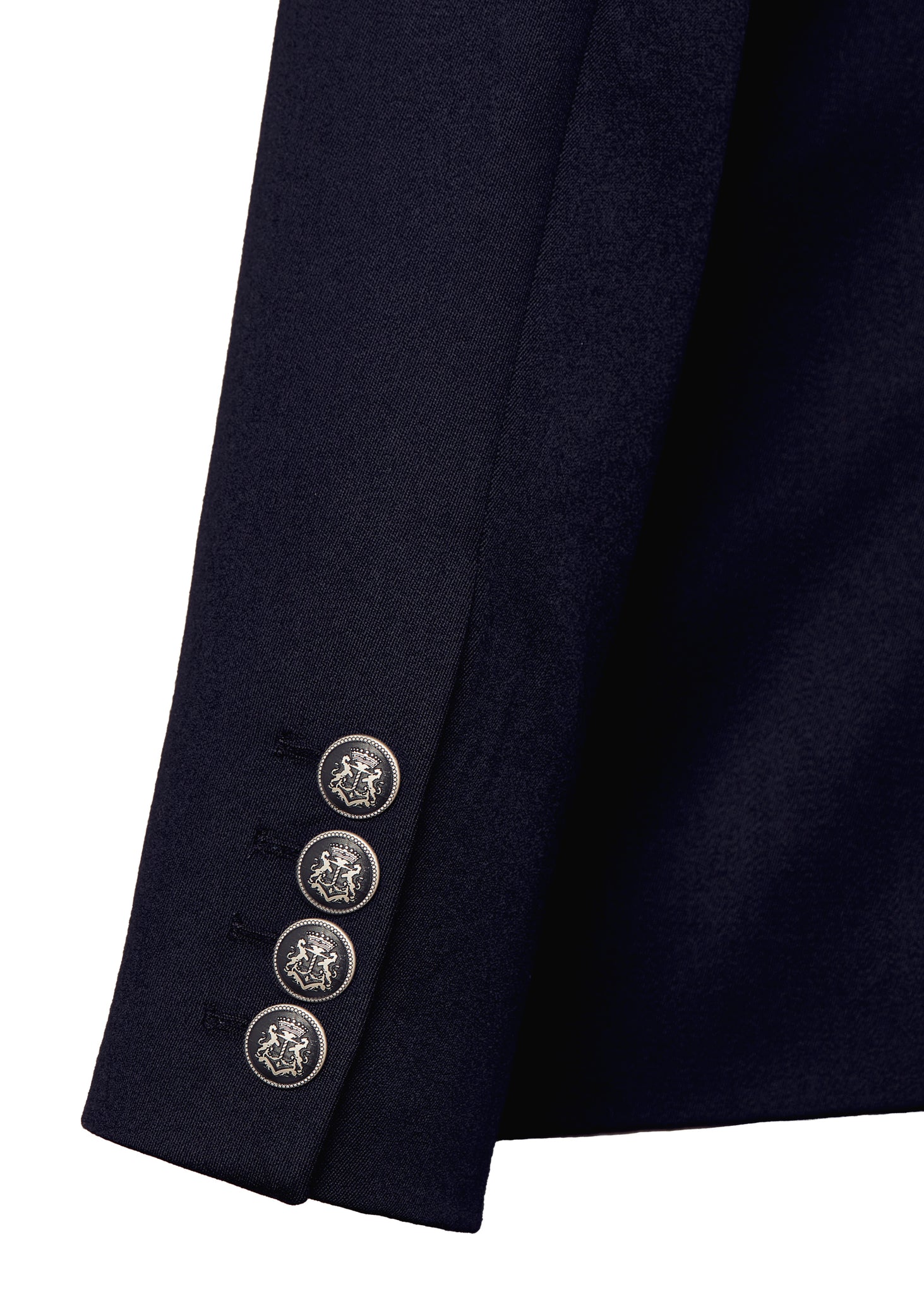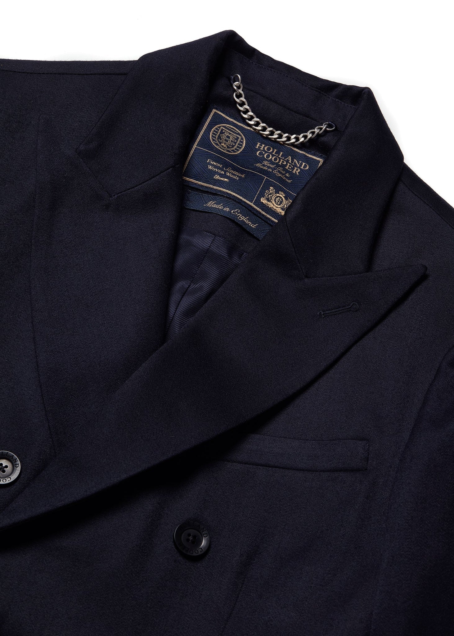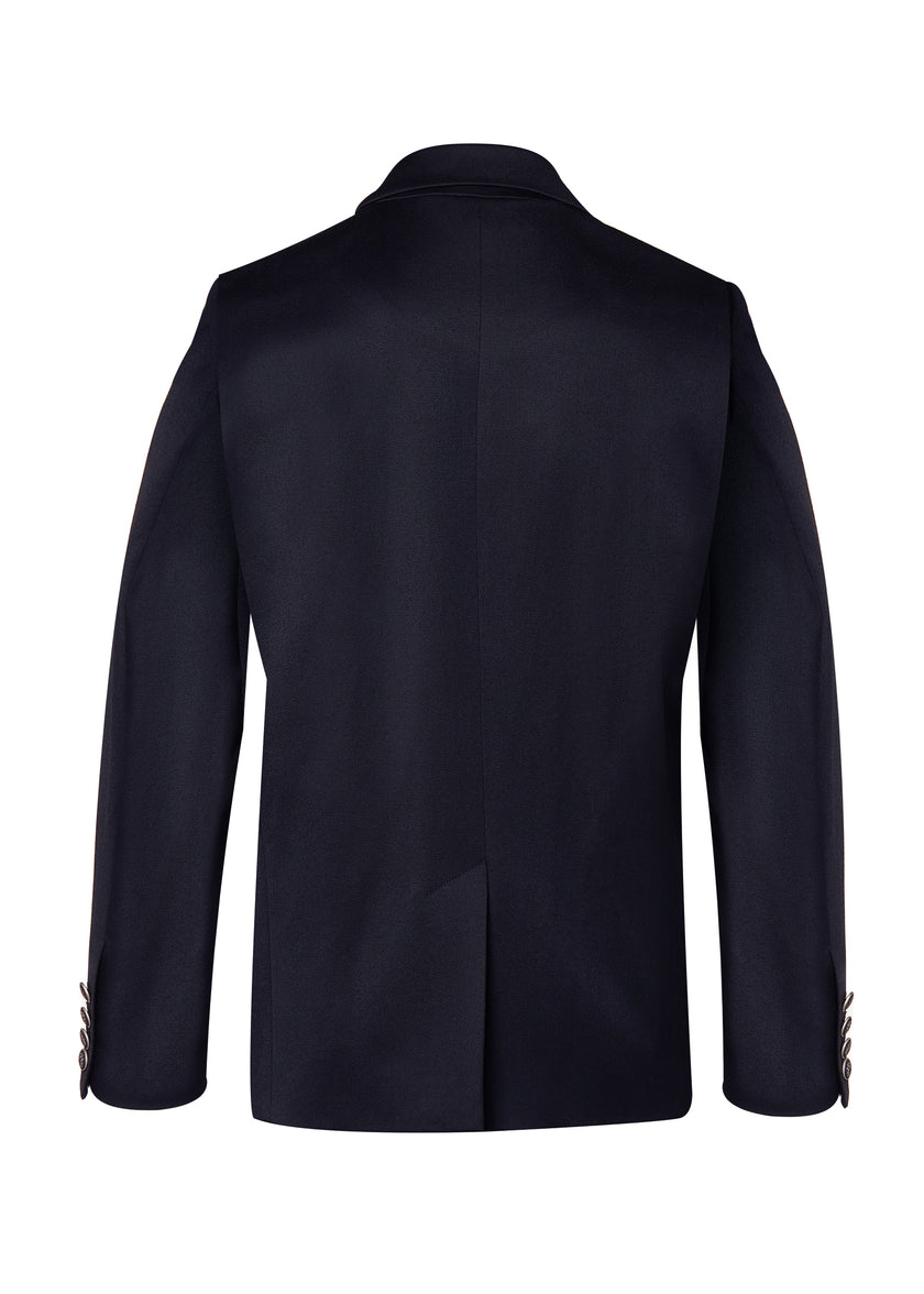 Our double breasted blazer is a nod to classic British tailoring, hand cut and crafted in the UK from heritage British woven wools. Crafted with notch lapels, slightly padded shoulders and a single vent to the centre back for a sharp cutting look. Detailed with corozo buttons, functional cuff button detailing and accentuated with a contrast hidden fabric detail to the underside of the collar. Lined in a luxurious satin twill lining with internal double welt ticket pocket, this blazer is the epitome of sophistication.