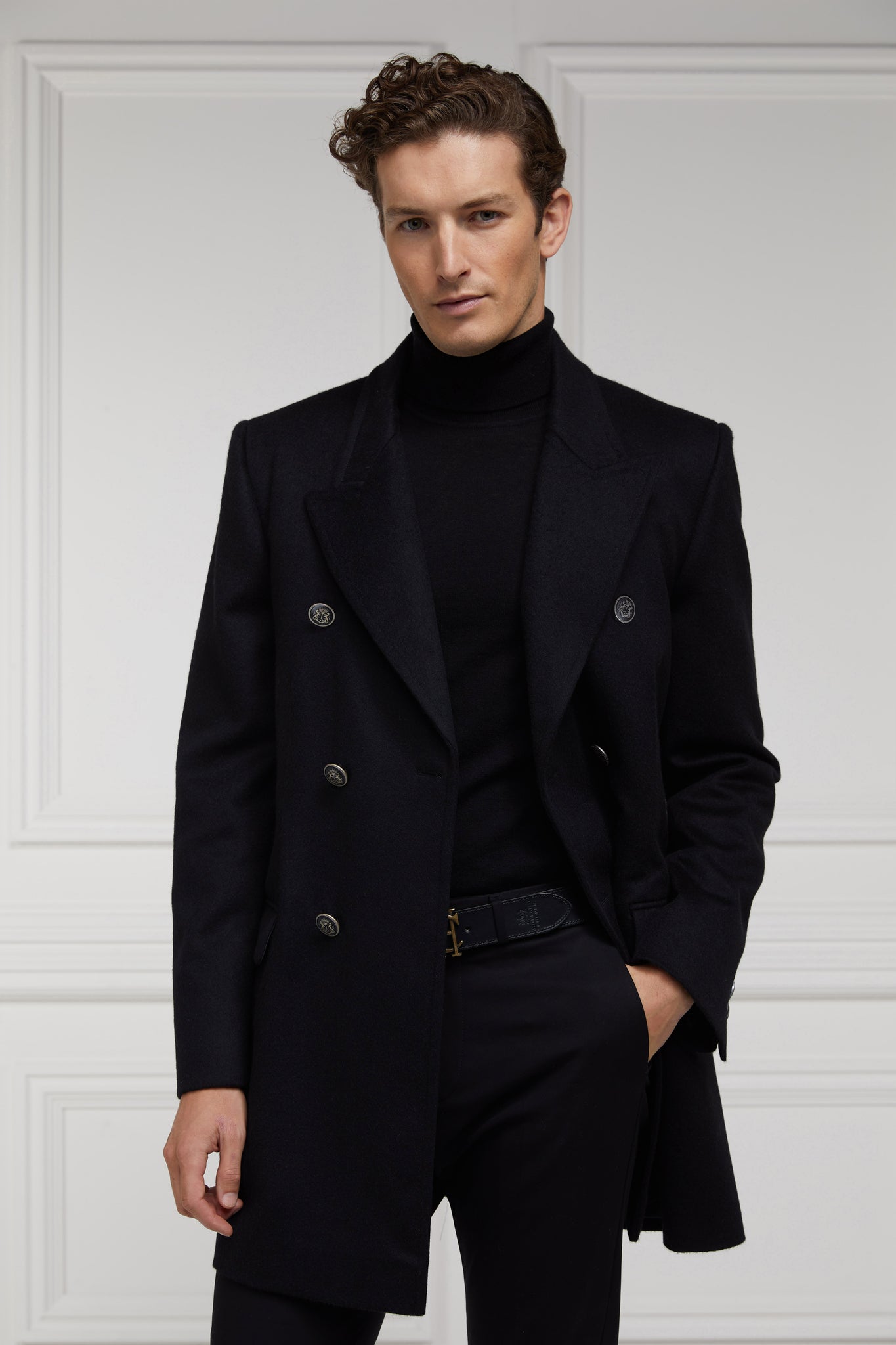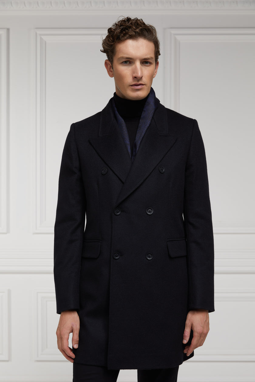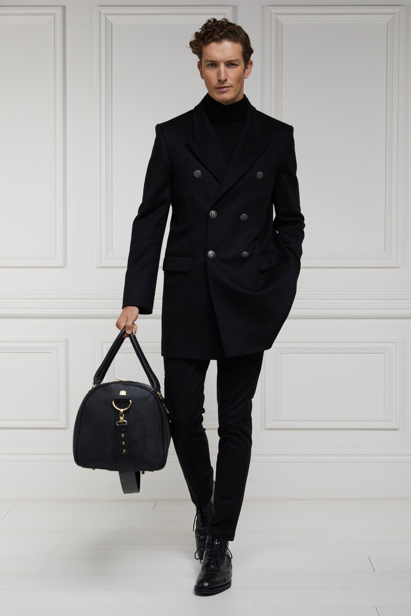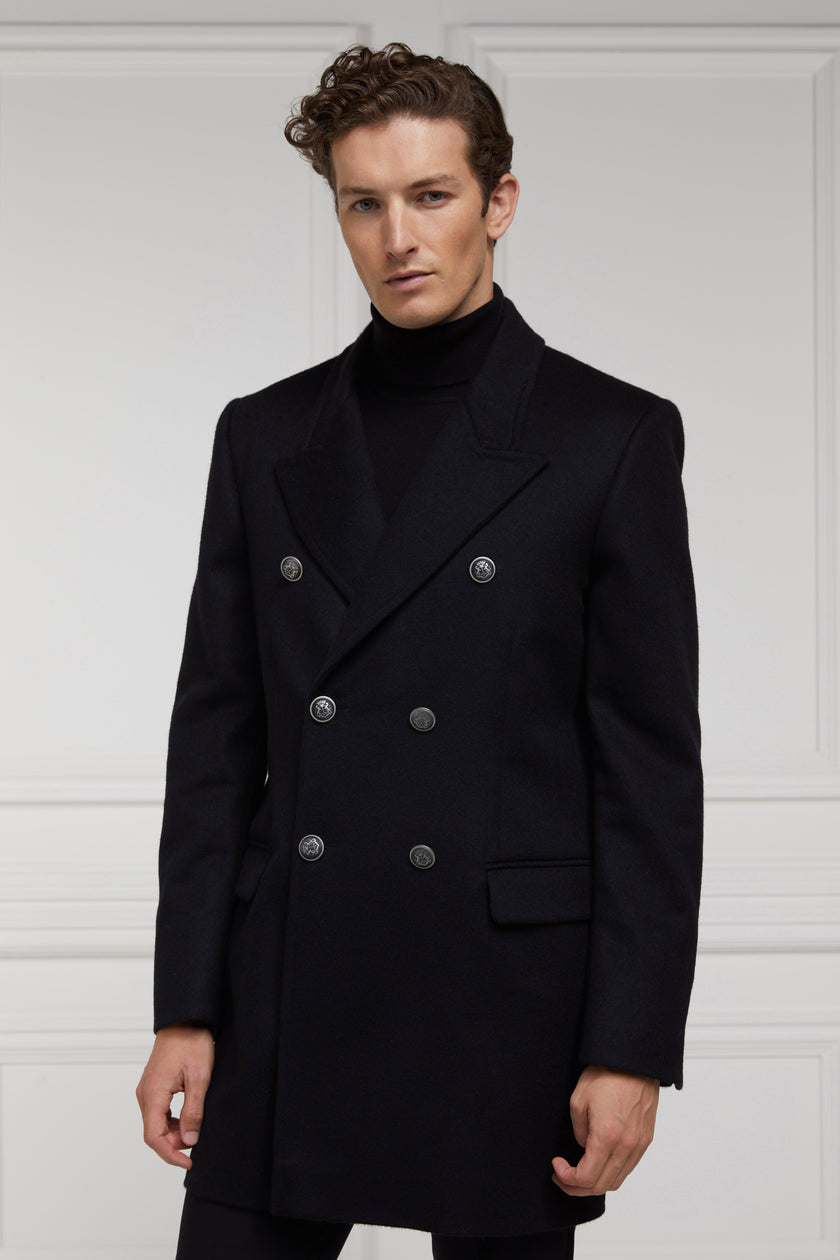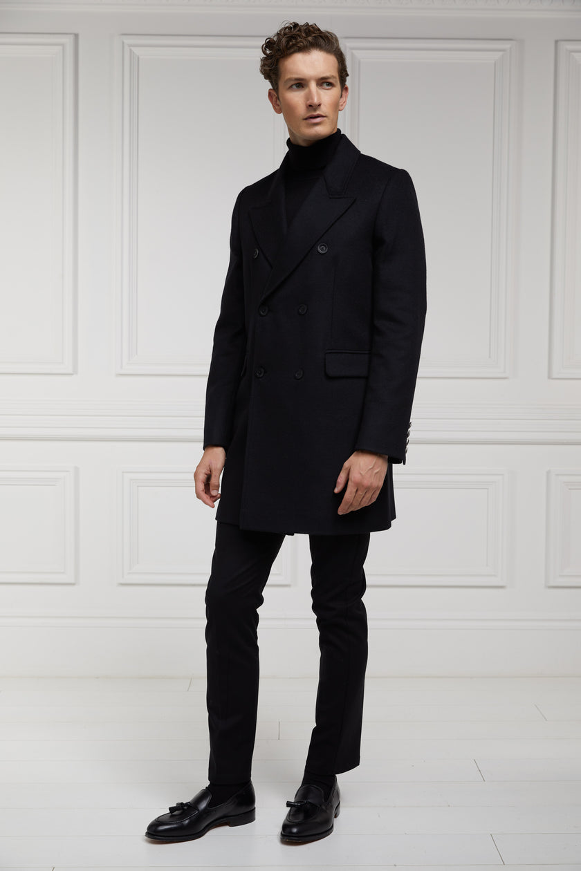 Hand crafted in the UK using the finest wools and meticulously tailored for a crisp, clean appearance, the Double Breasted Coat is the epitome of classic tailoring. With a mid-length silhouette and double breasted, button closure, this coat is framed by slightly padded shoulders for a sharp fit. Tailored with articulated sleeves and classic notch lapels, the double-welt pocket detail has been elevated with a mock horn button closure. Finished with a contrasting under collar for a statement wear with practical chain hanger loop on the inside.