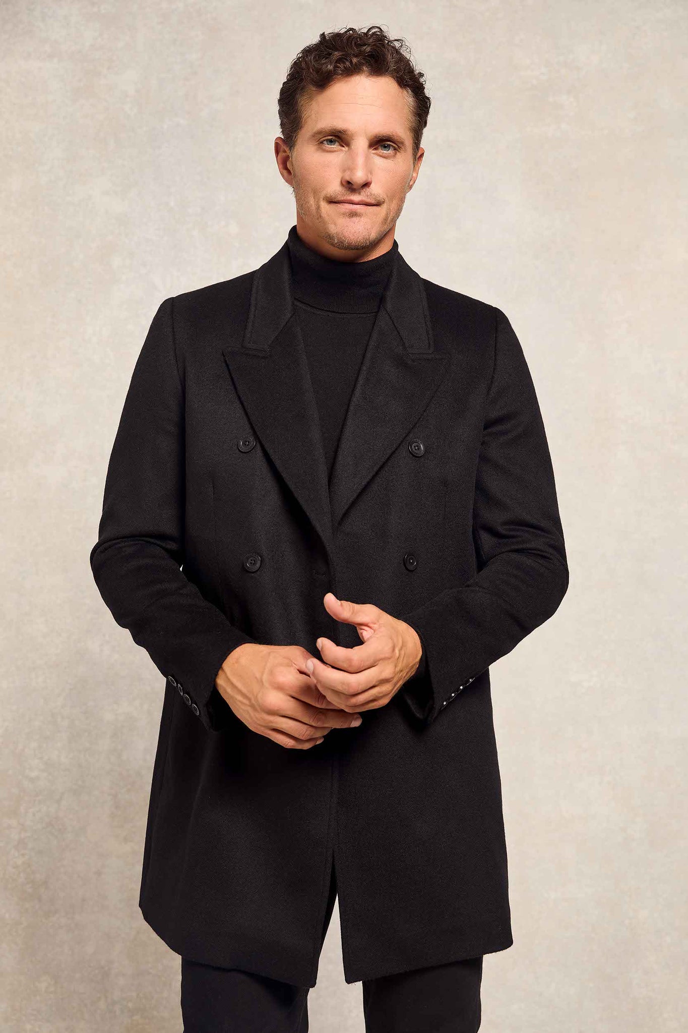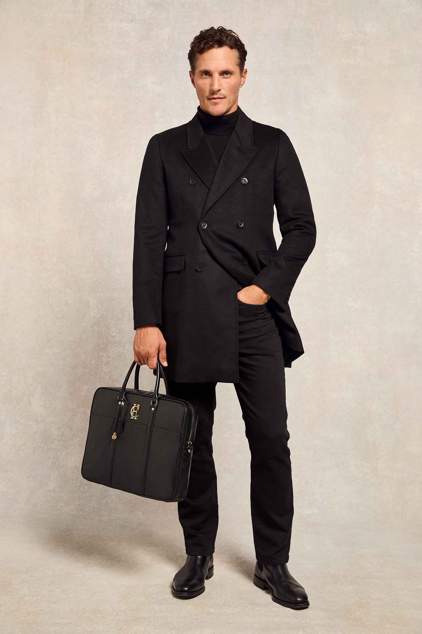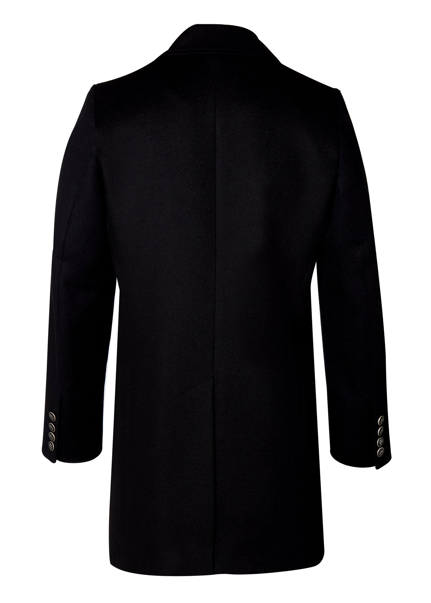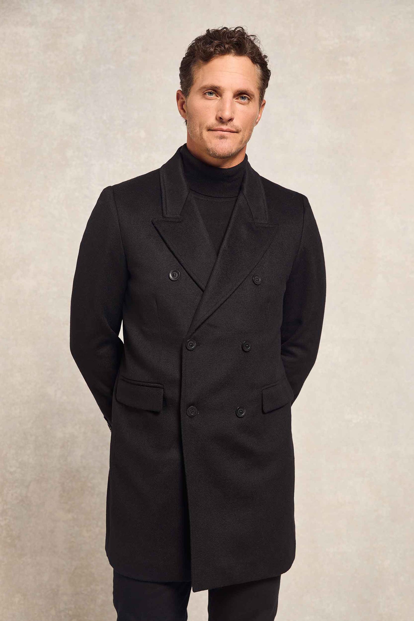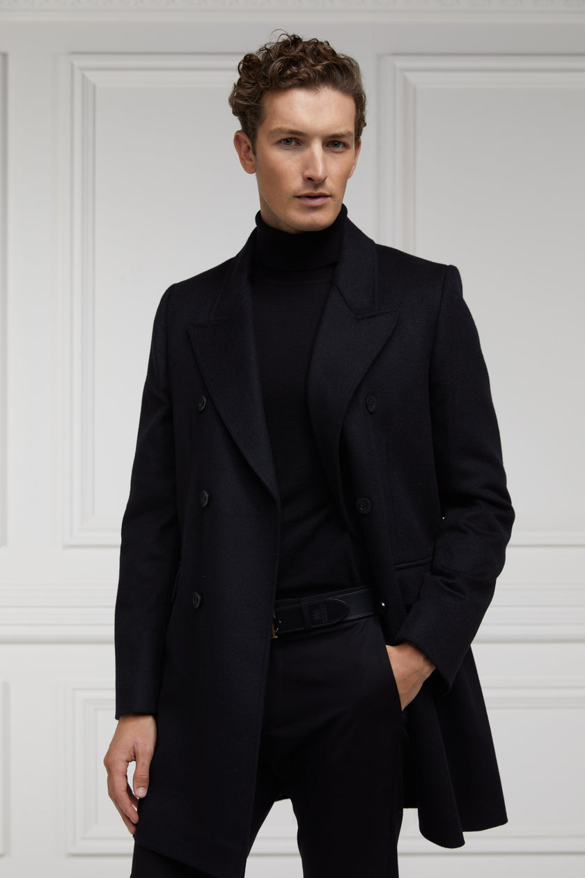 Hand crafted in the UK using the finest wools and meticulously tailored for a crisp, clean appearance, the Double Breasted Coat is the epitome of classic tailoring. With a mid-length silhouette and double breasted, button closure, this coat is framed by slightly padded shoulders for a sharp fit. Tailored with articulated sleeves and classic notch lapels, the double-welt pocket detail has been elevated with a mock horn button closure. Finished with a contrasting under collar for a statement wear with practical chain hanger loop on the inside.
