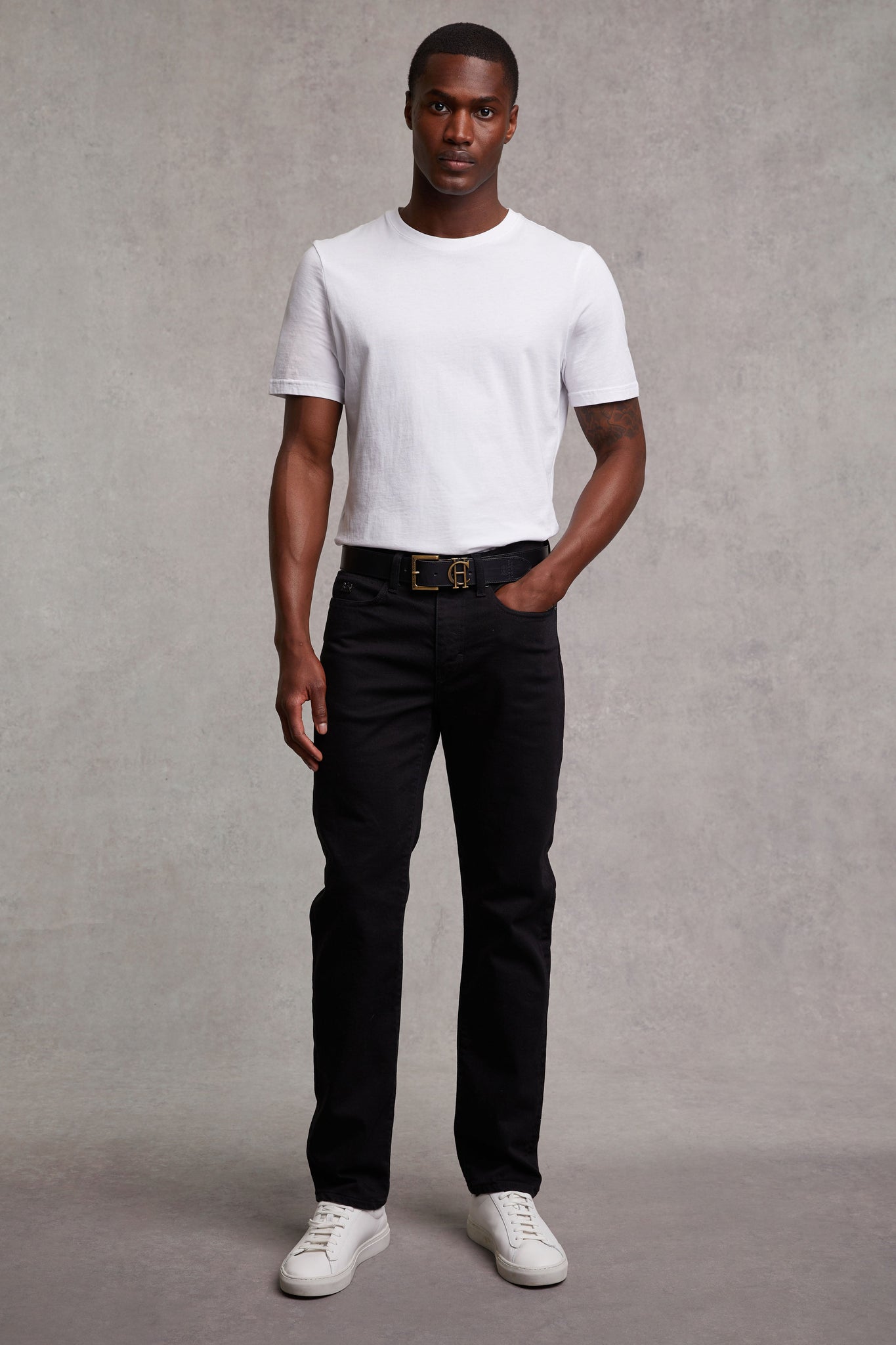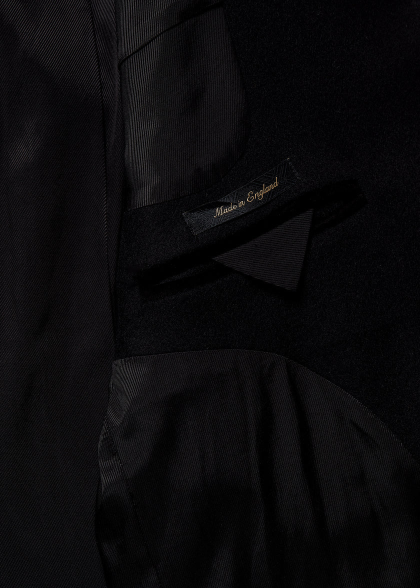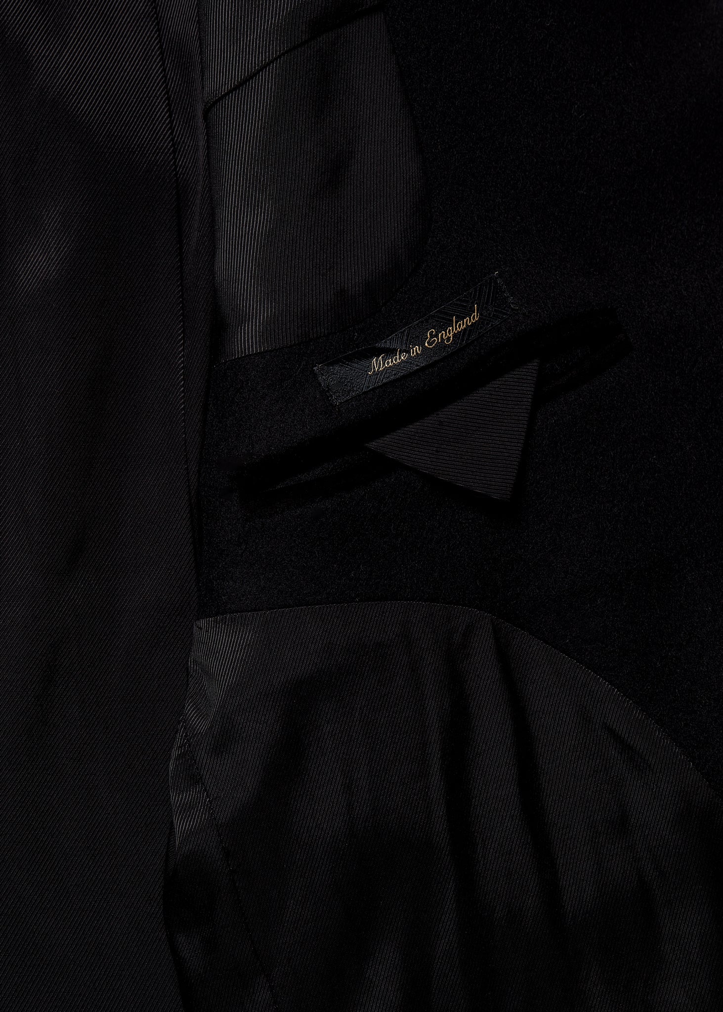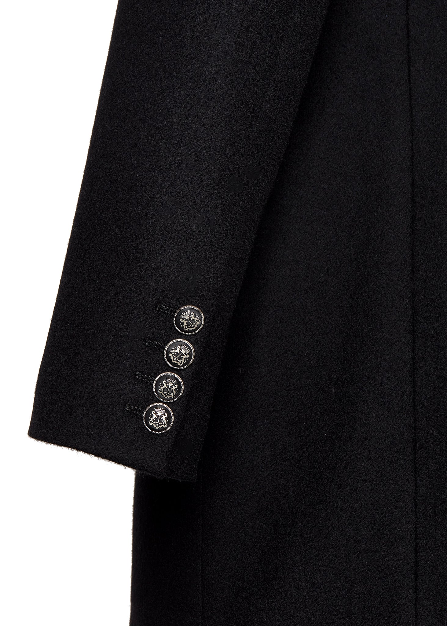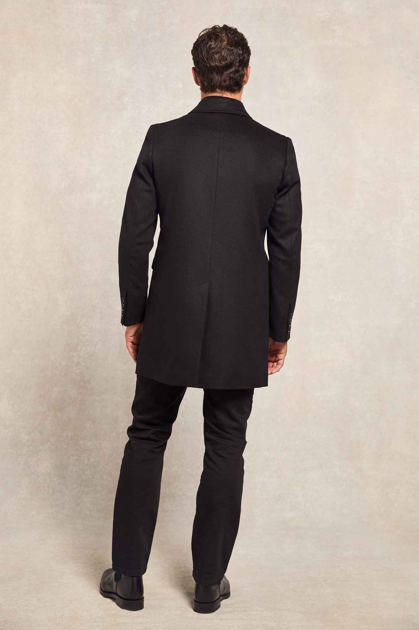 Hand crafted in the UK using the finest wools and meticulously tailored for a crisp, clean appearance, the Double Breasted Coat is the epitome of classic tailoring. With a mid-length silhouette and double breasted, button closure, this coat is framed by slightly padded shoulders for a sharp fit. Tailored with articulated sleeves and classic notch lapels, the double-welt pocket detail has been elevated with a mock horn button closure. Finished with a contrasting under collar for a statement wear with practical chain hanger loop on the inside.