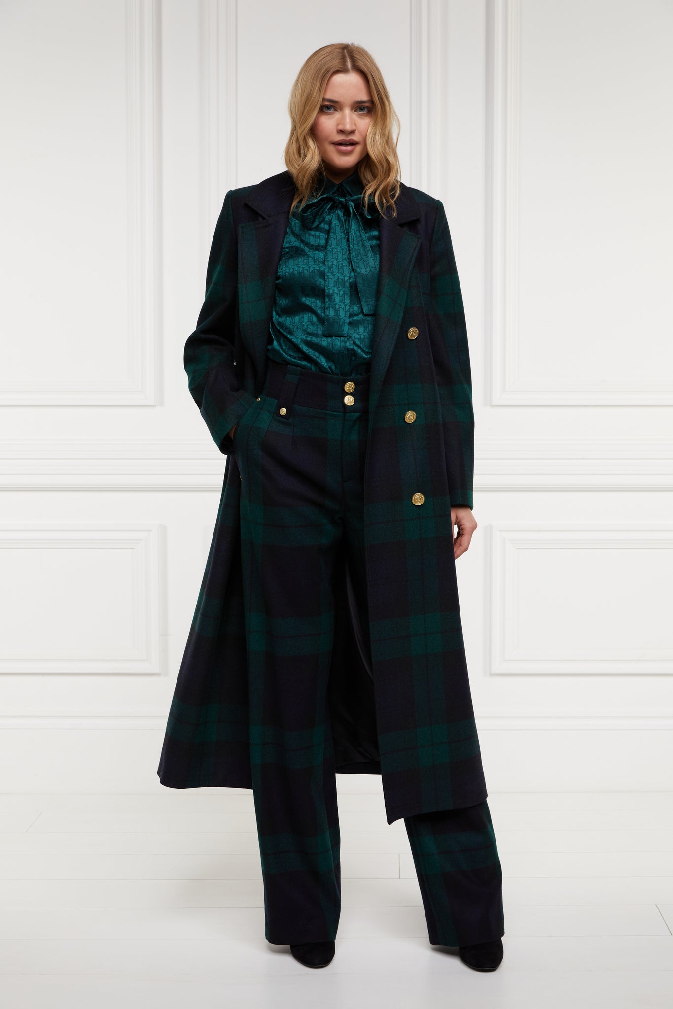 Simple and refined, these straight-leg trousers are the perfect balance of smart casual that effortlessly take you from day to night. Made from a luxurious wool blend that's fully lined, these trousers sit high on the waist with a wide waistband to create a flattering silhouette that suits all body shapes. Featuring two large side pockets and adorned with our iconic gold hardware for an added touch of luxury. These trousers have been hand cut and made in England using wool woven in the UK.