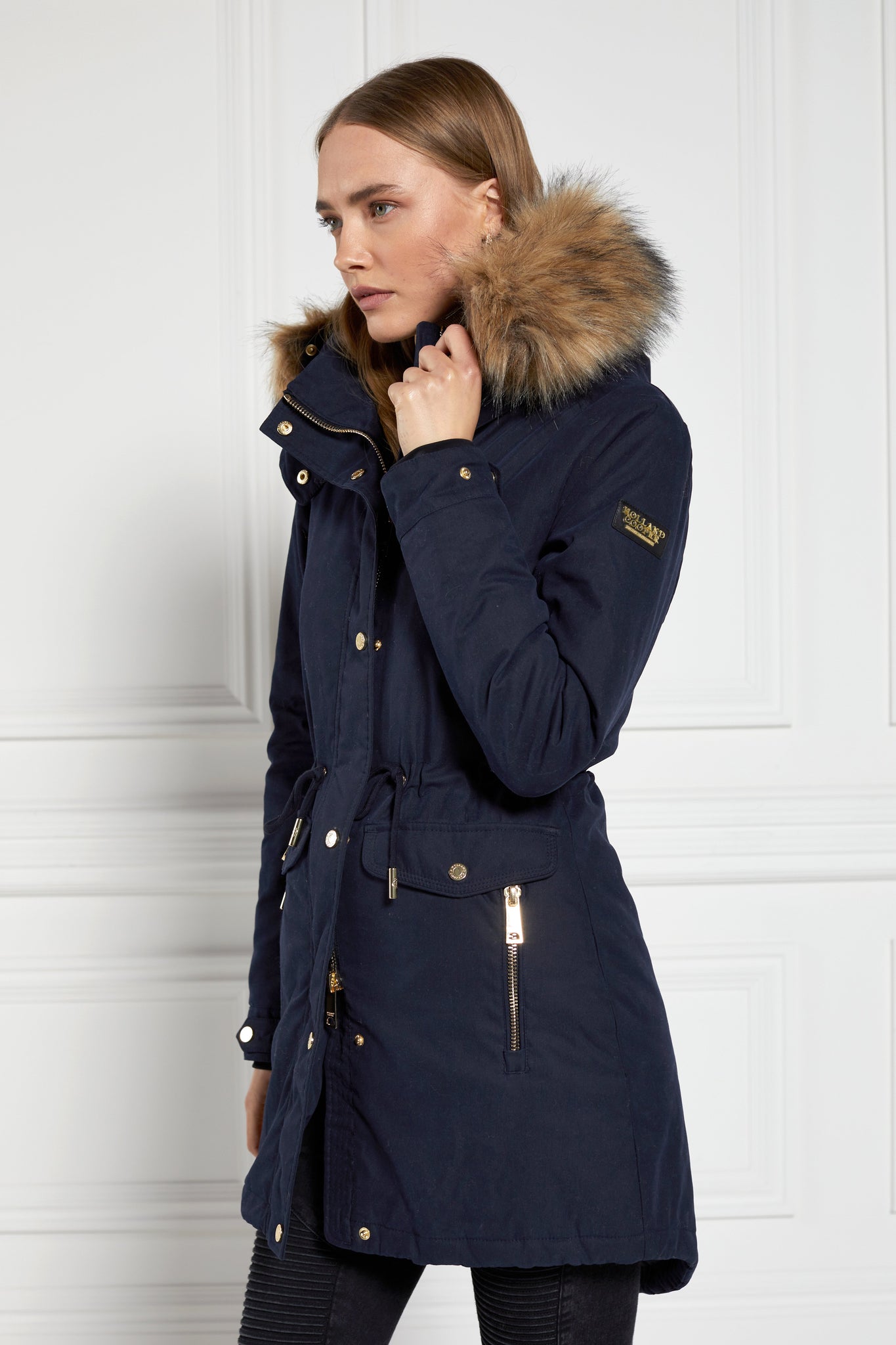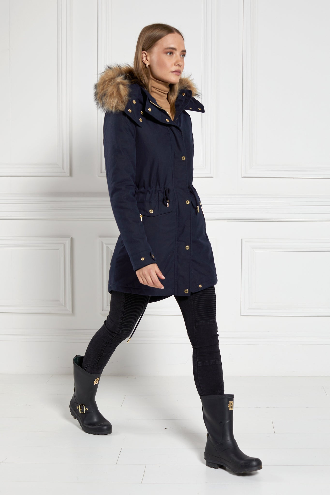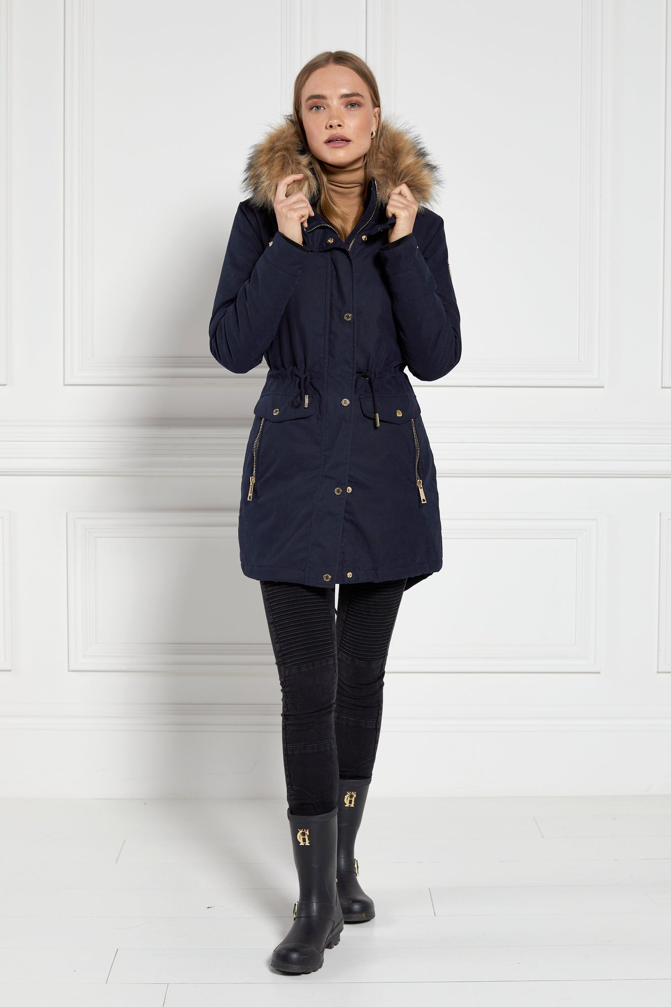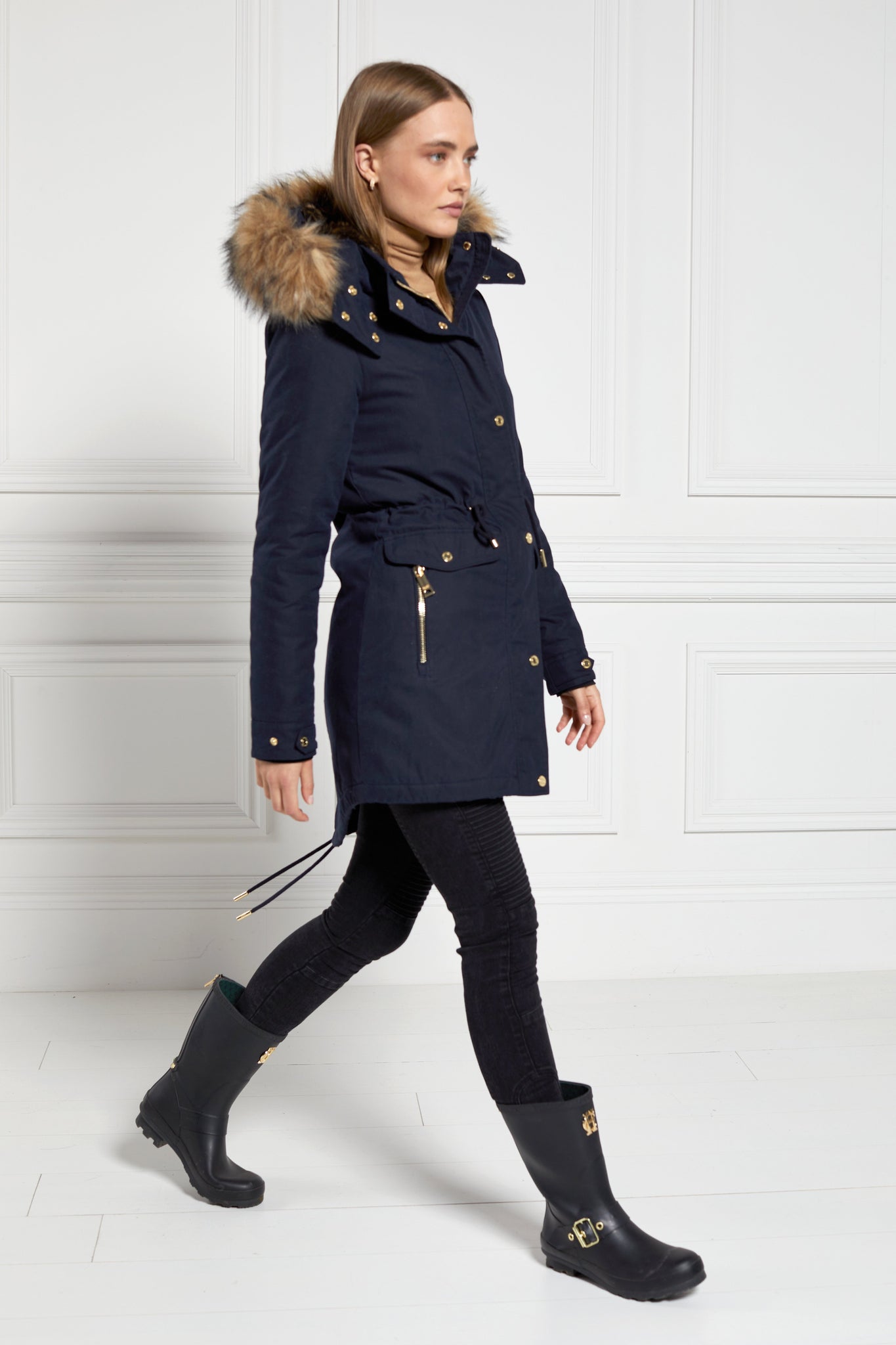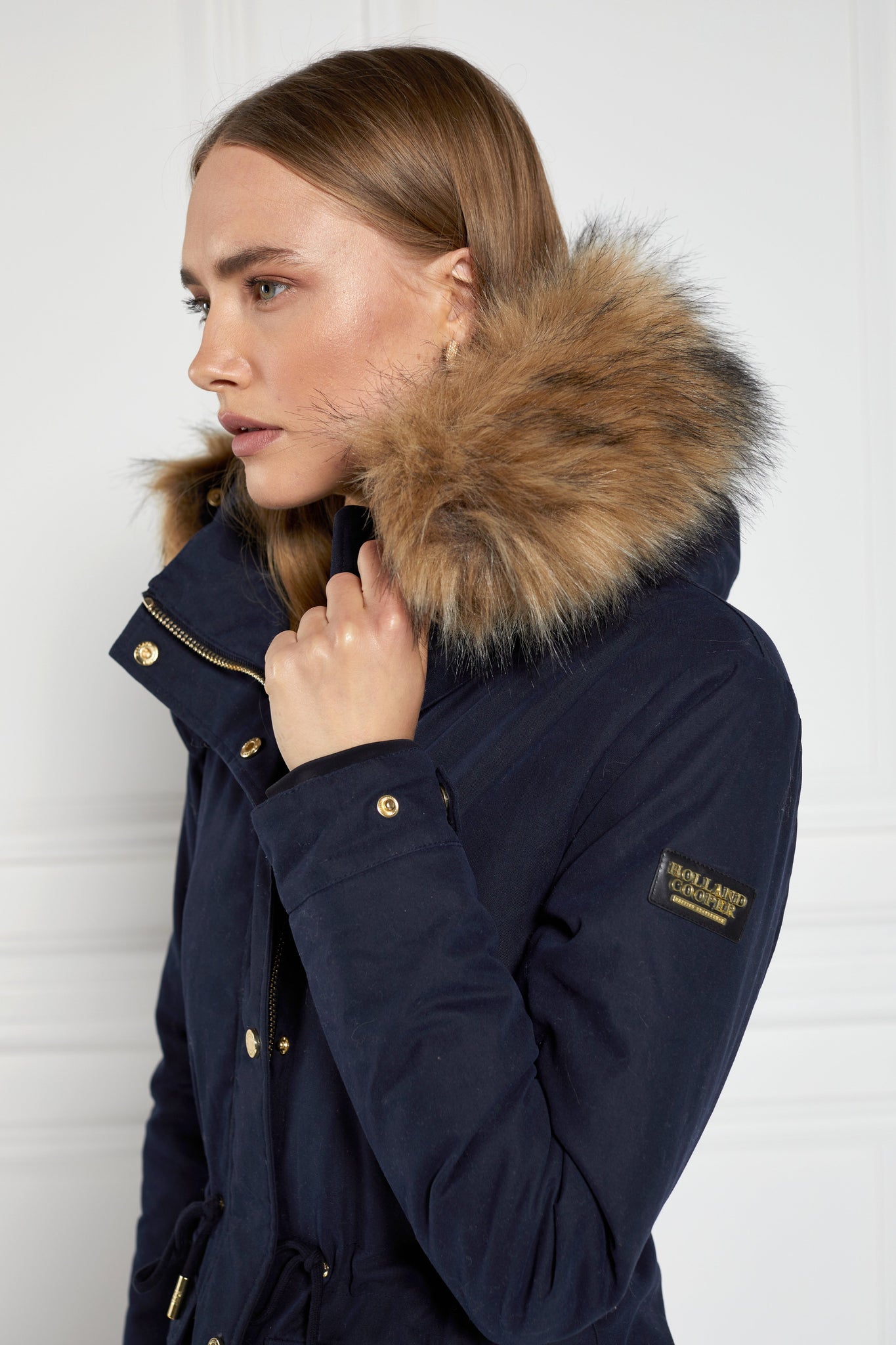 The Montana Parka jacket combines classic fishtail styling. Cutting-edge eco Sonora® fill and heritage wax-coated cotton provides durability, wind and water resistance. Finished with a beautiful faux fur lining to the hood and signature HC faux fur trim and completed with iconic Holland Cooper metal hardware and diamond-quilted lining with a crest design. This is a perfect autumn/winter staple for every wardrobe.