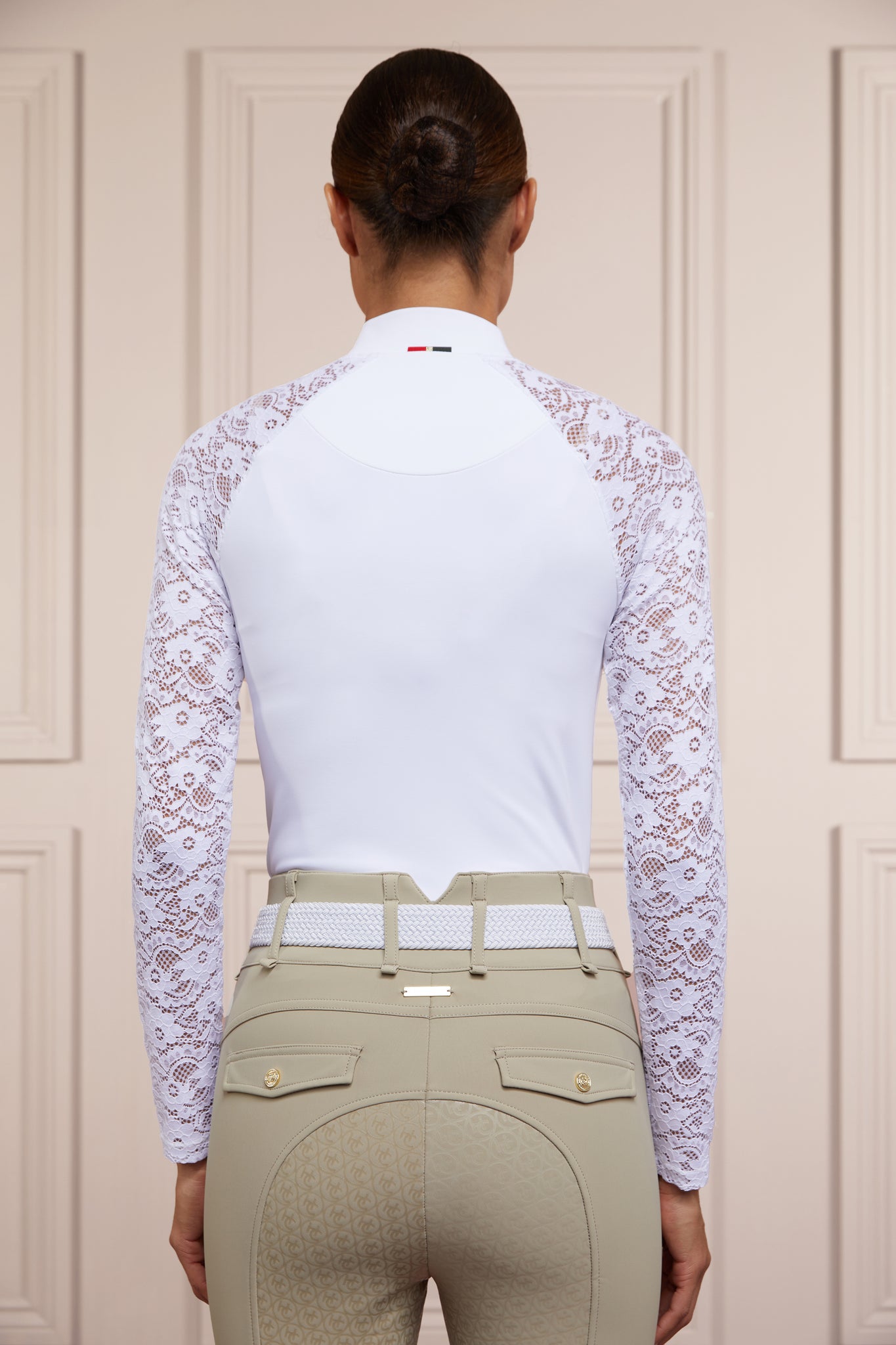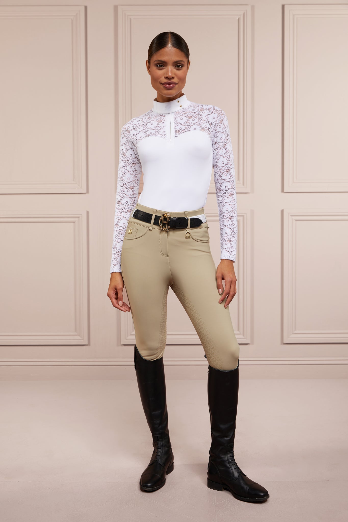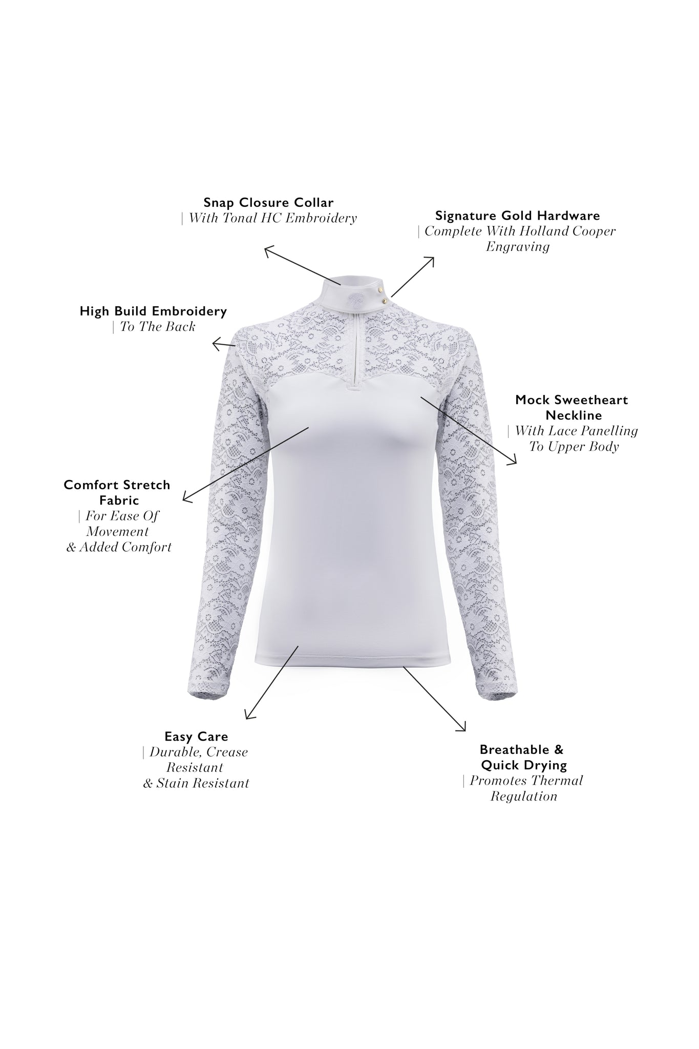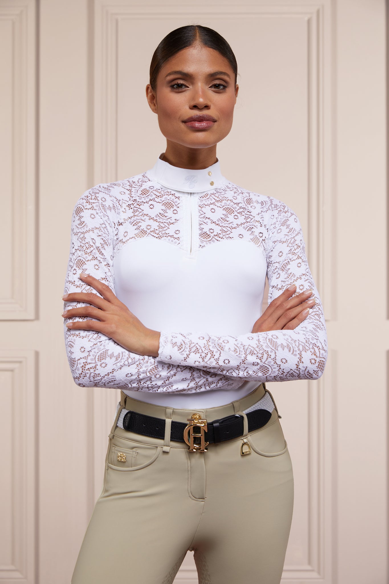 Expertly crafted with all riders in mind, this base layer has been designed with a thermal regulating fabric and super soft touch to ensure breathability and comfort at all times. The elegant lace long sleeves makes this piece both practical and stylish. Featuring a snap closure collar with tonal Holland Cooper embroidery.