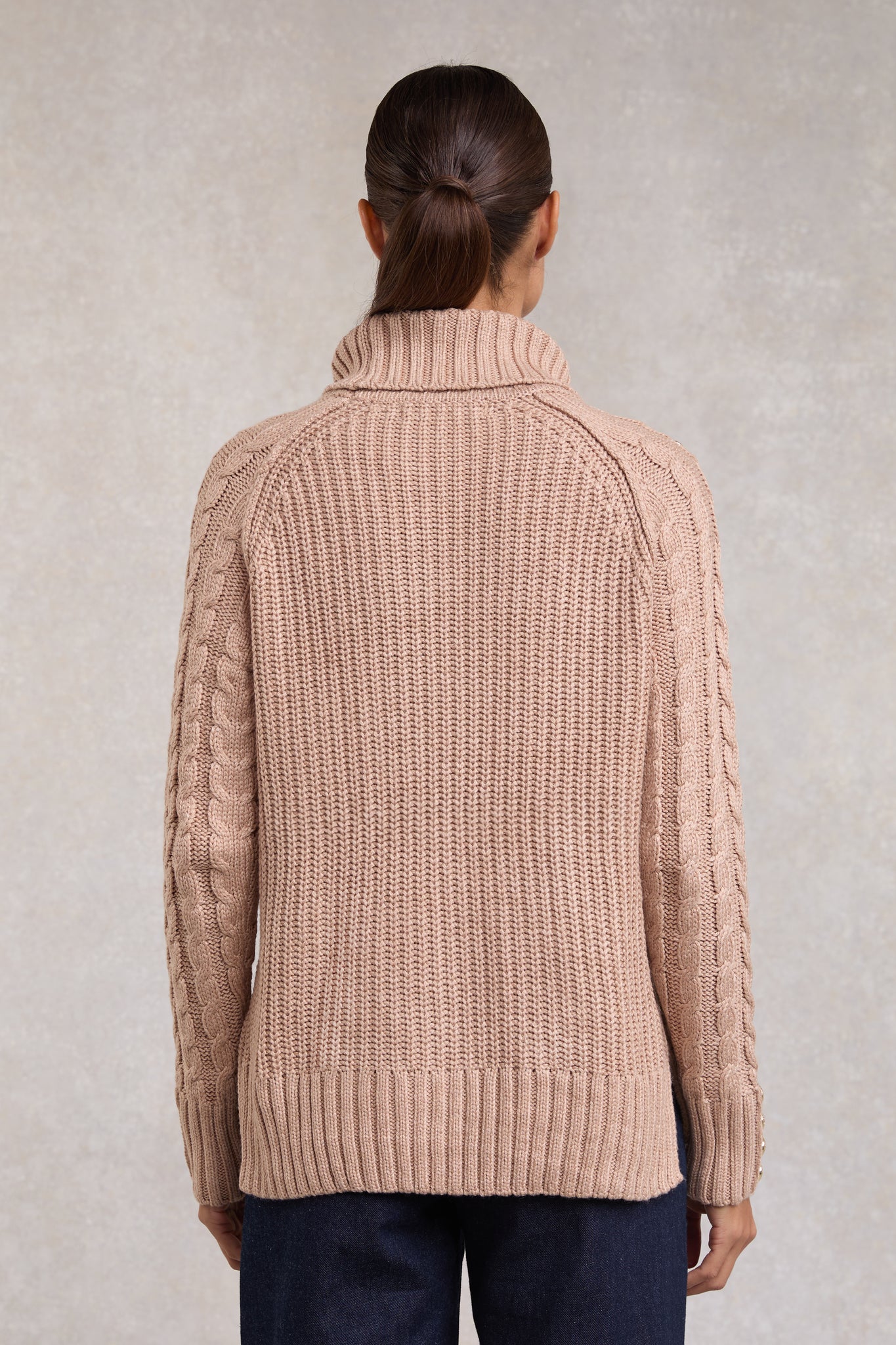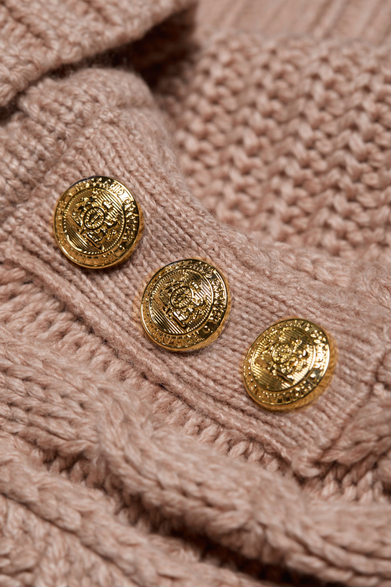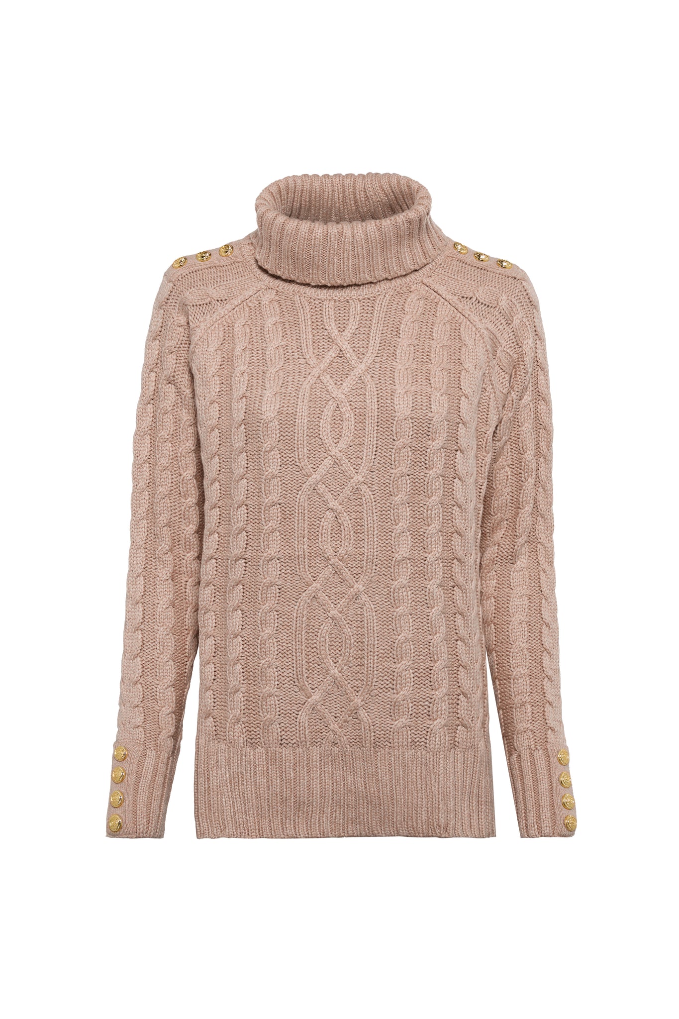 Crafted from sumptuously soft yarns with a modern cable knit design, relaxed fit with raglan shoulder makes for a contemporary look & feel. Elevated with our signature gold rivets on the cuffs and HC hardware to the collar.