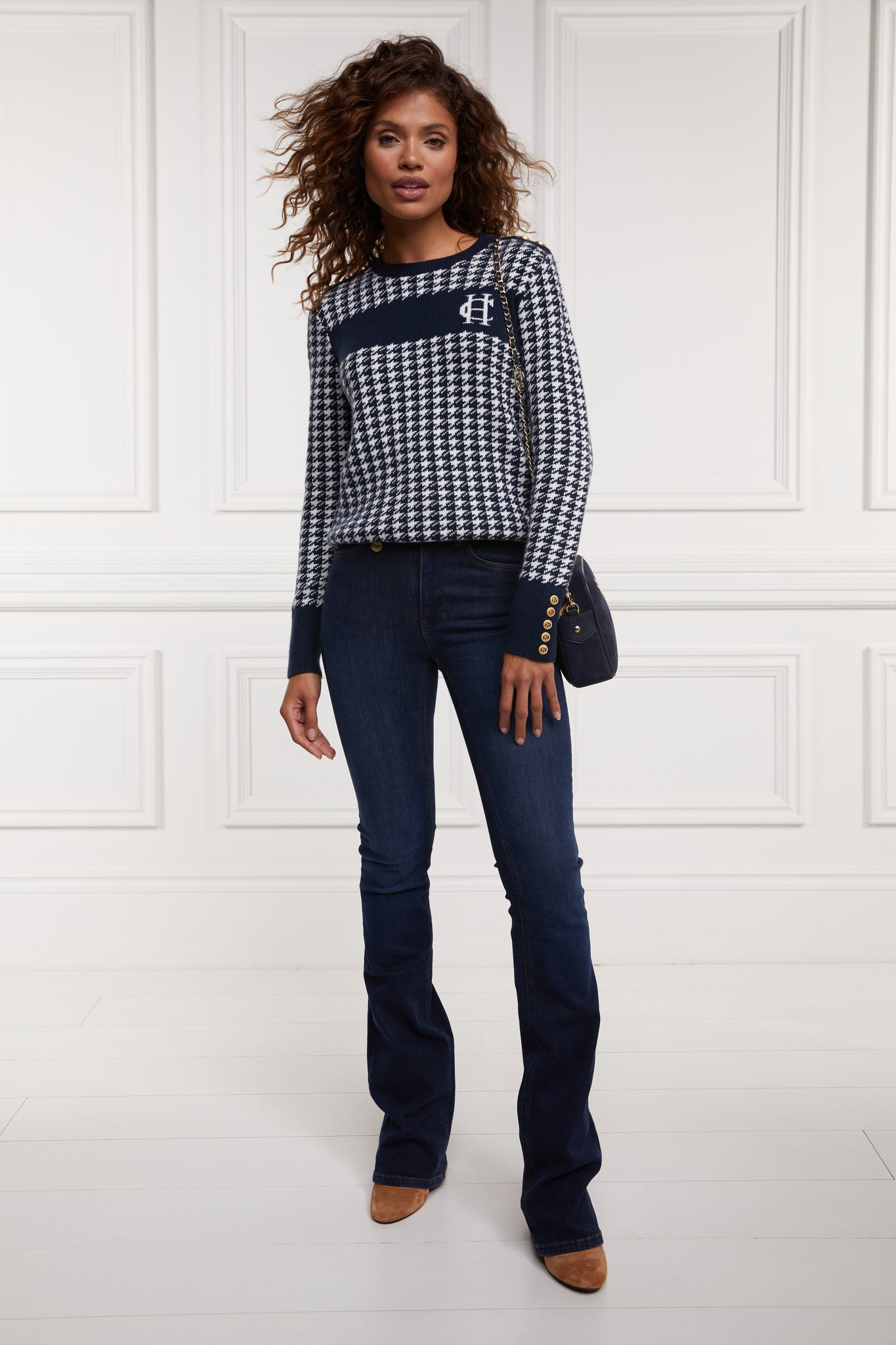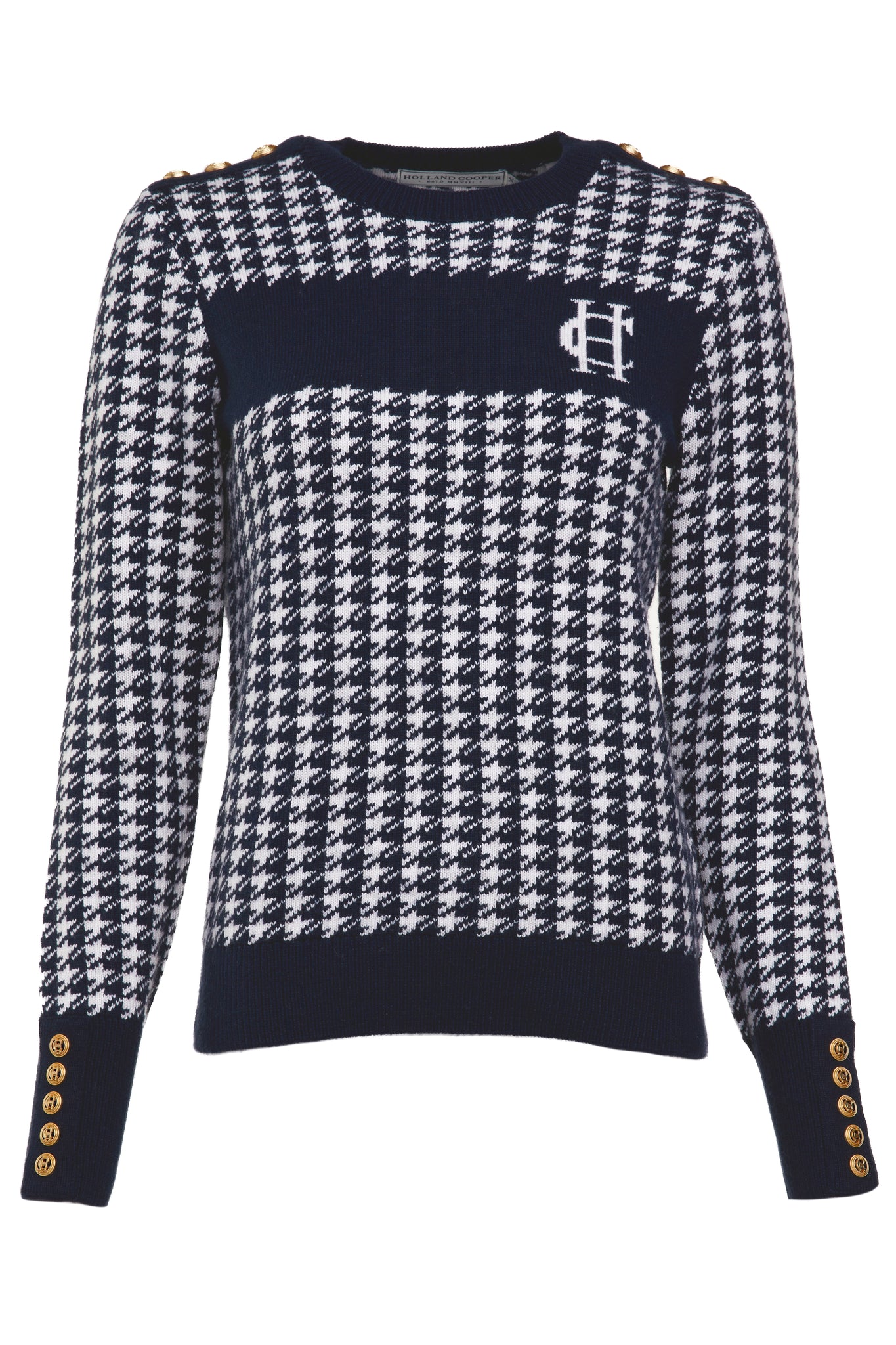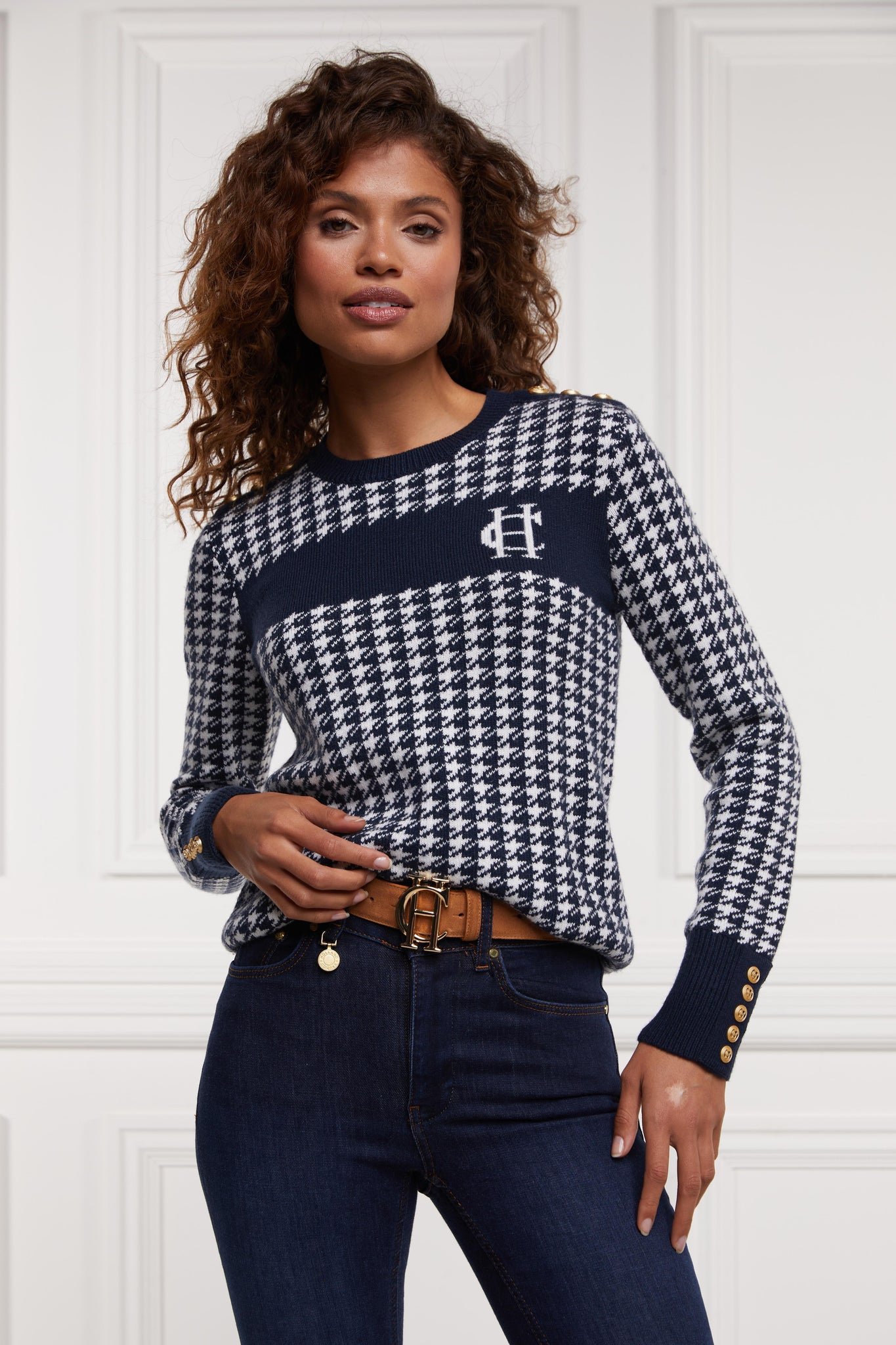 Designed with a slim fit, our Panel crew neck knit is made from sumptuously soft wool with a classic crew neck. With a striking camel houndstooth pattern to the body and panel across the chest featuring our signature HC anagram, this knit is perfectly paired with our Jodhpur jeans for an everyday look.