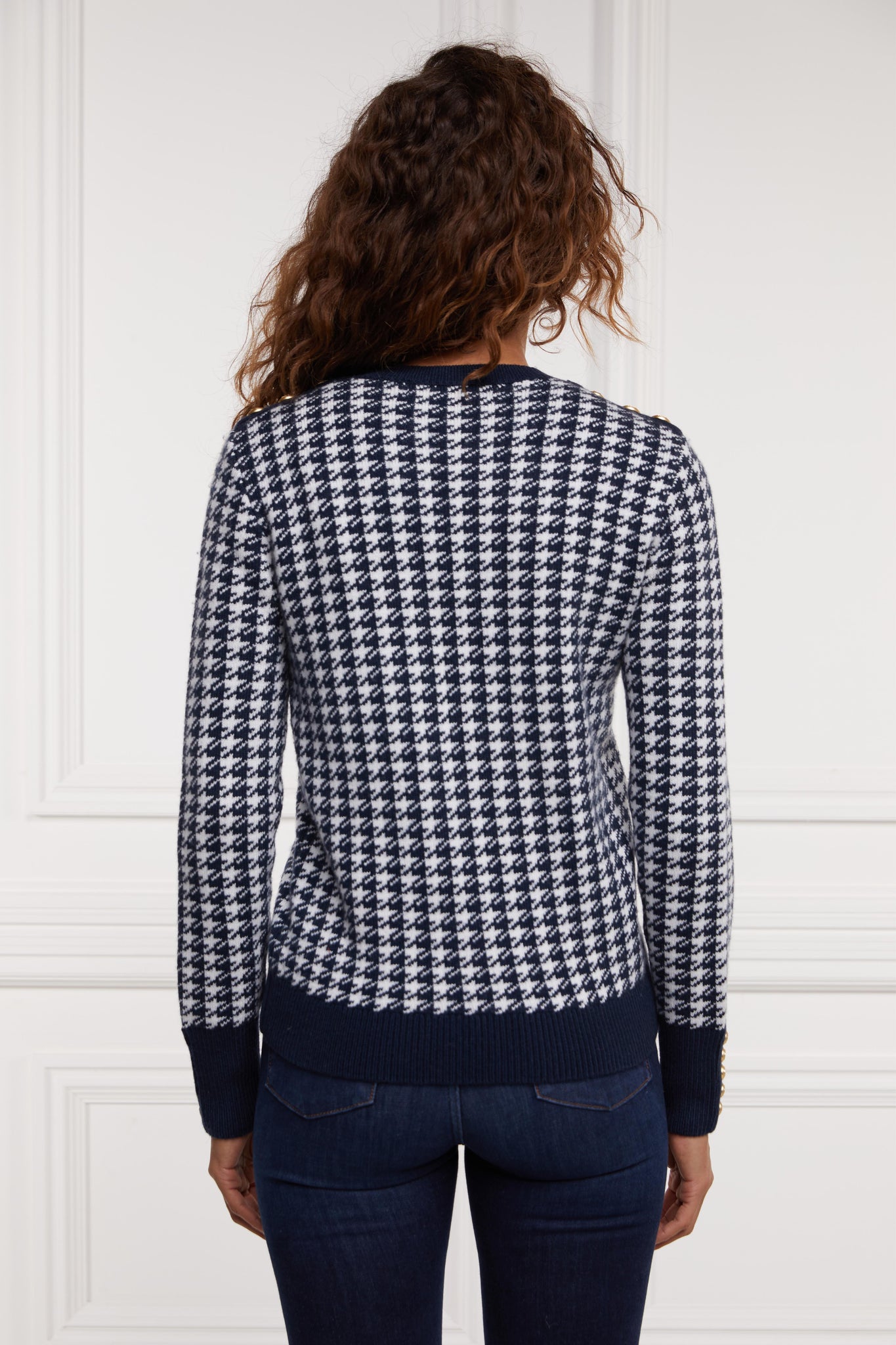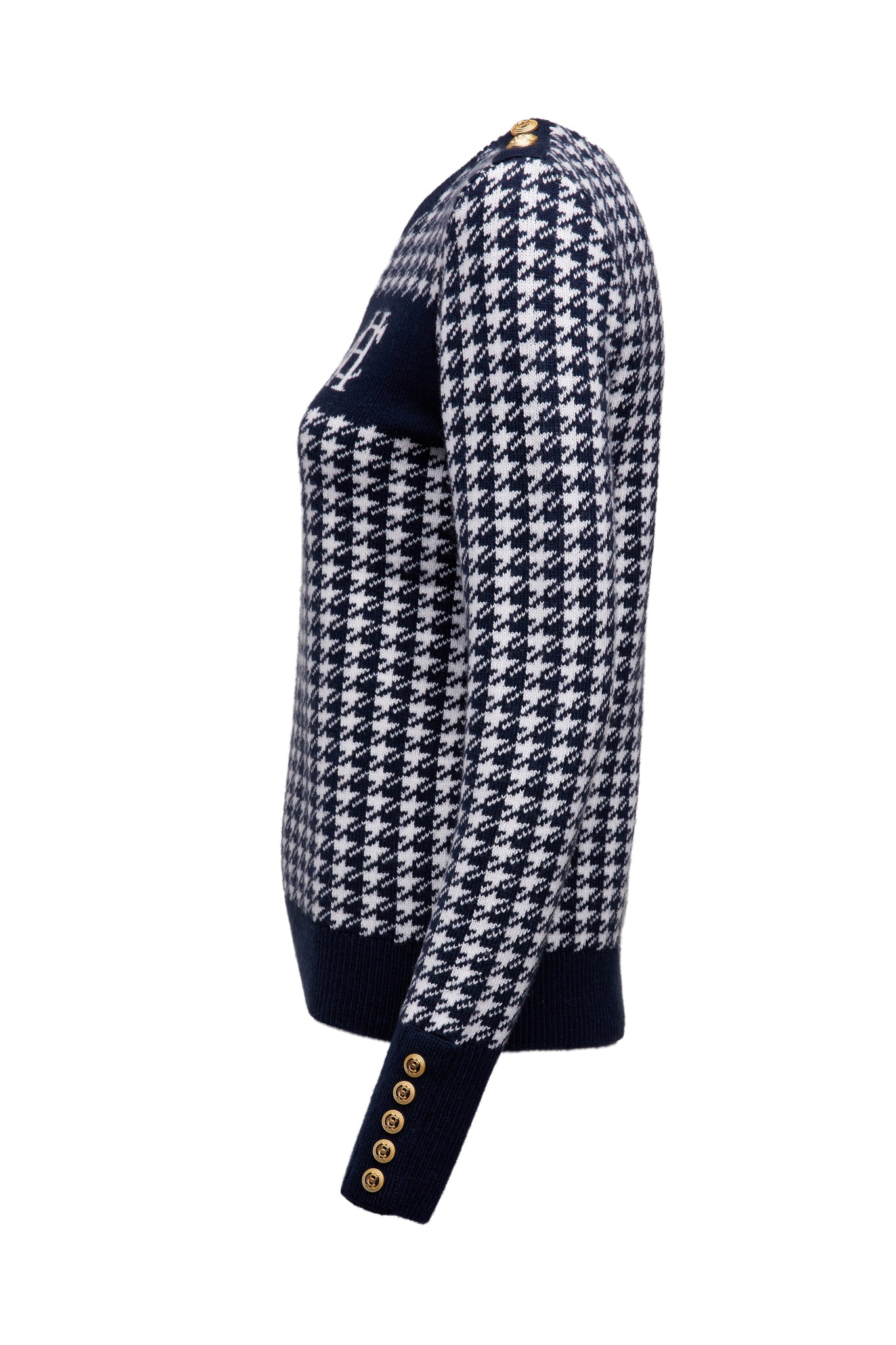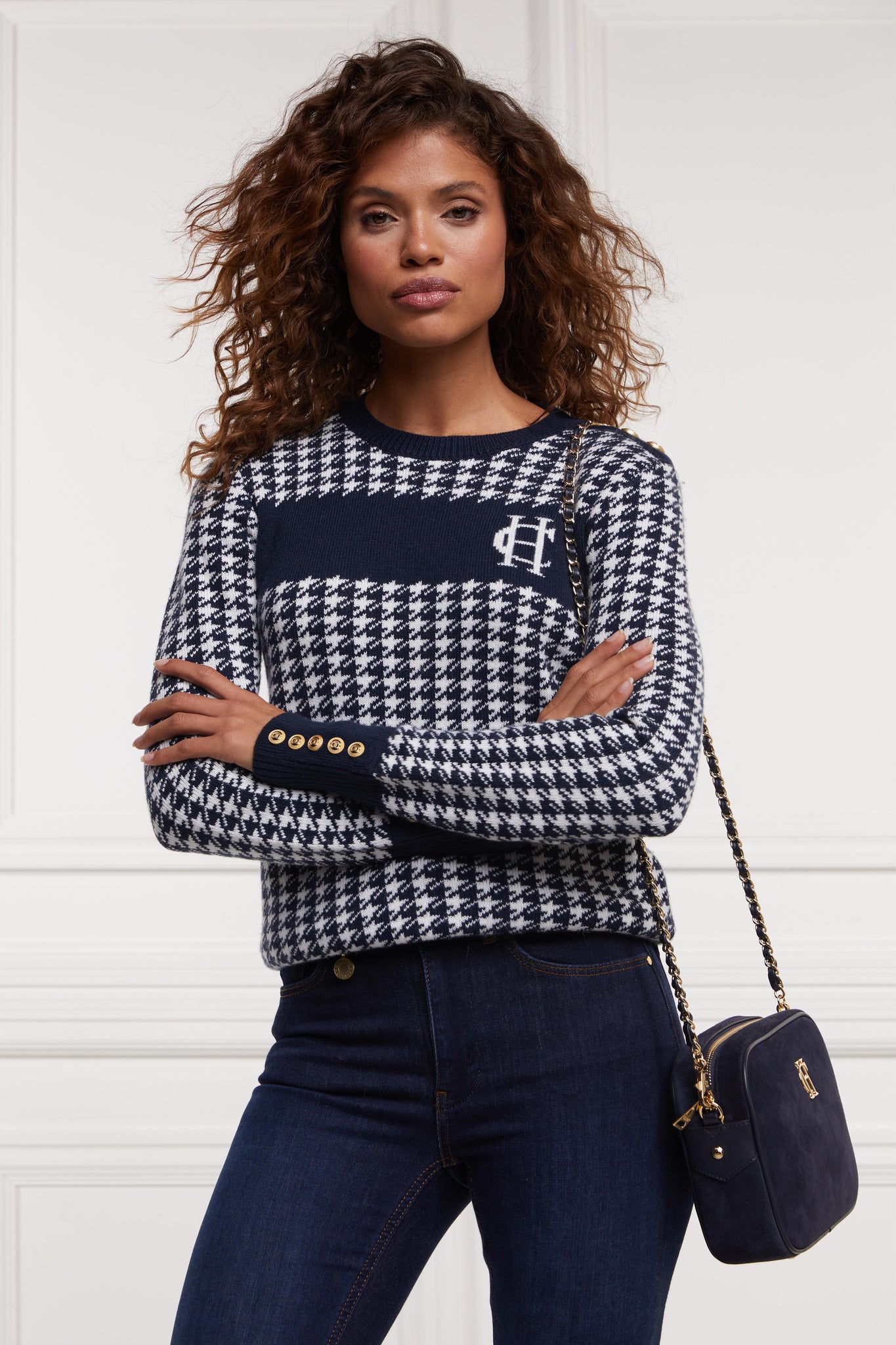 Designed with a slim fit, our Panel crew neck knit is made from sumptuously soft wool with a classic crew neck. With a striking camel houndstooth pattern to the body and panel across the chest featuring our signature HC anagram, this knit is perfectly paired with our Jodhpur jeans for an everyday look.