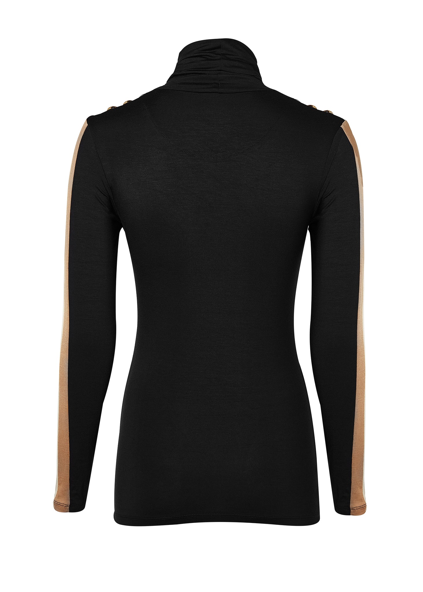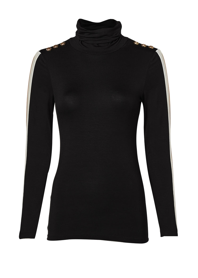 Crafted from superior knitted viscose for a luxurious feel, this roll neck has been designed to become an elevated building block in every womans wardrobe. Adorned with HC crested rivets on the shoulders, it exudes sophistication. The super soft fabric ensures comfort and warmth, while the contrast panel running down the sleeve adds a touch of modern flair.